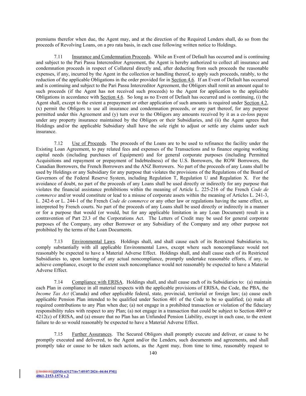 premiums therefor when due, the Agent may, and at the direction of the Required Lenders shall, do so from the proceeds of Revolving Loans, on a pro rata basis, in each case following written notice to Holdings. 7.11 Insurance and Condemnation Proceeds. While an Event of Default has occurred and is continuing and subject to the Pari Passu Intercreditor Agreement, the Agent is hereby authorized to collect all insurance and condemnation proceeds in respect of Collateral directly and, after deducting from such proceeds the reasonable expenses, if any, incurred by the Agent in the collection or handling thereof, to apply such proceeds, ratably, to the reduction of the applicable Obligations in the order provided for in Section 4.6. If an Event of Default has occurred and is continuing and subject to the Pari Passu Intercreditor Agreement, the Obligors shall remit an amount equal to such proceeds (if the Agent has not received such proceeds) to the Agent for application to the applicable Obligations in accordance with Section 4.6. So long as no Event of Default has occurred and is continuing, (i) the Agent shall, except to the extent a prepayment or other application of such amounts is required under Section 4.2, (x) permit the Obligors to use all insurance and condemnation proceeds, or any part thereof, for any purpose permitted under this Agreement and (y) turn over to the Obligors any amounts received by it as a co-loss payee under any property insurance maintained by the Obligors or their Subsidiaries, and (ii) the Agent agrees that Holdings and/or the applicable Subsidiary shall have the sole right to adjust or settle any claims under such insurance. 7.12 Use of Proceeds. The proceeds of the Loans are to be used to refinance the facility under the Existing Loan Agreement, to pay related fees and expenses of the Transactions and to finance ongoing working capital needs (including purchases of Equipment) and for general corporate purposes (including Permitted Acquisitions and repayment or prepayment of Indebtedness) of the U.S. Borrowers, the ROW Borrowers, the Canadian Borrowers, the French Borrowers and the ANZ Borrowers. No part of the proceeds of any Loans shall be used by Holdings or any Subsidiary for any purpose that violates the provisions of the Regulations of the Board of Governors of the Federal Reserve System, including Regulation T, Regulation U and Regulation X. For the avoidance of doubt, no part of the proceeds of any Loans shall be used directly or indirectly for any purpose that violates the financial assistance prohibitions within the meaning of Article L. 225-216 of the French Code de commerce and/or would constitute or lead to a misuse of corporate assets within the meaning of Articles L. 241-3, L. 242-6 or L. 244-1 of the French Code de commerce or any other law or regulations having the same effect, as interpreted by French courts. No part of the proceeds of any Loans shall be used directly or indirectly in a manner or for a purpose that would (or would, but for any applicable limitation in any Loan Document) result in a contravention of Part 2J.3 of the Corporations Act. The Letters of Credit may be used for general corporate purposes of the Company, any other Borrower or any Subsidiary of the Company and any other purpose not prohibited by the terms of the Loan Documents. 7.13 Environmental Laws. Holdings shall, and shall cause each of its Restricted Subsidiaries to, comply substantially with all applicable Environmental Laws, except where such noncompliance would not reasonably be expected to have a Material Adverse Effect. Holdings shall, and shall cause each of its Restricted Subsidiaries to, upon learning of any actual noncompliance, promptly undertake reasonable efforts, if any, to achieve compliance, except to the extent such noncompliance would not reasonably be expected to have a Material Adverse Effect. 7.14 Compliance with ERISA. Holdings shall, and shall cause each of its Subsidiaries to: (a) maintain each Plan in compliance in all material respects with the applicable provisions of ERISA, the Code, the PBA, the Income Tax Act (Canada) and other applicable federal, state, provincial, territorial or foreign law; (a) cause each applicable Pension Plan intended to be qualified under Section 401 of the Code to be so qualified; (a) make all required contributions to any Plan when due; (a) not engage in a prohibited transaction or violation of the fiduciary responsibility rules with respect to any Plan; (a) not engage in a transaction that could be subject to Section 4069 or 4212(c) of ERISA, and (a) ensure that no Plan has an Unfunded Pension Liability, except in each case, to the extent failure to do so would reasonably be expected to have a Material Adverse Effect. 7.15 Further Assurances. The Secured Obligors shall promptly execute and deliver, or cause to be promptly executed and delivered, to the Agent and/or the Lenders, such documents and agreements, and shall promptly take or cause to be taken such actions, as the Agent may, from time to time, reasonably request to 140 [[5848018]][[DMS:6312716v7:05/07/2024--04:04 PM]] 4861-2153-1574 v.2