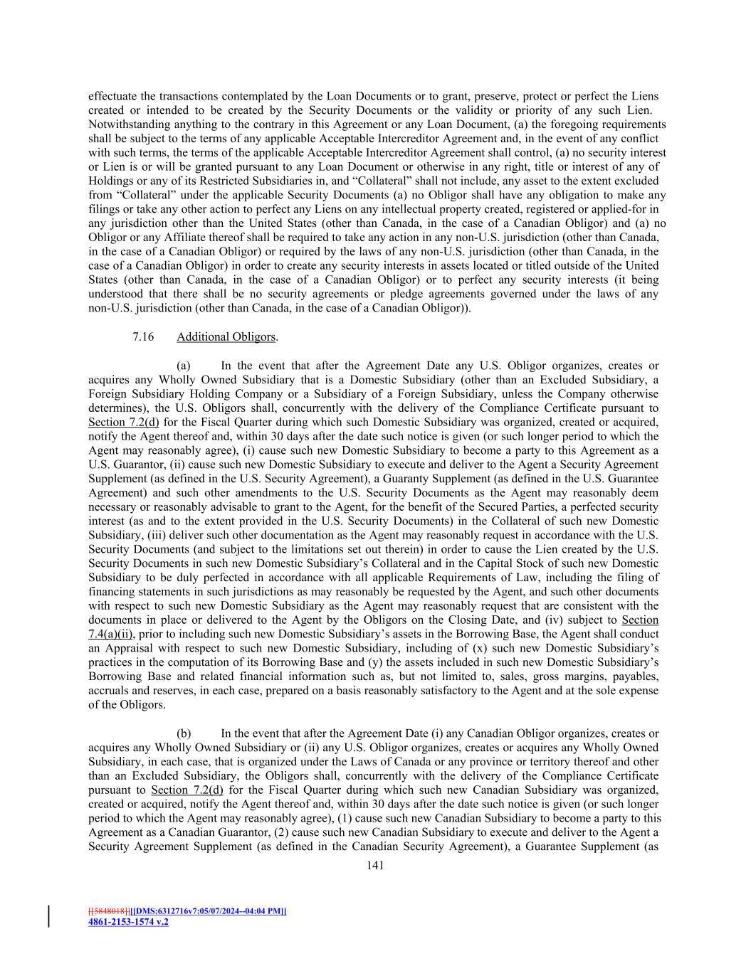 effectuate the transactions contemplated by the Loan Documents or to grant, preserve, protect or perfect the Liens created or intended to be created by the Security Documents or the validity or priority of any such Lien. Notwithstanding anything to the contrary in this Agreement or any Loan Document, (a) the foregoing requirements shall be subject to the terms of any applicable Acceptable Intercreditor Agreement and, in the event of any conflict with such terms, the terms of the applicable Acceptable Intercreditor Agreement shall control, (a) no security interest or Lien is or will be granted pursuant to any Loan Document or otherwise in any right, title or interest of any of Holdings or any of its Restricted Subsidiaries in, and “Collateral” shall not include, any asset to the extent excluded from “Collateral” under the applicable Security Documents (a) no Obligor shall have any obligation to make any filings or take any other action to perfect any Liens on any intellectual property created, registered or applied-for in any jurisdiction other than the United States (other than Canada, in the case of a Canadian Obligor) and (a) no Obligor or any Affiliate thereof shall be required to take any action in any non-U.S. jurisdiction (other than Canada, in the case of a Canadian Obligor) or required by the laws of any non-U.S. jurisdiction (other than Canada, in the case of a Canadian Obligor) in order to create any security interests in assets located or titled outside of the United States (other than Canada, in the case of a Canadian Obligor) or to perfect any security interests (it being understood that there shall be no security agreements or pledge agreements governed under the laws of any non-U.S. jurisdiction (other than Canada, in the case of a Canadian Obligor)). 7.16 Additional Obligors. (a) In the event that after the Agreement Date any U.S. Obligor organizes, creates or acquires any Wholly Owned Subsidiary that is a Domestic Subsidiary (other than an Excluded Subsidiary, a Foreign Subsidiary Holding Company or a Subsidiary of a Foreign Subsidiary, unless the Company otherwise determines), the U.S. Obligors shall, concurrently with the delivery of the Compliance Certificate pursuant to Section 7.2(d) for the Fiscal Quarter during which such Domestic Subsidiary was organized, created or acquired, notify the Agent thereof and, within 30 days after the date such notice is given (or such longer period to which the Agent may reasonably agree), (i) cause such new Domestic Subsidiary to become a party to this Agreement as a U.S. Guarantor, (ii) cause such new Domestic Subsidiary to execute and deliver to the Agent a Security Agreement Supplement (as defined in the U.S. Security Agreement), a Guaranty Supplement (as defined in the U.S. Guarantee Agreement) and such other amendments to the U.S. Security Documents as the Agent may reasonably deem necessary or reasonably advisable to grant to the Agent, for the benefit of the Secured Parties, a perfected security interest (as and to the extent provided in the U.S. Security Documents) in the Collateral of such new Domestic Subsidiary, (iii) deliver such other documentation as the Agent may reasonably request in accordance with the U.S. Security Documents (and subject to the limitations set out therein) in order to cause the Lien created by the U.S. Security Documents in such new Domestic Subsidiary’s Collateral and in the Capital Stock of such new Domestic Subsidiary to be duly perfected in accordance with all applicable Requirements of Law, including the filing of financing statements in such jurisdictions as may reasonably be requested by the Agent, and such other documents with respect to such new Domestic Subsidiary as the Agent may reasonably request that are consistent with the documents in place or delivered to the Agent by the Obligors on the Closing Date, and (iv) subject to Section 7.4(a)(ii), prior to including such new Domestic Subsidiary’s assets in the Borrowing Base, the Agent shall conduct an Appraisal with respect to such new Domestic Subsidiary, including of (x) such new Domestic Subsidiary’s practices in the computation of its Borrowing Base and (y) the assets included in such new Domestic Subsidiary’s Borrowing Base and related financial information such as, but not limited to, sales, gross margins, payables, accruals and reserves, in each case, prepared on a basis reasonably satisfactory to the Agent and at the sole expense of the Obligors. (b) In the event that after the Agreement Date (i) any Canadian Obligor organizes, creates or acquires any Wholly Owned Subsidiary or (ii) any U.S. Obligor organizes, creates or acquires any Wholly Owned Subsidiary, in each case, that is organized under the Laws of Canada or any province or territory thereof and other than an Excluded Subsidiary, the Obligors shall, concurrently with the delivery of the Compliance Certificate pursuant to Section 7.2(d) for the Fiscal Quarter during which such new Canadian Subsidiary was organized, created or acquired, notify the Agent thereof and, within 30 days after the date such notice is given (or such longer period to which the Agent may reasonably agree), (1) cause such new Canadian Subsidiary to become a party to this Agreement as a Canadian Guarantor, (2) cause such new Canadian Subsidiary to execute and deliver to the Agent a Security Agreement Supplement (as defined in the Canadian Security Agreement), a Guarantee Supplement (as 141 [[5848018]][[DMS:6312716v7:05/07/2024--04:04 PM]] 4861-2153-1574 v.2