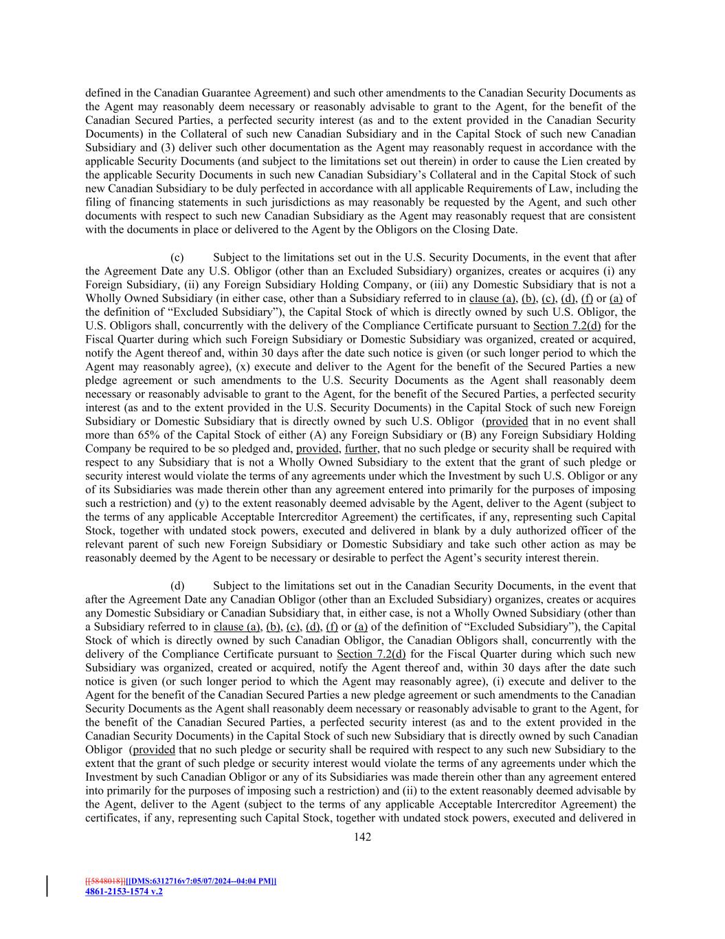 defined in the Canadian Guarantee Agreement) and such other amendments to the Canadian Security Documents as the Agent may reasonably deem necessary or reasonably advisable to grant to the Agent, for the benefit of the Canadian Secured Parties, a perfected security interest (as and to the extent provided in the Canadian Security Documents) in the Collateral of such new Canadian Subsidiary and in the Capital Stock of such new Canadian Subsidiary and (3) deliver such other documentation as the Agent may reasonably request in accordance with the applicable Security Documents (and subject to the limitations set out therein) in order to cause the Lien created by the applicable Security Documents in such new Canadian Subsidiary’s Collateral and in the Capital Stock of such new Canadian Subsidiary to be duly perfected in accordance with all applicable Requirements of Law, including the filing of financing statements in such jurisdictions as may reasonably be requested by the Agent, and such other documents with respect to such new Canadian Subsidiary as the Agent may reasonably request that are consistent with the documents in place or delivered to the Agent by the Obligors on the Closing Date. (c) Subject to the limitations set out in the U.S. Security Documents, in the event that after the Agreement Date any U.S. Obligor (other than an Excluded Subsidiary) organizes, creates or acquires (i) any Foreign Subsidiary, (ii) any Foreign Subsidiary Holding Company, or (iii) any Domestic Subsidiary that is not a Wholly Owned Subsidiary (in either case, other than a Subsidiary referred to in clause (a), (b), (c), (d), (f) or (a) of the definition of “Excluded Subsidiary”), the Capital Stock of which is directly owned by such U.S. Obligor, the U.S. Obligors shall, concurrently with the delivery of the Compliance Certificate pursuant to Section 7.2(d) for the Fiscal Quarter during which such Foreign Subsidiary or Domestic Subsidiary was organized, created or acquired, notify the Agent thereof and, within 30 days after the date such notice is given (or such longer period to which the Agent may reasonably agree), (x) execute and deliver to the Agent for the benefit of the Secured Parties a new pledge agreement or such amendments to the U.S. Security Documents as the Agent shall reasonably deem necessary or reasonably advisable to grant to the Agent, for the benefit of the Secured Parties, a perfected security interest (as and to the extent provided in the U.S. Security Documents) in the Capital Stock of such new Foreign Subsidiary or Domestic Subsidiary that is directly owned by such U.S. Obligor (provided that in no event shall more than 65% of the Capital Stock of either (A) any Foreign Subsidiary or (B) any Foreign Subsidiary Holding Company be required to be so pledged and, provided, further, that no such pledge or security shall be required with respect to any Subsidiary that is not a Wholly Owned Subsidiary to the extent that the grant of such pledge or security interest would violate the terms of any agreements under which the Investment by such U.S. Obligor or any of its Subsidiaries was made therein other than any agreement entered into primarily for the purposes of imposing such a restriction) and (y) to the extent reasonably deemed advisable by the Agent, deliver to the Agent (subject to the terms of any applicable Acceptable Intercreditor Agreement) the certificates, if any, representing such Capital Stock, together with undated stock powers, executed and delivered in blank by a duly authorized officer of the relevant parent of such new Foreign Subsidiary or Domestic Subsidiary and take such other action as may be reasonably deemed by the Agent to be necessary or desirable to perfect the Agent’s security interest therein. (d) Subject to the limitations set out in the Canadian Security Documents, in the event that after the Agreement Date any Canadian Obligor (other than an Excluded Subsidiary) organizes, creates or acquires any Domestic Subsidiary or Canadian Subsidiary that, in either case, is not a Wholly Owned Subsidiary (other than a Subsidiary referred to in clause (a), (b), (c), (d), (f) or (a) of the definition of “Excluded Subsidiary”), the Capital Stock of which is directly owned by such Canadian Obligor, the Canadian Obligors shall, concurrently with the delivery of the Compliance Certificate pursuant to Section 7.2(d) for the Fiscal Quarter during which such new Subsidiary was organized, created or acquired, notify the Agent thereof and, within 30 days after the date such notice is given (or such longer period to which the Agent may reasonably agree), (i) execute and deliver to the Agent for the benefit of the Canadian Secured Parties a new pledge agreement or such amendments to the Canadian Security Documents as the Agent shall reasonably deem necessary or reasonably advisable to grant to the Agent, for the benefit of the Canadian Secured Parties, a perfected security interest (as and to the extent provided in the Canadian Security Documents) in the Capital Stock of such new Subsidiary that is directly owned by such Canadian Obligor (provided that no such pledge or security shall be required with respect to any such new Subsidiary to the extent that the grant of such pledge or security interest would violate the terms of any agreements under which the Investment by such Canadian Obligor or any of its Subsidiaries was made therein other than any agreement entered into primarily for the purposes of imposing such a restriction) and (ii) to the extent reasonably deemed advisable by the Agent, deliver to the Agent (subject to the terms of any applicable Acceptable Intercreditor Agreement) the certificates, if any, representing such Capital Stock, together with undated stock powers, executed and delivered in 142 [[5848018]][[DMS:6312716v7:05/07/2024--04:04 PM]] 4861-2153-1574 v.2