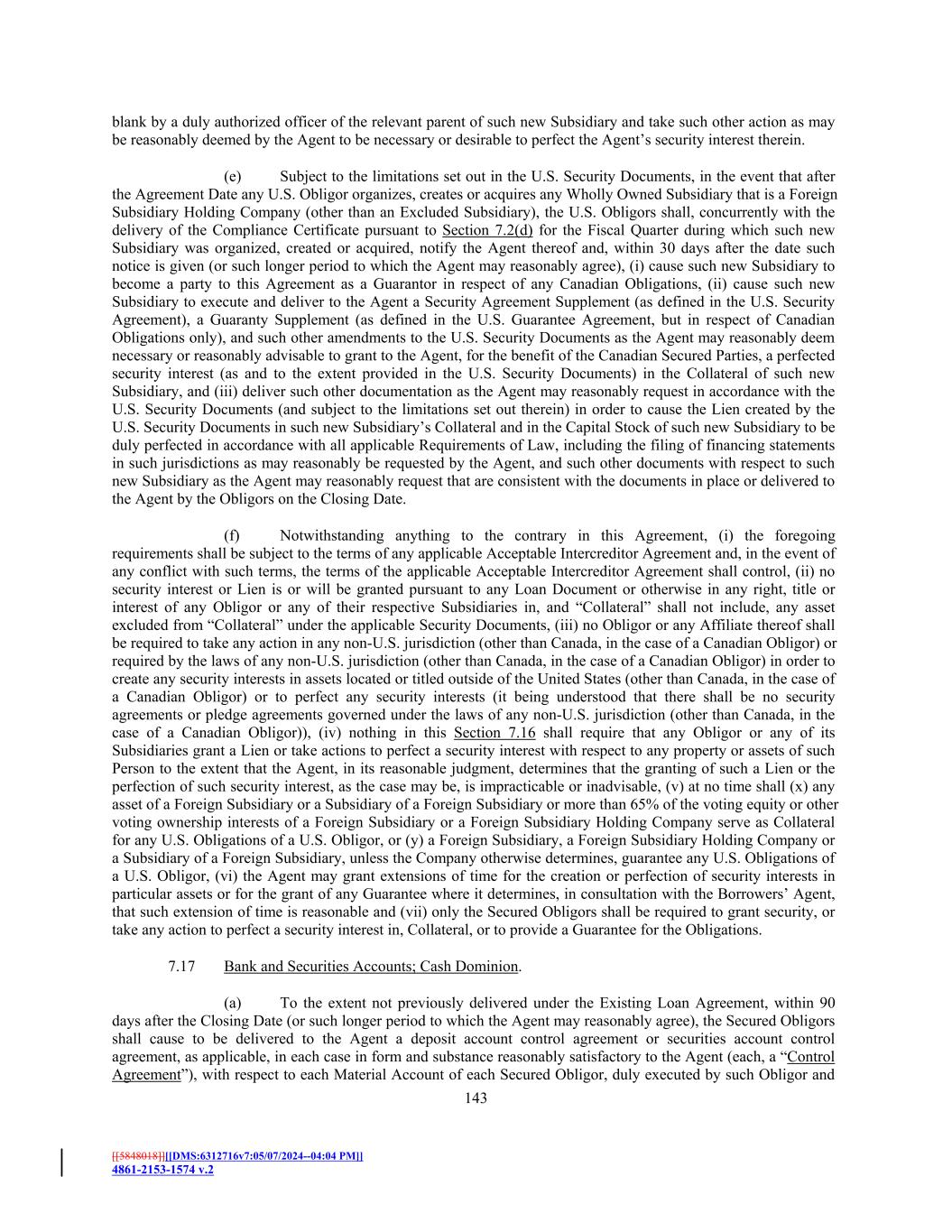 blank by a duly authorized officer of the relevant parent of such new Subsidiary and take such other action as may be reasonably deemed by the Agent to be necessary or desirable to perfect the Agent’s security interest therein. (e) Subject to the limitations set out in the U.S. Security Documents, in the event that after the Agreement Date any U.S. Obligor organizes, creates or acquires any Wholly Owned Subsidiary that is a Foreign Subsidiary Holding Company (other than an Excluded Subsidiary), the U.S. Obligors shall, concurrently with the delivery of the Compliance Certificate pursuant to Section 7.2(d) for the Fiscal Quarter during which such new Subsidiary was organized, created or acquired, notify the Agent thereof and, within 30 days after the date such notice is given (or such longer period to which the Agent may reasonably agree), (i) cause such new Subsidiary to become a party to this Agreement as a Guarantor in respect of any Canadian Obligations, (ii) cause such new Subsidiary to execute and deliver to the Agent a Security Agreement Supplement (as defined in the U.S. Security Agreement), a Guaranty Supplement (as defined in the U.S. Guarantee Agreement, but in respect of Canadian Obligations only), and such other amendments to the U.S. Security Documents as the Agent may reasonably deem necessary or reasonably advisable to grant to the Agent, for the benefit of the Canadian Secured Parties, a perfected security interest (as and to the extent provided in the U.S. Security Documents) in the Collateral of such new Subsidiary, and (iii) deliver such other documentation as the Agent may reasonably request in accordance with the U.S. Security Documents (and subject to the limitations set out therein) in order to cause the Lien created by the U.S. Security Documents in such new Subsidiary’s Collateral and in the Capital Stock of such new Subsidiary to be duly perfected in accordance with all applicable Requirements of Law, including the filing of financing statements in such jurisdictions as may reasonably be requested by the Agent, and such other documents with respect to such new Subsidiary as the Agent may reasonably request that are consistent with the documents in place or delivered to the Agent by the Obligors on the Closing Date. (f) Notwithstanding anything to the contrary in this Agreement, (i) the foregoing requirements shall be subject to the terms of any applicable Acceptable Intercreditor Agreement and, in the event of any conflict with such terms, the terms of the applicable Acceptable Intercreditor Agreement shall control, (ii) no security interest or Lien is or will be granted pursuant to any Loan Document or otherwise in any right, title or interest of any Obligor or any of their respective Subsidiaries in, and “Collateral” shall not include, any asset excluded from “Collateral” under the applicable Security Documents, (iii) no Obligor or any Affiliate thereof shall be required to take any action in any non-U.S. jurisdiction (other than Canada, in the case of a Canadian Obligor) or required by the laws of any non-U.S. jurisdiction (other than Canada, in the case of a Canadian Obligor) in order to create any security interests in assets located or titled outside of the United States (other than Canada, in the case of a Canadian Obligor) or to perfect any security interests (it being understood that there shall be no security agreements or pledge agreements governed under the laws of any non-U.S. jurisdiction (other than Canada, in the case of a Canadian Obligor)), (iv) nothing in this Section 7.16 shall require that any Obligor or any of its Subsidiaries grant a Lien or take actions to perfect a security interest with respect to any property or assets of such Person to the extent that the Agent, in its reasonable judgment, determines that the granting of such a Lien or the perfection of such security interest, as the case may be, is impracticable or inadvisable, (v) at no time shall (x) any asset of a Foreign Subsidiary or a Subsidiary of a Foreign Subsidiary or more than 65% of the voting equity or other voting ownership interests of a Foreign Subsidiary or a Foreign Subsidiary Holding Company serve as Collateral for any U.S. Obligations of a U.S. Obligor, or (y) a Foreign Subsidiary, a Foreign Subsidiary Holding Company or a Subsidiary of a Foreign Subsidiary, unless the Company otherwise determines, guarantee any U.S. Obligations of a U.S. Obligor, (vi) the Agent may grant extensions of time for the creation or perfection of security interests in particular assets or for the grant of any Guarantee where it determines, in consultation with the Borrowers’ Agent, that such extension of time is reasonable and (vii) only the Secured Obligors shall be required to grant security, or take any action to perfect a security interest in, Collateral, or to provide a Guarantee for the Obligations. 7.17 Bank and Securities Accounts; Cash Dominion. (a) To the extent not previously delivered under the Existing Loan Agreement, within 90 days after the Closing Date (or such longer period to which the Agent may reasonably agree), the Secured Obligors shall cause to be delivered to the Agent a deposit account control agreement or securities account control agreement, as applicable, in each case in form and substance reasonably satisfactory to the Agent (each, a “Control Agreement”), with respect to each Material Account of each Secured Obligor, duly executed by such Obligor and 143 [[5848018]][[DMS:6312716v7:05/07/2024--04:04 PM]] 4861-2153-1574 v.2