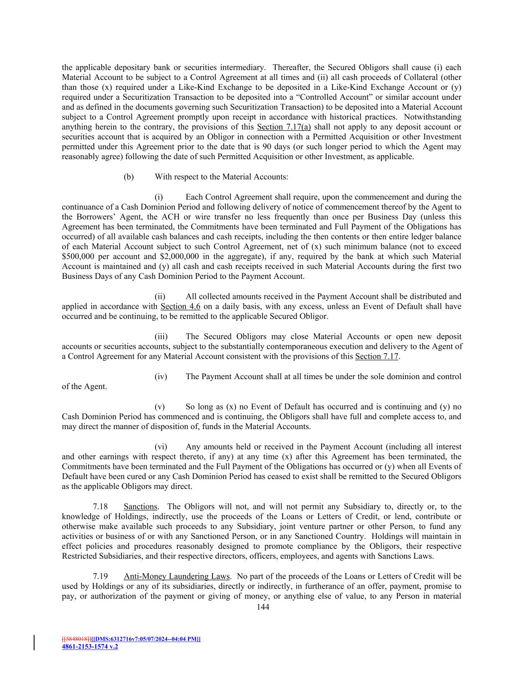 the applicable depositary bank or securities intermediary. Thereafter, the Secured Obligors shall cause (i) each Material Account to be subject to a Control Agreement at all times and (ii) all cash proceeds of Collateral (other than those (x) required under a Like-Kind Exchange to be deposited in a Like-Kind Exchange Account or (y) required under a Securitization Transaction to be deposited into a “Controlled Account” or similar account under and as defined in the documents governing such Securitization Transaction) to be deposited into a Material Account subject to a Control Agreement promptly upon receipt in accordance with historical practices. Notwithstanding anything herein to the contrary, the provisions of this Section 7.17(a) shall not apply to any deposit account or securities account that is acquired by an Obligor in connection with a Permitted Acquisition or other Investment permitted under this Agreement prior to the date that is 90 days (or such longer period to which the Agent may reasonably agree) following the date of such Permitted Acquisition or other Investment, as applicable. (b) With respect to the Material Accounts: (i) Each Control Agreement shall require, upon the commencement and during the continuance of a Cash Dominion Period and following delivery of notice of commencement thereof by the Agent to the Borrowers’ Agent, the ACH or wire transfer no less frequently than once per Business Day (unless this Agreement has been terminated, the Commitments have been terminated and Full Payment of the Obligations has occurred) of all available cash balances and cash receipts, including the then contents or then entire ledger balance of each Material Account subject to such Control Agreement, net of (x) such minimum balance (not to exceed $500,000 per account and $2,000,000 in the aggregate), if any, required by the bank at which such Material Account is maintained and (y) all cash and cash receipts received in such Material Accounts during the first two Business Days of any Cash Dominion Period to the Payment Account. (ii) All collected amounts received in the Payment Account shall be distributed and applied in accordance with Section 4.6 on a daily basis, with any excess, unless an Event of Default shall have occurred and be continuing, to be remitted to the applicable Secured Obligor. (iii) The Secured Obligors may close Material Accounts or open new deposit accounts or securities accounts, subject to the substantially contemporaneous execution and delivery to the Agent of a Control Agreement for any Material Account consistent with the provisions of this Section 7.17. (iv) The Payment Account shall at all times be under the sole dominion and control of the Agent. (v) So long as (x) no Event of Default has occurred and is continuing and (y) no Cash Dominion Period has commenced and is continuing, the Obligors shall have full and complete access to, and may direct the manner of disposition of, funds in the Material Accounts. (vi) Any amounts held or received in the Payment Account (including all interest and other earnings with respect thereto, if any) at any time (x) after this Agreement has been terminated, the Commitments have been terminated and the Full Payment of the Obligations has occurred or (y) when all Events of Default have been cured or any Cash Dominion Period has ceased to exist shall be remitted to the Secured Obligors as the applicable Obligors may direct. 7.18 Sanctions. The Obligors will not, and will not permit any Subsidiary to, directly or, to the knowledge of Holdings, indirectly, use the proceeds of the Loans or Letters of Credit, or lend, contribute or otherwise make available such proceeds to any Subsidiary, joint venture partner or other Person, to fund any activities or business of or with any Sanctioned Person, or in any Sanctioned Country. Holdings will maintain in effect policies and procedures reasonably designed to promote compliance by the Obligors, their respective Restricted Subsidiaries, and their respective directors, officers, employees, and agents with Sanctions Laws. 7.19 Anti-Money Laundering Laws. No part of the proceeds of the Loans or Letters of Credit will be used by Holdings or any of its subsidiaries, directly or indirectly, in furtherance of an offer, payment, promise to pay, or authorization of the payment or giving of money, or anything else of value, to any Person in material 144 [[5848018]][[DMS:6312716v7:05/07/2024--04:04 PM]] 4861-2153-1574 v.2