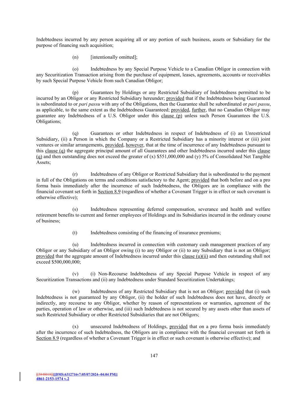 Indebtedness incurred by any person acquiring all or any portion of such business, assets or Subsidiary for the purpose of financing such acquisition; (n) [intentionally omitted]; (o) Indebtedness by any Special Purpose Vehicle to a Canadian Obligor in connection with any Securitization Transaction arising from the purchase of equipment, leases, agreements, accounts or receivables by such Special Purpose Vehicle from such Canadian Obligor; (p) Guarantees by Holdings or any Restricted Subsidiary of Indebtedness permitted to be incurred by an Obligor or any Restricted Subsidiary hereunder; provided that if the Indebtedness being Guaranteed is subordinated to or pari passu with any of the Obligations, then the Guarantee shall be subordinated or pari passu, as applicable, to the same extent as the Indebtedness Guaranteed; provided, further, that no Canadian Obligor may guarantee any Indebtedness of a U.S. Obligor under this clause (p) unless such Person Guarantees the U.S. Obligations; (q) Guarantees or other Indebtedness in respect of Indebtedness of (i) an Unrestricted Subsidiary, (ii) a Person in which the Company or a Restricted Subsidiary has a minority interest or (iii) joint ventures or similar arrangements, provided, however, that at the time of incurrence of any Indebtedness pursuant to this clause (q) the aggregate principal amount of all Guarantees and other Indebtedness incurred under this clause (q) and then outstanding does not exceed the greater of (x) $551,000,000 and (y) 5% of Consolidated Net Tangible Assets; (r) Indebtedness of any Obligor or Restricted Subsidiary that is subordinated to the payment in full of the Obligations on terms and conditions satisfactory to the Agent; provided that both before and on a pro forma basis immediately after the incurrence of such Indebtedness, the Obligors are in compliance with the financial covenant set forth in Section 8.9 (regardless of whether a Covenant Trigger is in effect or such covenant is otherwise effective); (s) Indebtedness representing deferred compensation, severance and health and welfare retirement benefits to current and former employees of Holdings and its Subsidiaries incurred in the ordinary course of business; (t) Indebtedness consisting of the financing of insurance premiums; (u) Indebtedness incurred in connection with customary cash management practices of any Obligor or any Subsidiary of an Obligor owing (i) to any Obligor or (ii) to any Subsidiary that is not an Obligor; provided that the aggregate amount of Indebtedness incurred under this clause (u)(ii) and then outstanding shall not exceed $500,000,000; (v) (i) Non-Recourse Indebtedness of any Special Purpose Vehicle in respect of any Securitization Transactions and (ii) any Indebtedness under Standard Securitization Undertakings; (w) Indebtedness of any Restricted Subsidiary that is not an Obligor; provided that (i) such Indebtedness is not guaranteed by any Obligor, (ii) the holder of such Indebtedness does not have, directly or indirectly, any recourse to any Obligor, whether by reason of representations or warranties, agreement of the parties, operation of law or otherwise, and (iii) such Indebtedness is not secured by any assets other than assets of such Restricted Subsidiary or other Restricted Subsidiaries that are not Obligors; (x) unsecured Indebtedness of Holdings, provided that on a pro forma basis immediately after the incurrence of such Indebtedness, the Obligors are in compliance with the financial covenant set forth in Section 8.9 (regardless of whether a Covenant Trigger is in effect or such covenant is otherwise effective); and 147 [[5848018]][[DMS:6312716v7:05/07/2024--04:04 PM]] 4861-2153-1574 v.2