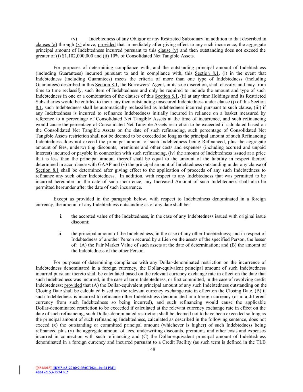 (y) Indebtedness of any Obligor or any Restricted Subsidiary, in addition to that described in clauses (a) through (x) above; provided that immediately after giving effect to any such incurrence, the aggregate principal amount of Indebtedness incurred pursuant to this clause (y) and then outstanding does not exceed the greater of (i) $1,102,000,000 and (ii) 10% of Consolidated Net Tangible Assets. For purposes of determining compliance with, and the outstanding principal amount of Indebtedness (including Guarantees) incurred pursuant to and in compliance with, this Section 8.1, (i) in the event that Indebtedness (including Guarantees) meets the criteria of more than one type of Indebtedness (including Guarantees) described in this Section 8.1, the Borrowers’ Agent, in its sole discretion, shall classify, and may from time to time reclassify, such item of Indebtedness and only be required to include the amount and type of such Indebtedness in one or a combination of the clauses of this Section 8.1, (ii) at any time Holdings and its Restricted Subsidiaries would be entitled to incur any then outstanding unsecured Indebtedness under clause (j) of this Section 8.1, such Indebtedness shall be automatically reclassified as Indebtedness incurred pursuant to such clause, (iii) if any Indebtedness is incurred to refinance Indebtedness initially incurred in reliance on a basket measured by reference to a percentage of Consolidated Net Tangible Assets at the time of incurrence, and such refinancing would cause the percentage of Consolidated Net Tangible Assets restriction to be exceeded if calculated based on the Consolidated Net Tangible Assets on the date of such refinancing, such percentage of Consolidated Net Tangible Assets restriction shall not be deemed to be exceeded so long as the principal amount of such Refinancing Indebtedness does not exceed the principal amount of such Indebtedness being Refinanced, plus the aggregate amount of fees, underwriting discounts, premiums and other costs and expenses (including accrued and unpaid interest) incurred or payable in connection with such refinancing, (iv) the amount of Indebtedness issued at a price that is less than the principal amount thereof shall be equal to the amount of the liability in respect thereof determined in accordance with GAAP and (v) the principal amount of Indebtedness outstanding under any clause of Section 8.1 shall be determined after giving effect to the application of proceeds of any such Indebtedness to refinance any such other Indebtedness. In addition, with respect to any Indebtedness that was permitted to be incurred hereunder on the date of such incurrence, any Increased Amount of such Indebtedness shall also be permitted hereunder after the date of such incurrence. Except as provided in the paragraph below, with respect to Indebtedness denominated in a foreign currency, the amount of any Indebtedness outstanding as of any date shall be: i. the accreted value of the Indebtedness, in the case of any Indebtedness issued with original issue discount; ii. the principal amount of the Indebtedness, in the case of any other Indebtedness; and in respect of Indebtedness of another Person secured by a Lien on the assets of the specified Person, the lesser of: (A) the Fair Market Value of such assets at the date of determination; and (B) the amount of the Indebtedness of the other Person. For purposes of determining compliance with any Dollar-denominated restriction on the incurrence of Indebtedness denominated in a foreign currency, the Dollar-equivalent principal amount of such Indebtedness incurred pursuant thereto shall be calculated based on the relevant currency exchange rate in effect on the date that such Indebtedness was incurred, in the case of term Indebtedness, or first committed, in the case of revolving credit Indebtedness; provided that (A) the Dollar-equivalent principal amount of any such Indebtedness outstanding on the Closing Date shall be calculated based on the relevant currency exchange rate in effect on the Closing Date, (B) if such Indebtedness is incurred to refinance other Indebtedness denominated in a foreign currency (or in a different currency from such Indebtedness so being incurred), and such refinancing would cause the applicable Dollar-denominated restriction to be exceeded if calculated at the relevant currency exchange rate in effect on the date of such refinancing, such Dollar-denominated restriction shall be deemed not to have been exceeded so long as the principal amount of such refinancing Indebtedness, calculated as described in the following sentence, does not exceed (x) the outstanding or committed principal amount (whichever is higher) of such Indebtedness being refinanced plus (y) the aggregate amount of fees, underwriting discounts, premiums and other costs and expenses incurred in connection with such refinancing and (C) the Dollar-equivalent principal amount of Indebtedness denominated in a foreign currency and incurred pursuant to a Credit Facility (as such term is defined in the TLB 148 [[5848018]][[DMS:6312716v7:05/07/2024--04:04 PM]] 4861-2153-1574 v.2
