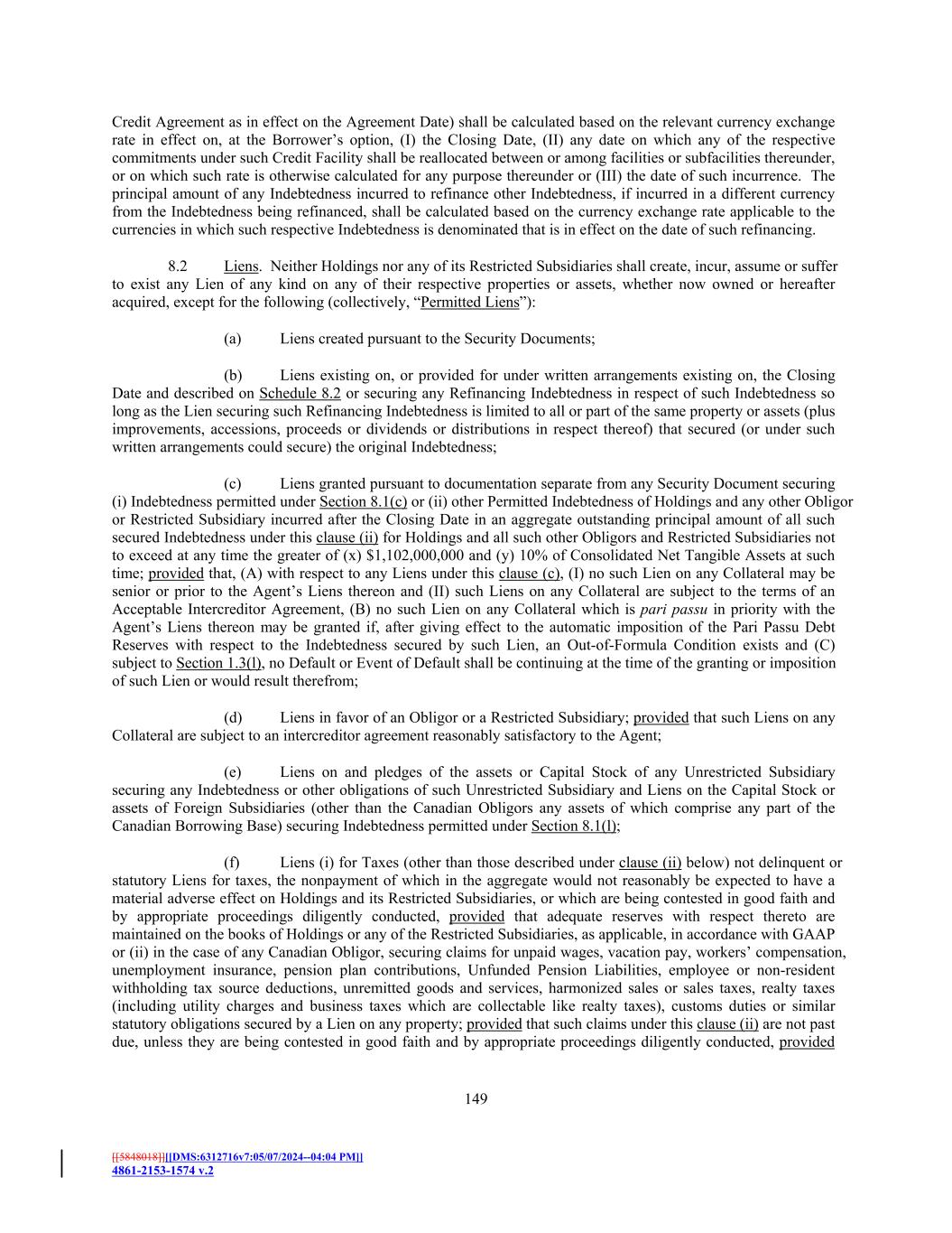 Credit Agreement as in effect on the Agreement Date) shall be calculated based on the relevant currency exchange rate in effect on, at the Borrower’s option, (I) the Closing Date, (II) any date on which any of the respective commitments under such Credit Facility shall be reallocated between or among facilities or subfacilities thereunder, or on which such rate is otherwise calculated for any purpose thereunder or (III) the date of such incurrence. The principal amount of any Indebtedness incurred to refinance other Indebtedness, if incurred in a different currency from the Indebtedness being refinanced, shall be calculated based on the currency exchange rate applicable to the currencies in which such respective Indebtedness is denominated that is in effect on the date of such refinancing. 8.2 Liens. Neither Holdings nor any of its Restricted Subsidiaries shall create, incur, assume or suffer to exist any Lien of any kind on any of their respective properties or assets, whether now owned or hereafter acquired, except for the following (collectively, “Permitted Liens”): (a) Liens created pursuant to the Security Documents; (b) Liens existing on, or provided for under written arrangements existing on, the Closing Date and described on Schedule 8.2 or securing any Refinancing Indebtedness in respect of such Indebtedness so long as the Lien securing such Refinancing Indebtedness is limited to all or part of the same property or assets (plus improvements, accessions, proceeds or dividends or distributions in respect thereof) that secured (or under such written arrangements could secure) the original Indebtedness; (c) Liens granted pursuant to documentation separate from any Security Document securing (i) Indebtedness permitted under Section 8.1(c) or (ii) other Permitted Indebtedness of Holdings and any other Obligor or Restricted Subsidiary incurred after the Closing Date in an aggregate outstanding principal amount of all such secured Indebtedness under this clause (ii) for Holdings and all such other Obligors and Restricted Subsidiaries not to exceed at any time the greater of (x) $1,102,000,000 and (y) 10% of Consolidated Net Tangible Assets at such time; provided that, (A) with respect to any Liens under this clause (c), (I) no such Lien on any Collateral may be senior or prior to the Agent’s Liens thereon and (II) such Liens on any Collateral are subject to the terms of an Acceptable Intercreditor Agreement, (B) no such Lien on any Collateral which is pari passu in priority with the Agent’s Liens thereon may be granted if, after giving effect to the automatic imposition of the Pari Passu Debt Reserves with respect to the Indebtedness secured by such Lien, an Out-of-Formula Condition exists and (C) subject to Section 1.3(l), no Default or Event of Default shall be continuing at the time of the granting or imposition of such Lien or would result therefrom; (d) Liens in favor of an Obligor or a Restricted Subsidiary; provided that such Liens on any Collateral are subject to an intercreditor agreement reasonably satisfactory to the Agent; (e) Liens on and pledges of the assets or Capital Stock of any Unrestricted Subsidiary securing any Indebtedness or other obligations of such Unrestricted Subsidiary and Liens on the Capital Stock or assets of Foreign Subsidiaries (other than the Canadian Obligors any assets of which comprise any part of the Canadian Borrowing Base) securing Indebtedness permitted under Section 8.1(l); (f) Liens (i) for Taxes (other than those described under clause (ii) below) not delinquent or statutory Liens for taxes, the nonpayment of which in the aggregate would not reasonably be expected to have a material adverse effect on Holdings and its Restricted Subsidiaries, or which are being contested in good faith and by appropriate proceedings diligently conducted, provided that adequate reserves with respect thereto are maintained on the books of Holdings or any of the Restricted Subsidiaries, as applicable, in accordance with GAAP or (ii) in the case of any Canadian Obligor, securing claims for unpaid wages, vacation pay, workers’ compensation, unemployment insurance, pension plan contributions, Unfunded Pension Liabilities, employee or non-resident withholding tax source deductions, unremitted goods and services, harmonized sales or sales taxes, realty taxes (including utility charges and business taxes which are collectable like realty taxes), customs duties or similar statutory obligations secured by a Lien on any property; provided that such claims under this clause (ii) are not past due, unless they are being contested in good faith and by appropriate proceedings diligently conducted, provided 149 [[5848018]][[DMS:6312716v7:05/07/2024--04:04 PM]] 4861-2153-1574 v.2