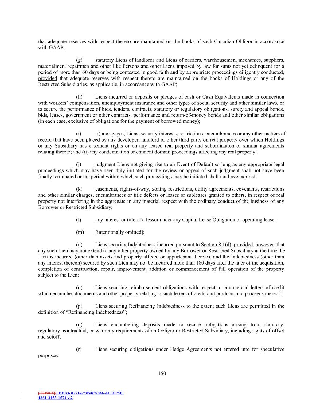 that adequate reserves with respect thereto are maintained on the books of such Canadian Obligor in accordance with GAAP; (g) statutory Liens of landlords and Liens of carriers, warehousemen, mechanics, suppliers, materialmen, repairmen and other like Persons and other Liens imposed by law for sums not yet delinquent for a period of more than 60 days or being contested in good faith and by appropriate proceedings diligently conducted, provided that adequate reserves with respect thereto are maintained on the books of Holdings or any of the Restricted Subsidiaries, as applicable, in accordance with GAAP; (h) Liens incurred or deposits or pledges of cash or Cash Equivalents made in connection with workers’ compensation, unemployment insurance and other types of social security and other similar laws, or to secure the performance of bids, tenders, contracts, statutory or regulatory obligations, surety and appeal bonds, bids, leases, government or other contracts, performance and return-of-money bonds and other similar obligations (in each case, exclusive of obligations for the payment of borrowed money); (i) (i) mortgages, Liens, security interests, restrictions, encumbrances or any other matters of record that have been placed by any developer, landlord or other third party on real property over which Holdings or any Subsidiary has easement rights or on any leased real property and subordination or similar agreements relating thereto; and (ii) any condemnation or eminent domain proceedings affecting any real property; (j) judgment Liens not giving rise to an Event of Default so long as any appropriate legal proceedings which may have been duly initiated for the review or appeal of such judgment shall not have been finally terminated or the period within which such proceedings may be initiated shall not have expired; (k) easements, rights-of-way, zoning restrictions, utility agreements, covenants, restrictions and other similar charges, encumbrances or title defects or leases or subleases granted to others, in respect of real property not interfering in the aggregate in any material respect with the ordinary conduct of the business of any Borrower or Restricted Subsidiary; (l) any interest or title of a lessor under any Capital Lease Obligation or operating lease; (m) [intentionally omitted]; (n) Liens securing Indebtedness incurred pursuant to Section 8.1(d); provided, however, that any such Lien may not extend to any other property owned by any Borrower or Restricted Subsidiary at the time the Lien is incurred (other than assets and property affixed or appurtenant thereto), and the Indebtedness (other than any interest thereon) secured by such Lien may not be incurred more than 180 days after the later of the acquisition, completion of construction, repair, improvement, addition or commencement of full operation of the property subject to the Lien; (o) Liens securing reimbursement obligations with respect to commercial letters of credit which encumber documents and other property relating to such letters of credit and products and proceeds thereof; (p) Liens securing Refinancing Indebtedness to the extent such Liens are permitted in the definition of “Refinancing Indebtedness”; (q) Liens encumbering deposits made to secure obligations arising from statutory, regulatory, contractual, or warranty requirements of an Obligor or Restricted Subsidiary, including rights of offset and setoff; (r) Liens securing obligations under Hedge Agreements not entered into for speculative purposes; 150 [[5848018]][[DMS:6312716v7:05/07/2024--04:04 PM]] 4861-2153-1574 v.2