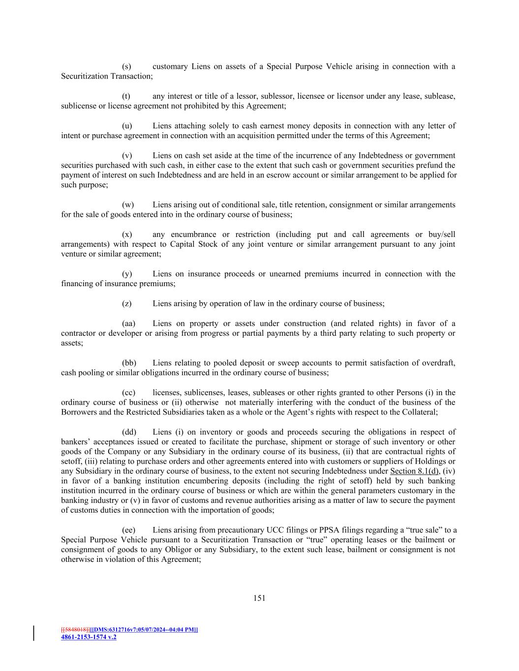 (s) customary Liens on assets of a Special Purpose Vehicle arising in connection with a Securitization Transaction; (t) any interest or title of a lessor, sublessor, licensee or licensor under any lease, sublease, sublicense or license agreement not prohibited by this Agreement; (u) Liens attaching solely to cash earnest money deposits in connection with any letter of intent or purchase agreement in connection with an acquisition permitted under the terms of this Agreement; (v) Liens on cash set aside at the time of the incurrence of any Indebtedness or government securities purchased with such cash, in either case to the extent that such cash or government securities prefund the payment of interest on such Indebtedness and are held in an escrow account or similar arrangement to be applied for such purpose; (w) Liens arising out of conditional sale, title retention, consignment or similar arrangements for the sale of goods entered into in the ordinary course of business; (x) any encumbrance or restriction (including put and call agreements or buy/sell arrangements) with respect to Capital Stock of any joint venture or similar arrangement pursuant to any joint venture or similar agreement; (y) Liens on insurance proceeds or unearned premiums incurred in connection with the financing of insurance premiums; (z) Liens arising by operation of law in the ordinary course of business; (aa) Liens on property or assets under construction (and related rights) in favor of a contractor or developer or arising from progress or partial payments by a third party relating to such property or assets; (bb) Liens relating to pooled deposit or sweep accounts to permit satisfaction of overdraft, cash pooling or similar obligations incurred in the ordinary course of business; (cc) licenses, sublicenses, leases, subleases or other rights granted to other Persons (i) in the ordinary course of business or (ii) otherwise not materially interfering with the conduct of the business of the Borrowers and the Restricted Subsidiaries taken as a whole or the Agent’s rights with respect to the Collateral; (dd) Liens (i) on inventory or goods and proceeds securing the obligations in respect of bankers’ acceptances issued or created to facilitate the purchase, shipment or storage of such inventory or other goods of the Company or any Subsidiary in the ordinary course of its business, (ii) that are contractual rights of setoff, (iii) relating to purchase orders and other agreements entered into with customers or suppliers of Holdings or any Subsidiary in the ordinary course of business, to the extent not securing Indebtedness under Section 8.1(d), (iv) in favor of a banking institution encumbering deposits (including the right of setoff) held by such banking institution incurred in the ordinary course of business or which are within the general parameters customary in the banking industry or (v) in favor of customs and revenue authorities arising as a matter of law to secure the payment of customs duties in connection with the importation of goods; (ee) Liens arising from precautionary UCC filings or PPSA filings regarding a “true sale” to a Special Purpose Vehicle pursuant to a Securitization Transaction or “true” operating leases or the bailment or consignment of goods to any Obligor or any Subsidiary, to the extent such lease, bailment or consignment is not otherwise in violation of this Agreement; 151 [[5848018]][[DMS:6312716v7:05/07/2024--04:04 PM]] 4861-2153-1574 v.2