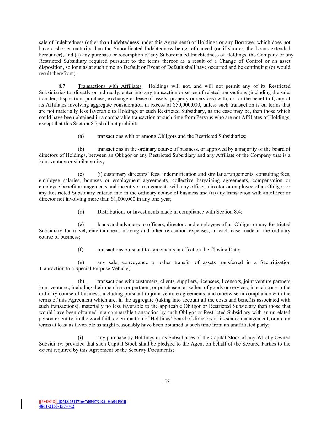 sale of Indebtedness (other than Indebtedness under this Agreement) of Holdings or any Borrower which does not have a shorter maturity than the Subordinated Indebtedness being refinanced (or if shorter, the Loans extended hereunder), and (a) any purchase or redemption of any Subordinated Indebtedness of Holdings, the Company or any Restricted Subsidiary required pursuant to the terms thereof as a result of a Change of Control or an asset disposition, so long as at such time no Default or Event of Default shall have occurred and be continuing (or would result therefrom). 8.7 Transactions with Affiliates. Holdings will not, and will not permit any of its Restricted Subsidiaries to, directly or indirectly, enter into any transaction or series of related transactions (including the sale, transfer, disposition, purchase, exchange or lease of assets, property or services) with, or for the benefit of, any of its Affiliates involving aggregate consideration in excess of $50,000,000, unless such transaction is on terms that are not materially less favorable to Holdings or such Restricted Subsidiary, as the case may be, than those which could have been obtained in a comparable transaction at such time from Persons who are not Affiliates of Holdings, except that this Section 8.7 shall not prohibit: (a) transactions with or among Obligors and the Restricted Subsidiaries; (b) transactions in the ordinary course of business, or approved by a majority of the board of directors of Holdings, between an Obligor or any Restricted Subsidiary and any Affiliate of the Company that is a joint venture or similar entity; (c) (i) customary directors’ fees, indemnification and similar arrangements, consulting fees, employee salaries, bonuses or employment agreements, collective bargaining agreements, compensation or employee benefit arrangements and incentive arrangements with any officer, director or employee of an Obligor or any Restricted Subsidiary entered into in the ordinary course of business and (ii) any transaction with an officer or director not involving more than $1,000,000 in any one year; (d) Distributions or Investments made in compliance with Section 8.4; (e) loans and advances to officers, directors and employees of an Obligor or any Restricted Subsidiary for travel, entertainment, moving and other relocation expenses, in each case made in the ordinary course of business; (f) transactions pursuant to agreements in effect on the Closing Date; (g) any sale, conveyance or other transfer of assets transferred in a Securitization Transaction to a Special Purpose Vehicle; (h) transactions with customers, clients, suppliers, licensees, licensors, joint venture partners, joint ventures, including their members or partners, or purchasers or sellers of goods or services, in each case in the ordinary course of business, including pursuant to joint venture agreements, and otherwise in compliance with the terms of this Agreement which are, in the aggregate (taking into account all the costs and benefits associated with such transactions), materially no less favorable to the applicable Obligor or Restricted Subsidiary than those that would have been obtained in a comparable transaction by such Obligor or Restricted Subsidiary with an unrelated person or entity, in the good faith determination of Holdings’ board of directors or its senior management, or are on terms at least as favorable as might reasonably have been obtained at such time from an unaffiliated party; (i) any purchase by Holdings or its Subsidiaries of the Capital Stock of any Wholly Owned Subsidiary; provided that such Capital Stock shall be pledged to the Agent on behalf of the Secured Parties to the extent required by this Agreement or the Security Documents; 155 [[5848018]][[DMS:6312716v7:05/07/2024--04:04 PM]] 4861-2153-1574 v.2