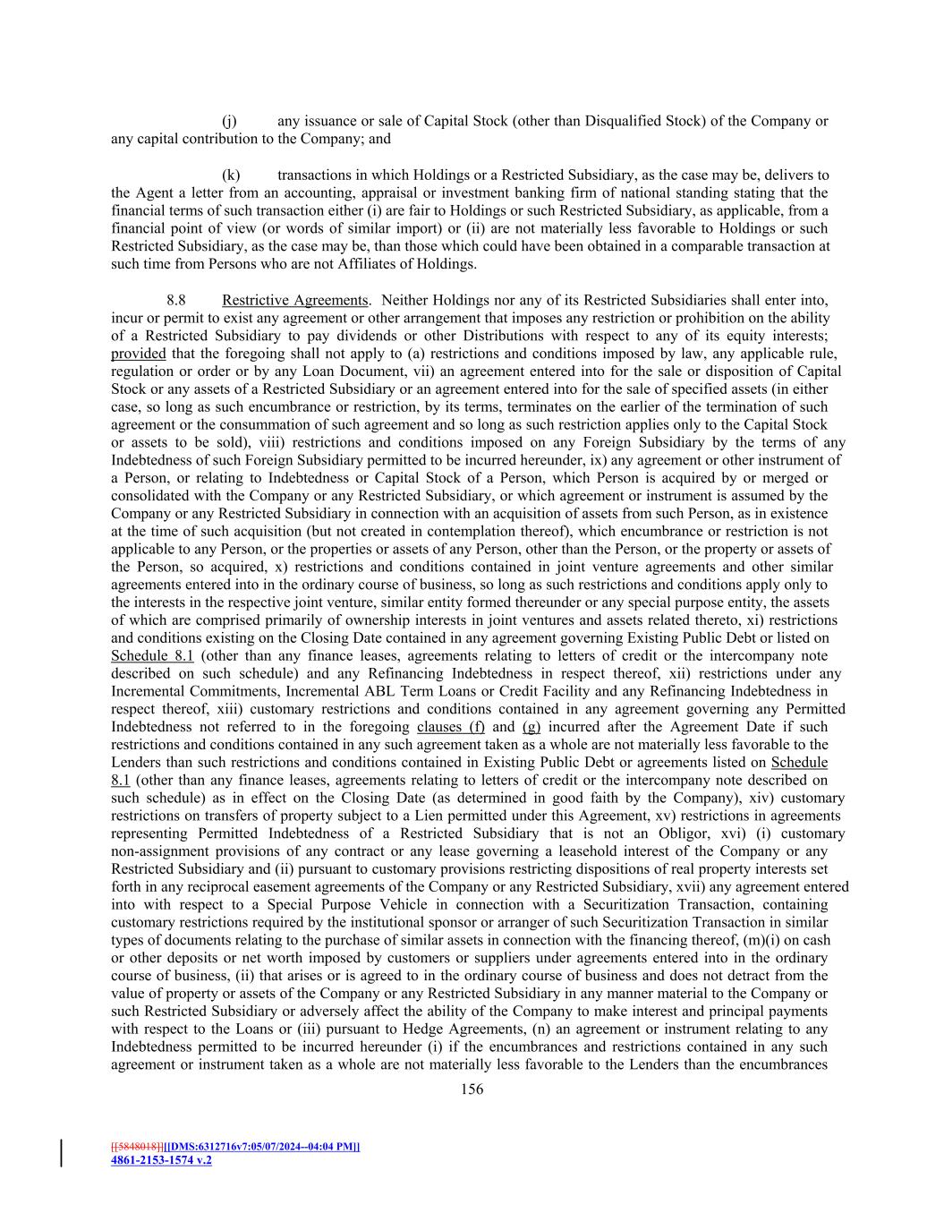 (j) any issuance or sale of Capital Stock (other than Disqualified Stock) of the Company or any capital contribution to the Company; and (k) transactions in which Holdings or a Restricted Subsidiary, as the case may be, delivers to the Agent a letter from an accounting, appraisal or investment banking firm of national standing stating that the financial terms of such transaction either (i) are fair to Holdings or such Restricted Subsidiary, as applicable, from a financial point of view (or words of similar import) or (ii) are not materially less favorable to Holdings or such Restricted Subsidiary, as the case may be, than those which could have been obtained in a comparable transaction at such time from Persons who are not Affiliates of Holdings. 8.8 Restrictive Agreements. Neither Holdings nor any of its Restricted Subsidiaries shall enter into, incur or permit to exist any agreement or other arrangement that imposes any restriction or prohibition on the ability of a Restricted Subsidiary to pay dividends or other Distributions with respect to any of its equity interests; provided that the foregoing shall not apply to (a) restrictions and conditions imposed by law, any applicable rule, regulation or order or by any Loan Document, vii) an agreement entered into for the sale or disposition of Capital Stock or any assets of a Restricted Subsidiary or an agreement entered into for the sale of specified assets (in either case, so long as such encumbrance or restriction, by its terms, terminates on the earlier of the termination of such agreement or the consummation of such agreement and so long as such restriction applies only to the Capital Stock or assets to be sold), viii) restrictions and conditions imposed on any Foreign Subsidiary by the terms of any Indebtedness of such Foreign Subsidiary permitted to be incurred hereunder, ix) any agreement or other instrument of a Person, or relating to Indebtedness or Capital Stock of a Person, which Person is acquired by or merged or consolidated with the Company or any Restricted Subsidiary, or which agreement or instrument is assumed by the Company or any Restricted Subsidiary in connection with an acquisition of assets from such Person, as in existence at the time of such acquisition (but not created in contemplation thereof), which encumbrance or restriction is not applicable to any Person, or the properties or assets of any Person, other than the Person, or the property or assets of the Person, so acquired, x) restrictions and conditions contained in joint venture agreements and other similar agreements entered into in the ordinary course of business, so long as such restrictions and conditions apply only to the interests in the respective joint venture, similar entity formed thereunder or any special purpose entity, the assets of which are comprised primarily of ownership interests in joint ventures and assets related thereto, xi) restrictions and conditions existing on the Closing Date contained in any agreement governing Existing Public Debt or listed on Schedule 8.1 (other than any finance leases, agreements relating to letters of credit or the intercompany note described on such schedule) and any Refinancing Indebtedness in respect thereof, xii) restrictions under any Incremental Commitments, Incremental ABL Term Loans or Credit Facility and any Refinancing Indebtedness in respect thereof, xiii) customary restrictions and conditions contained in any agreement governing any Permitted Indebtedness not referred to in the foregoing clauses (f) and (g) incurred after the Agreement Date if such restrictions and conditions contained in any such agreement taken as a whole are not materially less favorable to the Lenders than such restrictions and conditions contained in Existing Public Debt or agreements listed on Schedule 8.1 (other than any finance leases, agreements relating to letters of credit or the intercompany note described on such schedule) as in effect on the Closing Date (as determined in good faith by the Company), xiv) customary restrictions on transfers of property subject to a Lien permitted under this Agreement, xv) restrictions in agreements representing Permitted Indebtedness of a Restricted Subsidiary that is not an Obligor, xvi) (i) customary non-assignment provisions of any contract or any lease governing a leasehold interest of the Company or any Restricted Subsidiary and (ii) pursuant to customary provisions restricting dispositions of real property interests set forth in any reciprocal easement agreements of the Company or any Restricted Subsidiary, xvii) any agreement entered into with respect to a Special Purpose Vehicle in connection with a Securitization Transaction, containing customary restrictions required by the institutional sponsor or arranger of such Securitization Transaction in similar types of documents relating to the purchase of similar assets in connection with the financing thereof, (m)(i) on cash or other deposits or net worth imposed by customers or suppliers under agreements entered into in the ordinary course of business, (ii) that arises or is agreed to in the ordinary course of business and does not detract from the value of property or assets of the Company or any Restricted Subsidiary in any manner material to the Company or such Restricted Subsidiary or adversely affect the ability of the Company to make interest and principal payments with respect to the Loans or (iii) pursuant to Hedge Agreements, (n) an agreement or instrument relating to any Indebtedness permitted to be incurred hereunder (i) if the encumbrances and restrictions contained in any such agreement or instrument taken as a whole are not materially less favorable to the Lenders than the encumbrances 156 [[5848018]][[DMS:6312716v7:05/07/2024--04:04 PM]] 4861-2153-1574 v.2