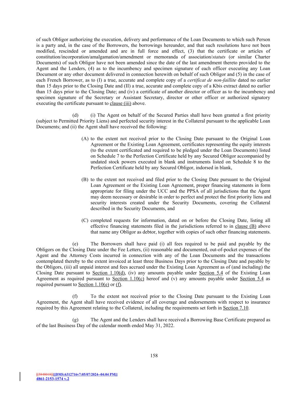 of such Obligor authorizing the execution, delivery and performance of the Loan Documents to which such Person is a party and, in the case of the Borrowers, the borrowings hereunder, and that such resolutions have not been modified, rescinded or amended and are in full force and effect, (3) that the certificate or articles of constitution/incorporation/amalgamation/amendment or memoranda of association/statuts (or similar Charter Documents) of such Obligor have not been amended since the date of the last amendment thereto provided to the Agent and the Lenders, (4) as to the incumbency and specimen signature of each officer executing any Loan Document or any other document delivered in connection herewith on behalf of such Obligor and (5) in the case of each French Borrower, as to (I) a true, accurate and complete copy of a certificat de non-faillite dated no earlier than 15 days prior to the Closing Date and (II) a true, accurate and complete copy of a Kbis extract dated no earlier than 15 days prior to the Closing Date; and (iv) a certificate of another director or officer as to the incumbency and specimen signature of the Secretary or Assistant Secretary, director or other officer or authorized signatory executing the certificate pursuant to clause (iii) above. (d) (i) The Agent on behalf of the Secured Parties shall have been granted a first priority (subject to Permitted Priority Liens) and perfected security interest in the Collateral pursuant to the applicable Loan Documents; and (ii) the Agent shall have received the following: (A) to the extent not received prior to the Closing Date pursuant to the Original Loan Agreement or the Existing Loan Agreement, certificates representing the equity interests (to the extent certificated and required to be pledged under the Loan Documents) listed on Schedule 7 to the Perfection Certificate held by any Secured Obligor accompanied by undated stock powers executed in blank and instruments listed on Schedule 8 to the Perfection Certificate held by any Secured Obligor, indorsed in blank, (B) to the extent not received and filed prior to the Closing Date pursuant to the Original Loan Agreement or the Existing Loan Agreement, proper financing statements in form appropriate for filing under the UCC and the PPSA of all jurisdictions that the Agent may deem necessary or desirable in order to perfect and protect the first priority liens and security interests created under the Security Documents, covering the Collateral described in the Security Documents, and (C) completed requests for information, dated on or before the Closing Date, listing all effective financing statements filed in the jurisdictions referred to in clause (B) above that name any Obligor as debtor, together with copies of such other financing statements. (e) The Borrowers shall have paid (i) all fees required to be paid and payable by the Obligors on the Closing Date under the Fee Letters, (ii) reasonable and documented, out-of-pocket expenses of the Agent and the Attorney Costs incurred in connection with any of the Loan Documents and the transactions contemplated thereby to the extent invoiced at least three Business Days prior to the Closing Date and payable by the Obligors, (iii) all unpaid interest and fees accrued under the Existing Loan Agreement as of (and including) the Closing Date pursuant to Section 1.10(d), (iv) any amounts payable under Section 5.4 of the Existing Loan Agreement as required pursuant to Section 1.10(c) hereof and (v) any amounts payable under Section 5.4 as required pursuant to Section 1.10(e) or (f). (f) To the extent not received prior to the Closing Date pursuant to the Existing Loan Agreement, the Agent shall have received evidence of all coverage and endorsements with respect to insurance required by this Agreement relating to the Collateral, including the requirements set forth in Section 7.10. (g) The Agent and the Lenders shall have received a Borrowing Base Certificate prepared as of the last Business Day of the calendar month ended May 31, 2022. 158 [[5848018]][[DMS:6312716v7:05/07/2024--04:04 PM]] 4861-2153-1574 v.2
