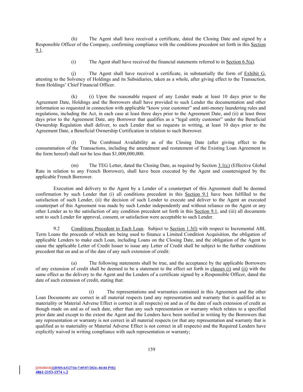 (h) The Agent shall have received a certificate, dated the Closing Date and signed by a Responsible Officer of the Company, confirming compliance with the conditions precedent set forth in this Section 9.1. (i) The Agent shall have received the financial statements referred to in Section 6.5(a). (j) The Agent shall have received a certificate, in substantially the form of Exhibit G, attesting to the Solvency of Holdings and its Subsidiaries, taken as a whole, after giving effect to the Transaction, from Holdings’ Chief Financial Officer. (k) (i) Upon the reasonable request of any Lender made at least 10 days prior to the Agreement Date, Holdings and the Borrowers shall have provided to such Lender the documentation and other information so requested in connection with applicable “know your customer” and anti-money laundering rules and regulations, including the Act, in each case at least three days prior to the Agreement Date, and (ii) at least three days prior to the Agreement Date, any Borrower that qualifies as a “legal entity customer” under the Beneficial Ownership Regulation shall deliver, to each Lender that so requests in writing, at least 10 days prior to the Agreement Date, a Beneficial Ownership Certification in relation to such Borrower. (l) The Combined Availability as of the Closing Date (after giving effect to the consummation of the Transactions, including the amendment and restatement of the Existing Loan Agreement in the form hereof) shall not be less than $1,000,000,000. (m) The TEG Letter, dated the Closing Date, as required by Section 3.1(c) (Effective Global Rate in relation to any French Borrower), shall have been executed by the Agent and countersigned by the applicable French Borrower. Execution and delivery to the Agent by a Lender of a counterpart of this Agreement shall be deemed confirmation by such Lender that (i) all conditions precedent in this Section 9.1 have been fulfilled to the satisfaction of such Lender, (ii) the decision of such Lender to execute and deliver to the Agent an executed counterpart of this Agreement was made by such Lender independently and without reliance on the Agent or any other Lender as to the satisfaction of any condition precedent set forth in this Section 9.1, and (iii) all documents sent to such Lender for approval, consent, or satisfaction were acceptable to such Lender. 9.2 Conditions Precedent to Each Loan. Subject to Section 1.3(l) with respect to Incremental ABL Term Loans the proceeds of which are being used to finance a Limited Condition Acquisition, the obligation of applicable Lenders to make each Loan, including Loans on the Closing Date, and the obligation of the Agent to cause the applicable Letter of Credit Issuer to issue any Letter of Credit shall be subject to the further conditions precedent that on and as of the date of any such extension of credit: (a) The following statements shall be true, and the acceptance by the applicable Borrowers of any extension of credit shall be deemed to be a statement to the effect set forth in clauses (i) and (ii) with the same effect as the delivery to the Agent and the Lenders of a certificate signed by a Responsible Officer, dated the date of such extension of credit, stating that: (i) The representations and warranties contained in this Agreement and the other Loan Documents are correct in all material respects (and any representation and warranty that is qualified as to materiality or Material Adverse Effect is correct in all respects) on and as of the date of such extension of credit as though made on and as of such date, other than any such representation or warranty which relates to a specified prior date and except to the extent the Agent and the Lenders have been notified in writing by the Borrowers that any representation or warranty is not correct in all material respects (or that any representation and warranty that is qualified as to materiality or Material Adverse Effect is not correct in all respects) and the Required Lenders have explicitly waived in writing compliance with such representation or warranty; 159 [[5848018]][[DMS:6312716v7:05/07/2024--04:04 PM]] 4861-2153-1574 v.2