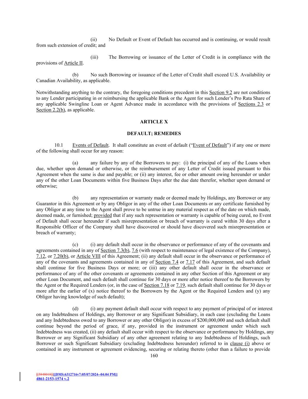 (ii) No Default or Event of Default has occurred and is continuing, or would result from such extension of credit; and (iii) The Borrowing or issuance of the Letter of Credit is in compliance with the provisions of Article II. (b) No such Borrowing or issuance of the Letter of Credit shall exceed U.S. Availability or Canadian Availability, as applicable. Notwithstanding anything to the contrary, the foregoing conditions precedent in this Section 9.2 are not conditions to any Lender participating in or reimbursing the applicable Bank or the Agent for such Lender’s Pro Rata Share of any applicable Swingline Loan or Agent Advance made in accordance with the provisions of Sections 2.3 or Section 2.2(b), as applicable. ARTICLE X DEFAULT; REMEDIES 10.1 Events of Default. It shall constitute an event of default (“Event of Default”) if any one or more of the following shall occur for any reason: (a) any failure by any of the Borrowers to pay: (i) the principal of any of the Loans when due, whether upon demand or otherwise, or the reimbursement of any Letter of Credit issued pursuant to this Agreement when the same is due and payable; or (ii) any interest, fee or other amount owing hereunder or under any of the other Loan Documents within five Business Days after the due date therefor, whether upon demand or otherwise; (b) any representation or warranty made or deemed made by Holdings, any Borrower or any Guarantor in this Agreement or by any Obligor in any of the other Loan Documents or any certificate furnished by any Obligor at any time to the Agent shall prove to be untrue in any material respect as of the date on which made, deemed made, or furnished; provided that if any such representation or warranty is capable of being cured, no Event of Default shall occur hereunder if such misrepresentation or breach of warranty is cured within 30 days after a Responsible Officer of the Company shall have discovered or should have discovered such misrepresentation or breach of warranty; (c) (i) any default shall occur in the observance or performance of any of the covenants and agreements contained in any of Section 7.3(b), 7.6 (with respect to maintenance of legal existence of the Company), 7.12, or 7.20(b), or Article VIII of this Agreement; (ii) any default shall occur in the observance or performance of any of the covenants and agreements contained in any of Section 7.4 or 7.17 of this Agreement, and such default shall continue for five Business Days or more; or (iii) any other default shall occur in the observance or performance of any of the other covenants or agreements contained in any other Section of this Agreement or any other Loan Document, and such default shall continue for 30 days or more after notice thereof to the Borrowers by the Agent or the Required Lenders (or, in the case of Section 7.18 or 7.19, such default shall continue for 30 days or more after the earlier of (x) notice thereof to the Borrowers by the Agent or the Required Lenders and (y) any Obligor having knowledge of such default); (d) (i) any payment default shall occur with respect to any payment of principal of or interest on any Indebtedness of Holdings, any Borrower or any Significant Subsidiary, in each case (excluding the Loans and any Indebtedness owed to any Borrower or any other Obligor) in excess of $200,000,000 and such default shall continue beyond the period of grace, if any, provided in the instrument or agreement under which such Indebtedness was created, (ii) any default shall occur with respect to the observance or performance by Holdings, any Borrower or any Significant Subsidiary of any other agreement relating to any Indebtedness of Holdings, such Borrower or such Significant Subsidiary (excluding Indebtedness hereunder) referred to in clause (i) above or contained in any instrument or agreement evidencing, securing or relating thereto (other than a failure to provide 160 [[5848018]][[DMS:6312716v7:05/07/2024--04:04 PM]] 4861-2153-1574 v.2