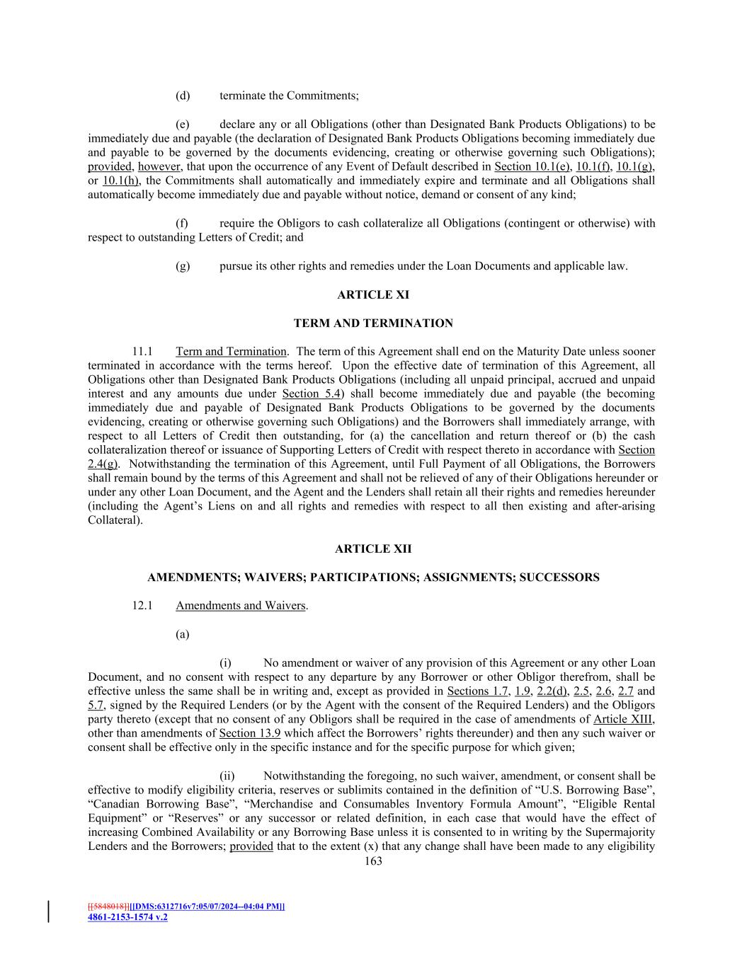 (d) terminate the Commitments; (e) declare any or all Obligations (other than Designated Bank Products Obligations) to be immediately due and payable (the declaration of Designated Bank Products Obligations becoming immediately due and payable to be governed by the documents evidencing, creating or otherwise governing such Obligations); provided, however, that upon the occurrence of any Event of Default described in Section 10.1(e), 10.1(f), 10.1(g), or 10.1(h), the Commitments shall automatically and immediately expire and terminate and all Obligations shall automatically become immediately due and payable without notice, demand or consent of any kind; (f) require the Obligors to cash collateralize all Obligations (contingent or otherwise) with respect to outstanding Letters of Credit; and (g) pursue its other rights and remedies under the Loan Documents and applicable law. ARTICLE XI TERM AND TERMINATION 11.1 Term and Termination. The term of this Agreement shall end on the Maturity Date unless sooner terminated in accordance with the terms hereof. Upon the effective date of termination of this Agreement, all Obligations other than Designated Bank Products Obligations (including all unpaid principal, accrued and unpaid interest and any amounts due under Section 5.4) shall become immediately due and payable (the becoming immediately due and payable of Designated Bank Products Obligations to be governed by the documents evidencing, creating or otherwise governing such Obligations) and the Borrowers shall immediately arrange, with respect to all Letters of Credit then outstanding, for (a) the cancellation and return thereof or (b) the cash collateralization thereof or issuance of Supporting Letters of Credit with respect thereto in accordance with Section 2.4(g). Notwithstanding the termination of this Agreement, until Full Payment of all Obligations, the Borrowers shall remain bound by the terms of this Agreement and shall not be relieved of any of their Obligations hereunder or under any other Loan Document, and the Agent and the Lenders shall retain all their rights and remedies hereunder (including the Agent’s Liens on and all rights and remedies with respect to all then existing and after-arising Collateral). ARTICLE XII AMENDMENTS; WAIVERS; PARTICIPATIONS; ASSIGNMENTS; SUCCESSORS 12.1 Amendments and Waivers. (a) (i) No amendment or waiver of any provision of this Agreement or any other Loan Document, and no consent with respect to any departure by any Borrower or other Obligor therefrom, shall be effective unless the same shall be in writing and, except as provided in Sections 1.7, 1.9, 2.2(d), 2.5, 2.6, 2.7 and 5.7, signed by the Required Lenders (or by the Agent with the consent of the Required Lenders) and the Obligors party thereto (except that no consent of any Obligors shall be required in the case of amendments of Article XIII, other than amendments of Section 13.9 which affect the Borrowers’ rights thereunder) and then any such waiver or consent shall be effective only in the specific instance and for the specific purpose for which given; (ii) Notwithstanding the foregoing, no such waiver, amendment, or consent shall be effective to modify eligibility criteria, reserves or sublimits contained in the definition of “U.S. Borrowing Base”, “Canadian Borrowing Base”, “Merchandise and Consumables Inventory Formula Amount”, “Eligible Rental Equipment” or “Reserves” or any successor or related definition, in each case that would have the effect of increasing Combined Availability or any Borrowing Base unless it is consented to in writing by the Supermajority Lenders and the Borrowers; provided that to the extent (x) that any change shall have been made to any eligibility 163 [[5848018]][[DMS:6312716v7:05/07/2024--04:04 PM]] 4861-2153-1574 v.2