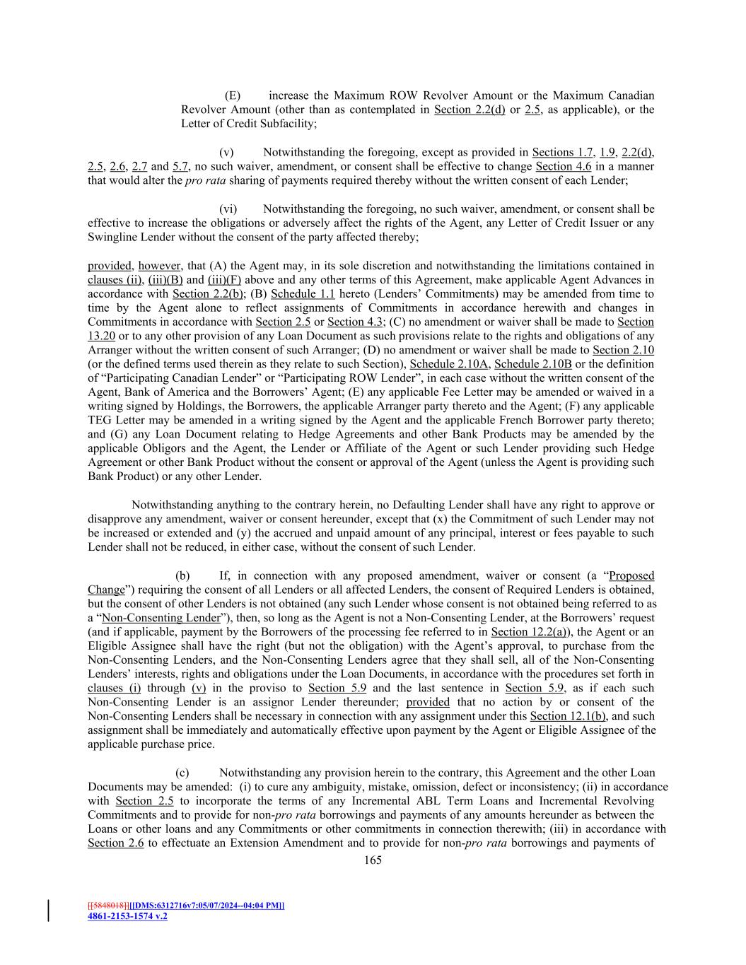 (E) increase the Maximum ROW Revolver Amount or the Maximum Canadian Revolver Amount (other than as contemplated in Section 2.2(d) or 2.5, as applicable), or the Letter of Credit Subfacility; (v) Notwithstanding the foregoing, except as provided in Sections 1.7, 1.9, 2.2(d), 2.5, 2.6, 2.7 and 5.7, no such waiver, amendment, or consent shall be effective to change Section 4.6 in a manner that would alter the pro rata sharing of payments required thereby without the written consent of each Lender; (vi) Notwithstanding the foregoing, no such waiver, amendment, or consent shall be effective to increase the obligations or adversely affect the rights of the Agent, any Letter of Credit Issuer or any Swingline Lender without the consent of the party affected thereby; provided, however, that (A) the Agent may, in its sole discretion and notwithstanding the limitations contained in clauses (ii), (iii)(B) and (iii)(F) above and any other terms of this Agreement, make applicable Agent Advances in accordance with Section 2.2(b); (B) Schedule 1.1 hereto (Lenders’ Commitments) may be amended from time to time by the Agent alone to reflect assignments of Commitments in accordance herewith and changes in Commitments in accordance with Section 2.5 or Section 4.3; (C) no amendment or waiver shall be made to Section 13.20 or to any other provision of any Loan Document as such provisions relate to the rights and obligations of any Arranger without the written consent of such Arranger; (D) no amendment or waiver shall be made to Section 2.10 (or the defined terms used therein as they relate to such Section), Schedule 2.10A, Schedule 2.10B or the definition of “Participating Canadian Lender” or “Participating ROW Lender”, in each case without the written consent of the Agent, Bank of America and the Borrowers’ Agent; (E) any applicable Fee Letter may be amended or waived in a writing signed by Holdings, the Borrowers, the applicable Arranger party thereto and the Agent; (F) any applicable TEG Letter may be amended in a writing signed by the Agent and the applicable French Borrower party thereto; and (G) any Loan Document relating to Hedge Agreements and other Bank Products may be amended by the applicable Obligors and the Agent, the Lender or Affiliate of the Agent or such Lender providing such Hedge Agreement or other Bank Product without the consent or approval of the Agent (unless the Agent is providing such Bank Product) or any other Lender. Notwithstanding anything to the contrary herein, no Defaulting Lender shall have any right to approve or disapprove any amendment, waiver or consent hereunder, except that (x) the Commitment of such Lender may not be increased or extended and (y) the accrued and unpaid amount of any principal, interest or fees payable to such Lender shall not be reduced, in either case, without the consent of such Lender. (b) If, in connection with any proposed amendment, waiver or consent (a “Proposed Change”) requiring the consent of all Lenders or all affected Lenders, the consent of Required Lenders is obtained, but the consent of other Lenders is not obtained (any such Lender whose consent is not obtained being referred to as a “Non-Consenting Lender”), then, so long as the Agent is not a Non-Consenting Lender, at the Borrowers’ request (and if applicable, payment by the Borrowers of the processing fee referred to in Section 12.2(a)), the Agent or an Eligible Assignee shall have the right (but not the obligation) with the Agent’s approval, to purchase from the Non-Consenting Lenders, and the Non-Consenting Lenders agree that they shall sell, all of the Non-Consenting Lenders’ interests, rights and obligations under the Loan Documents, in accordance with the procedures set forth in clauses (i) through (v) in the proviso to Section 5.9 and the last sentence in Section 5.9, as if each such Non-Consenting Lender is an assignor Lender thereunder; provided that no action by or consent of the Non-Consenting Lenders shall be necessary in connection with any assignment under this Section 12.1(b), and such assignment shall be immediately and automatically effective upon payment by the Agent or Eligible Assignee of the applicable purchase price. (c) Notwithstanding any provision herein to the contrary, this Agreement and the other Loan Documents may be amended: (i) to cure any ambiguity, mistake, omission, defect or inconsistency; (ii) in accordance with Section 2.5 to incorporate the terms of any Incremental ABL Term Loans and Incremental Revolving Commitments and to provide for non-pro rata borrowings and payments of any amounts hereunder as between the Loans or other loans and any Commitments or other commitments in connection therewith; (iii) in accordance with Section 2.6 to effectuate an Extension Amendment and to provide for non-pro rata borrowings and payments of 165 [[5848018]][[DMS:6312716v7:05/07/2024--04:04 PM]] 4861-2153-1574 v.2