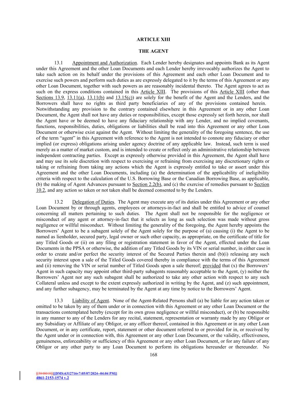 ARTICLE XIII THE AGENT 13.1 Appointment and Authorization. Each Lender hereby designates and appoints Bank as its Agent under this Agreement and the other Loan Documents and each Lender hereby irrevocably authorizes the Agent to take such action on its behalf under the provisions of this Agreement and each other Loan Document and to exercise such powers and perform such duties as are expressly delegated to it by the terms of this Agreement or any other Loan Document, together with such powers as are reasonably incidental thereto. The Agent agrees to act as such on the express conditions contained in this Article XIII. The provisions of this Article XIII (other than Sections 13.9, 13.11(a), 13.11(b) and 13.15(c)) are solely for the benefit of the Agent and the Lenders, and the Borrowers shall have no rights as third party beneficiaries of any of the provisions contained herein. Notwithstanding any provision to the contrary contained elsewhere in this Agreement or in any other Loan Document, the Agent shall not have any duties or responsibilities, except those expressly set forth herein, nor shall the Agent have or be deemed to have any fiduciary relationship with any Lender, and no implied covenants, functions, responsibilities, duties, obligations or liabilities shall be read into this Agreement or any other Loan Document or otherwise exist against the Agent. Without limiting the generality of the foregoing sentence, the use of the term “agent” in this Agreement with reference to the Agent is not intended to connote any fiduciary or other implied (or express) obligations arising under agency doctrine of any applicable law. Instead, such term is used merely as a matter of market custom, and is intended to create or reflect only an administrative relationship between independent contracting parties. Except as expressly otherwise provided in this Agreement, the Agent shall have and may use its sole discretion with respect to exercising or refraining from exercising any discretionary rights or taking or refraining from taking any actions which the Agent is expressly entitled to take or assert under this Agreement and the other Loan Documents, including (a) the determination of the applicability of ineligibility criteria with respect to the calculation of the U.S. Borrowing Base or the Canadian Borrowing Base, as applicable, (b) the making of Agent Advances pursuant to Section 2.2(b), and (c) the exercise of remedies pursuant to Section 10.2, and any action so taken or not taken shall be deemed consented to by the Lenders. 13.2 Delegation of Duties. The Agent may execute any of its duties under this Agreement or any other Loan Document by or through agents, employees or attorneys-in-fact and shall be entitled to advice of counsel concerning all matters pertaining to such duties. The Agent shall not be responsible for the negligence or misconduct of any agent or attorney-in-fact that it selects as long as such selection was made without gross negligence or willful misconduct. Without limiting the generality of the foregoing, the Agent hereby appoints the Borrowers’ Agent to be a subagent solely of the Agent solely for the purpose of (a) causing (i) the Agent to be named as lienholder, secured party, legal owner or such other capacity, as appropriate, on the certificate of title for any Titled Goods or (ii) on any filing or registration statement in favor of the Agent, effected under the Loan Documents in the PPSA or otherwise, the addition of any Titled Goods by its VIN or serial number, in either case in order to create and/or perfect the security interest of the Secured Parties therein and (b)(i) releasing any such security interest upon a sale of the Titled Goods covered thereby in compliance with the terms of this Agreement and (ii) removing the VIN or serial number of Titled Goods upon a sale thereof; provided that (x) the Borrowers’ Agent in such capacity may appoint other third-party subagents reasonably acceptable to the Agent, (y) neither the Borrowers’ Agent nor any such subagent shall be authorized to take any other action with respect to any such Collateral unless and except to the extent expressly authorized in writing by the Agent, and (z) such appointment, and any further subagency, may be terminated by the Agent at any time by notice to the Borrowers’ Agent. 13.3 Liability of Agent. None of the Agent-Related Persons shall (a) be liable for any action taken or omitted to be taken by any of them under or in connection with this Agreement or any other Loan Document or the transactions contemplated hereby (except for its own gross negligence or willful misconduct), or (b) be responsible in any manner to any of the Lenders for any recital, statement, representation or warranty made by any Obligor or any Subsidiary or Affiliate of any Obligor, or any officer thereof, contained in this Agreement or in any other Loan Document, or in any certificate, report, statement or other document referred to or provided for in, or received by the Agent under or in connection with, this Agreement or any other Loan Document, or the validity, effectiveness, genuineness, enforceability or sufficiency of this Agreement or any other Loan Document, or for any failure of any Obligor or any other party to any Loan Document to perform its obligations hereunder or thereunder. No 168 [[5848018]][[DMS:6312716v7:05/07/2024--04:04 PM]] 4861-2153-1574 v.2