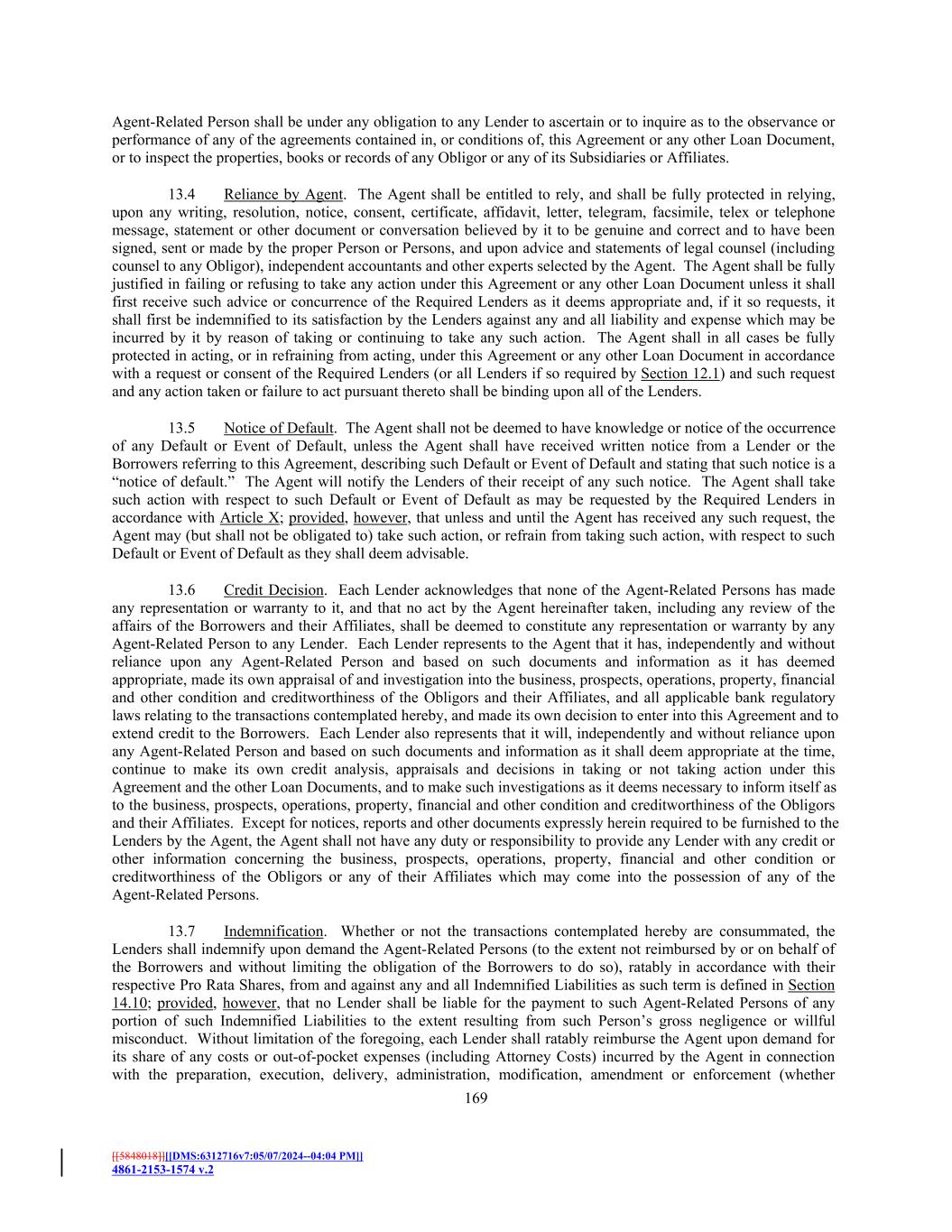 Agent-Related Person shall be under any obligation to any Lender to ascertain or to inquire as to the observance or performance of any of the agreements contained in, or conditions of, this Agreement or any other Loan Document, or to inspect the properties, books or records of any Obligor or any of its Subsidiaries or Affiliates. 13.4 Reliance by Agent. The Agent shall be entitled to rely, and shall be fully protected in relying, upon any writing, resolution, notice, consent, certificate, affidavit, letter, telegram, facsimile, telex or telephone message, statement or other document or conversation believed by it to be genuine and correct and to have been signed, sent or made by the proper Person or Persons, and upon advice and statements of legal counsel (including counsel to any Obligor), independent accountants and other experts selected by the Agent. The Agent shall be fully justified in failing or refusing to take any action under this Agreement or any other Loan Document unless it shall first receive such advice or concurrence of the Required Lenders as it deems appropriate and, if it so requests, it shall first be indemnified to its satisfaction by the Lenders against any and all liability and expense which may be incurred by it by reason of taking or continuing to take any such action. The Agent shall in all cases be fully protected in acting, or in refraining from acting, under this Agreement or any other Loan Document in accordance with a request or consent of the Required Lenders (or all Lenders if so required by Section 12.1) and such request and any action taken or failure to act pursuant thereto shall be binding upon all of the Lenders. 13.5 Notice of Default. The Agent shall not be deemed to have knowledge or notice of the occurrence of any Default or Event of Default, unless the Agent shall have received written notice from a Lender or the Borrowers referring to this Agreement, describing such Default or Event of Default and stating that such notice is a “notice of default.” The Agent will notify the Lenders of their receipt of any such notice. The Agent shall take such action with respect to such Default or Event of Default as may be requested by the Required Lenders in accordance with Article X; provided, however, that unless and until the Agent has received any such request, the Agent may (but shall not be obligated to) take such action, or refrain from taking such action, with respect to such Default or Event of Default as they shall deem advisable. 13.6 Credit Decision. Each Lender acknowledges that none of the Agent-Related Persons has made any representation or warranty to it, and that no act by the Agent hereinafter taken, including any review of the affairs of the Borrowers and their Affiliates, shall be deemed to constitute any representation or warranty by any Agent-Related Person to any Lender. Each Lender represents to the Agent that it has, independently and without reliance upon any Agent-Related Person and based on such documents and information as it has deemed appropriate, made its own appraisal of and investigation into the business, prospects, operations, property, financial and other condition and creditworthiness of the Obligors and their Affiliates, and all applicable bank regulatory laws relating to the transactions contemplated hereby, and made its own decision to enter into this Agreement and to extend credit to the Borrowers. Each Lender also represents that it will, independently and without reliance upon any Agent-Related Person and based on such documents and information as it shall deem appropriate at the time, continue to make its own credit analysis, appraisals and decisions in taking or not taking action under this Agreement and the other Loan Documents, and to make such investigations as it deems necessary to inform itself as to the business, prospects, operations, property, financial and other condition and creditworthiness of the Obligors and their Affiliates. Except for notices, reports and other documents expressly herein required to be furnished to the Lenders by the Agent, the Agent shall not have any duty or responsibility to provide any Lender with any credit or other information concerning the business, prospects, operations, property, financial and other condition or creditworthiness of the Obligors or any of their Affiliates which may come into the possession of any of the Agent-Related Persons. 13.7 Indemnification. Whether or not the transactions contemplated hereby are consummated, the Lenders shall indemnify upon demand the Agent-Related Persons (to the extent not reimbursed by or on behalf of the Borrowers and without limiting the obligation of the Borrowers to do so), ratably in accordance with their respective Pro Rata Shares, from and against any and all Indemnified Liabilities as such term is defined in Section 14.10; provided, however, that no Lender shall be liable for the payment to such Agent-Related Persons of any portion of such Indemnified Liabilities to the extent resulting from such Person’s gross negligence or willful misconduct. Without limitation of the foregoing, each Lender shall ratably reimburse the Agent upon demand for its share of any costs or out-of-pocket expenses (including Attorney Costs) incurred by the Agent in connection with the preparation, execution, delivery, administration, modification, amendment or enforcement (whether 169 [[5848018]][[DMS:6312716v7:05/07/2024--04:04 PM]] 4861-2153-1574 v.2