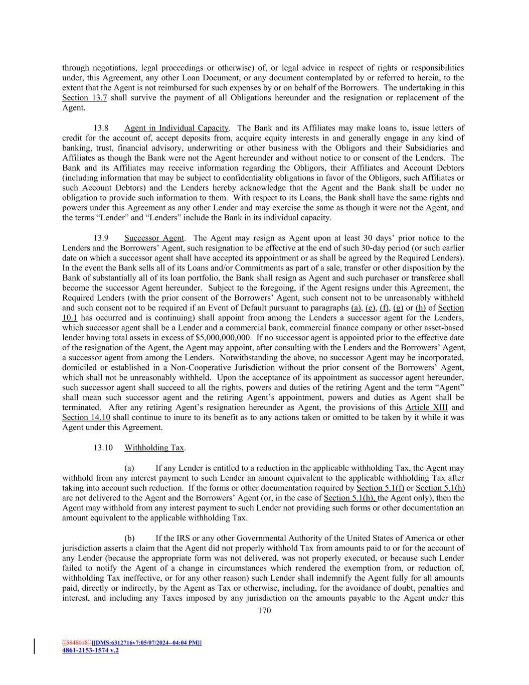 through negotiations, legal proceedings or otherwise) of, or legal advice in respect of rights or responsibilities under, this Agreement, any other Loan Document, or any document contemplated by or referred to herein, to the extent that the Agent is not reimbursed for such expenses by or on behalf of the Borrowers. The undertaking in this Section 13.7 shall survive the payment of all Obligations hereunder and the resignation or replacement of the Agent. 13.8 Agent in Individual Capacity. The Bank and its Affiliates may make loans to, issue letters of credit for the account of, accept deposits from, acquire equity interests in and generally engage in any kind of banking, trust, financial advisory, underwriting or other business with the Obligors and their Subsidiaries and Affiliates as though the Bank were not the Agent hereunder and without notice to or consent of the Lenders. The Bank and its Affiliates may receive information regarding the Obligors, their Affiliates and Account Debtors (including information that may be subject to confidentiality obligations in favor of the Obligors, such Affiliates or such Account Debtors) and the Lenders hereby acknowledge that the Agent and the Bank shall be under no obligation to provide such information to them. With respect to its Loans, the Bank shall have the same rights and powers under this Agreement as any other Lender and may exercise the same as though it were not the Agent, and the terms “Lender” and “Lenders” include the Bank in its individual capacity. 13.9 Successor Agent. The Agent may resign as Agent upon at least 30 days’ prior notice to the Lenders and the Borrowers’ Agent, such resignation to be effective at the end of such 30-day period (or such earlier date on which a successor agent shall have accepted its appointment or as shall be agreed by the Required Lenders). In the event the Bank sells all of its Loans and/or Commitments as part of a sale, transfer or other disposition by the Bank of substantially all of its loan portfolio, the Bank shall resign as Agent and such purchaser or transferee shall become the successor Agent hereunder. Subject to the foregoing, if the Agent resigns under this Agreement, the Required Lenders (with the prior consent of the Borrowers’ Agent, such consent not to be unreasonably withheld and such consent not to be required if an Event of Default pursuant to paragraphs (a), (e), (f), (g) or (h) of Section 10.1 has occurred and is continuing) shall appoint from among the Lenders a successor agent for the Lenders, which successor agent shall be a Lender and a commercial bank, commercial finance company or other asset-based lender having total assets in excess of $5,000,000,000. If no successor agent is appointed prior to the effective date of the resignation of the Agent, the Agent may appoint, after consulting with the Lenders and the Borrowers’ Agent, a successor agent from among the Lenders. Notwithstanding the above, no successor Agent may be incorporated, domiciled or established in a Non-Cooperative Jurisdiction without the prior consent of the Borrowers’ Agent, which shall not be unreasonably withheld. Upon the acceptance of its appointment as successor agent hereunder, such successor agent shall succeed to all the rights, powers and duties of the retiring Agent and the term “Agent” shall mean such successor agent and the retiring Agent’s appointment, powers and duties as Agent shall be terminated. After any retiring Agent’s resignation hereunder as Agent, the provisions of this Article XIII and Section 14.10 shall continue to inure to its benefit as to any actions taken or omitted to be taken by it while it was Agent under this Agreement. 13.10 Withholding Tax. (a) If any Lender is entitled to a reduction in the applicable withholding Tax, the Agent may withhold from any interest payment to such Lender an amount equivalent to the applicable withholding Tax after taking into account such reduction. If the forms or other documentation required by Section 5.1(f) or Section 5.1(h) are not delivered to the Agent and the Borrowers’ Agent (or, in the case of Section 5.1(h), the Agent only), then the Agent may withhold from any interest payment to such Lender not providing such forms or other documentation an amount equivalent to the applicable withholding Tax. (b) If the IRS or any other Governmental Authority of the United States of America or other jurisdiction asserts a claim that the Agent did not properly withhold Tax from amounts paid to or for the account of any Lender (because the appropriate form was not delivered, was not properly executed, or because such Lender failed to notify the Agent of a change in circumstances which rendered the exemption from, or reduction of, withholding Tax ineffective, or for any other reason) such Lender shall indemnify the Agent fully for all amounts paid, directly or indirectly, by the Agent as Tax or otherwise, including, for the avoidance of doubt, penalties and interest, and including any Taxes imposed by any jurisdiction on the amounts payable to the Agent under this 170 [[5848018]][[DMS:6312716v7:05/07/2024--04:04 PM]] 4861-2153-1574 v.2