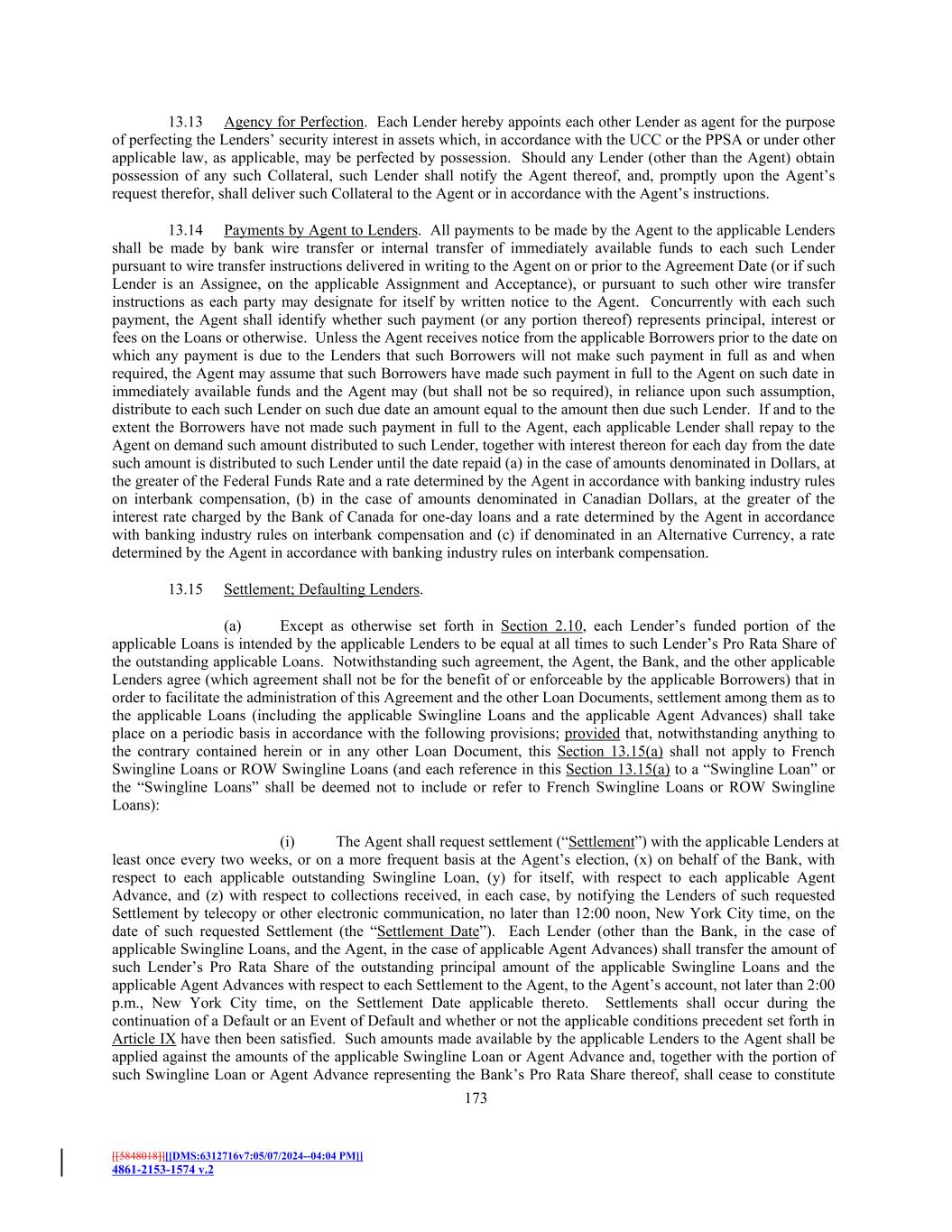 13.13 Agency for Perfection. Each Lender hereby appoints each other Lender as agent for the purpose of perfecting the Lenders’ security interest in assets which, in accordance with the UCC or the PPSA or under other applicable law, as applicable, may be perfected by possession. Should any Lender (other than the Agent) obtain possession of any such Collateral, such Lender shall notify the Agent thereof, and, promptly upon the Agent’s request therefor, shall deliver such Collateral to the Agent or in accordance with the Agent’s instructions. 13.14 Payments by Agent to Lenders. All payments to be made by the Agent to the applicable Lenders shall be made by bank wire transfer or internal transfer of immediately available funds to each such Lender pursuant to wire transfer instructions delivered in writing to the Agent on or prior to the Agreement Date (or if such Lender is an Assignee, on the applicable Assignment and Acceptance), or pursuant to such other wire transfer instructions as each party may designate for itself by written notice to the Agent. Concurrently with each such payment, the Agent shall identify whether such payment (or any portion thereof) represents principal, interest or fees on the Loans or otherwise. Unless the Agent receives notice from the applicable Borrowers prior to the date on which any payment is due to the Lenders that such Borrowers will not make such payment in full as and when required, the Agent may assume that such Borrowers have made such payment in full to the Agent on such date in immediately available funds and the Agent may (but shall not be so required), in reliance upon such assumption, distribute to each such Lender on such due date an amount equal to the amount then due such Lender. If and to the extent the Borrowers have not made such payment in full to the Agent, each applicable Lender shall repay to the Agent on demand such amount distributed to such Lender, together with interest thereon for each day from the date such amount is distributed to such Lender until the date repaid (a) in the case of amounts denominated in Dollars, at the greater of the Federal Funds Rate and a rate determined by the Agent in accordance with banking industry rules on interbank compensation, (b) in the case of amounts denominated in Canadian Dollars, at the greater of the interest rate charged by the Bank of Canada for one-day loans and a rate determined by the Agent in accordance with banking industry rules on interbank compensation and (c) if denominated in an Alternative Currency, a rate determined by the Agent in accordance with banking industry rules on interbank compensation. 13.15 Settlement; Defaulting Lenders. (a) Except as otherwise set forth in Section 2.10, each Lender’s funded portion of the applicable Loans is intended by the applicable Lenders to be equal at all times to such Lender’s Pro Rata Share of the outstanding applicable Loans. Notwithstanding such agreement, the Agent, the Bank, and the other applicable Lenders agree (which agreement shall not be for the benefit of or enforceable by the applicable Borrowers) that in order to facilitate the administration of this Agreement and the other Loan Documents, settlement among them as to the applicable Loans (including the applicable Swingline Loans and the applicable Agent Advances) shall take place on a periodic basis in accordance with the following provisions; provided that, notwithstanding anything to the contrary contained herein or in any other Loan Document, this Section 13.15(a) shall not apply to French Swingline Loans or ROW Swingline Loans (and each reference in this Section 13.15(a) to a “Swingline Loan” or the “Swingline Loans” shall be deemed not to include or refer to French Swingline Loans or ROW Swingline Loans): (i) The Agent shall request settlement (“Settlement”) with the applicable Lenders at least once every two weeks, or on a more frequent basis at the Agent’s election, (x) on behalf of the Bank, with respect to each applicable outstanding Swingline Loan, (y) for itself, with respect to each applicable Agent Advance, and (z) with respect to collections received, in each case, by notifying the Lenders of such requested Settlement by telecopy or other electronic communication, no later than 12:00 noon, New York City time, on the date of such requested Settlement (the “Settlement Date”). Each Lender (other than the Bank, in the case of applicable Swingline Loans, and the Agent, in the case of applicable Agent Advances) shall transfer the amount of such Lender’s Pro Rata Share of the outstanding principal amount of the applicable Swingline Loans and the applicable Agent Advances with respect to each Settlement to the Agent, to the Agent’s account, not later than 2:00 p.m., New York City time, on the Settlement Date applicable thereto. Settlements shall occur during the continuation of a Default or an Event of Default and whether or not the applicable conditions precedent set forth in Article IX have then been satisfied. Such amounts made available by the applicable Lenders to the Agent shall be applied against the amounts of the applicable Swingline Loan or Agent Advance and, together with the portion of such Swingline Loan or Agent Advance representing the Bank’s Pro Rata Share thereof, shall cease to constitute 173 [[5848018]][[DMS:6312716v7:05/07/2024--04:04 PM]] 4861-2153-1574 v.2