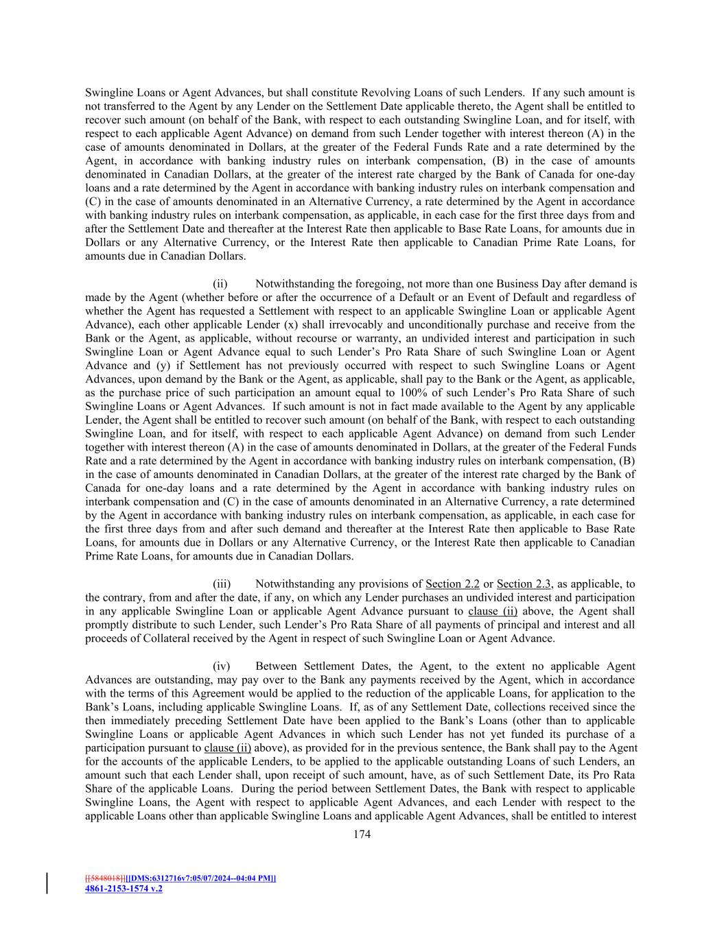 Swingline Loans or Agent Advances, but shall constitute Revolving Loans of such Lenders. If any such amount is not transferred to the Agent by any Lender on the Settlement Date applicable thereto, the Agent shall be entitled to recover such amount (on behalf of the Bank, with respect to each outstanding Swingline Loan, and for itself, with respect to each applicable Agent Advance) on demand from such Lender together with interest thereon (A) in the case of amounts denominated in Dollars, at the greater of the Federal Funds Rate and a rate determined by the Agent, in accordance with banking industry rules on interbank compensation, (B) in the case of amounts denominated in Canadian Dollars, at the greater of the interest rate charged by the Bank of Canada for one-day loans and a rate determined by the Agent in accordance with banking industry rules on interbank compensation and (C) in the case of amounts denominated in an Alternative Currency, a rate determined by the Agent in accordance with banking industry rules on interbank compensation, as applicable, in each case for the first three days from and after the Settlement Date and thereafter at the Interest Rate then applicable to Base Rate Loans, for amounts due in Dollars or any Alternative Currency, or the Interest Rate then applicable to Canadian Prime Rate Loans, for amounts due in Canadian Dollars. (ii) Notwithstanding the foregoing, not more than one Business Day after demand is made by the Agent (whether before or after the occurrence of a Default or an Event of Default and regardless of whether the Agent has requested a Settlement with respect to an applicable Swingline Loan or applicable Agent Advance), each other applicable Lender (x) shall irrevocably and unconditionally purchase and receive from the Bank or the Agent, as applicable, without recourse or warranty, an undivided interest and participation in such Swingline Loan or Agent Advance equal to such Lender’s Pro Rata Share of such Swingline Loan or Agent Advance and (y) if Settlement has not previously occurred with respect to such Swingline Loans or Agent Advances, upon demand by the Bank or the Agent, as applicable, shall pay to the Bank or the Agent, as applicable, as the purchase price of such participation an amount equal to 100% of such Lender’s Pro Rata Share of such Swingline Loans or Agent Advances. If such amount is not in fact made available to the Agent by any applicable Lender, the Agent shall be entitled to recover such amount (on behalf of the Bank, with respect to each outstanding Swingline Loan, and for itself, with respect to each applicable Agent Advance) on demand from such Lender together with interest thereon (A) in the case of amounts denominated in Dollars, at the greater of the Federal Funds Rate and a rate determined by the Agent in accordance with banking industry rules on interbank compensation, (B) in the case of amounts denominated in Canadian Dollars, at the greater of the interest rate charged by the Bank of Canada for one-day loans and a rate determined by the Agent in accordance with banking industry rules on interbank compensation and (C) in the case of amounts denominated in an Alternative Currency, a rate determined by the Agent in accordance with banking industry rules on interbank compensation, as applicable, in each case for the first three days from and after such demand and thereafter at the Interest Rate then applicable to Base Rate Loans, for amounts due in Dollars or any Alternative Currency, or the Interest Rate then applicable to Canadian Prime Rate Loans, for amounts due in Canadian Dollars. (iii) Notwithstanding any provisions of Section 2.2 or Section 2.3, as applicable, to the contrary, from and after the date, if any, on which any Lender purchases an undivided interest and participation in any applicable Swingline Loan or applicable Agent Advance pursuant to clause (ii) above, the Agent shall promptly distribute to such Lender, such Lender’s Pro Rata Share of all payments of principal and interest and all proceeds of Collateral received by the Agent in respect of such Swingline Loan or Agent Advance. (iv) Between Settlement Dates, the Agent, to the extent no applicable Agent Advances are outstanding, may pay over to the Bank any payments received by the Agent, which in accordance with the terms of this Agreement would be applied to the reduction of the applicable Loans, for application to the Bank’s Loans, including applicable Swingline Loans. If, as of any Settlement Date, collections received since the then immediately preceding Settlement Date have been applied to the Bank’s Loans (other than to applicable Swingline Loans or applicable Agent Advances in which such Lender has not yet funded its purchase of a participation pursuant to clause (ii) above), as provided for in the previous sentence, the Bank shall pay to the Agent for the accounts of the applicable Lenders, to be applied to the applicable outstanding Loans of such Lenders, an amount such that each Lender shall, upon receipt of such amount, have, as of such Settlement Date, its Pro Rata Share of the applicable Loans. During the period between Settlement Dates, the Bank with respect to applicable Swingline Loans, the Agent with respect to applicable Agent Advances, and each Lender with respect to the applicable Loans other than applicable Swingline Loans and applicable Agent Advances, shall be entitled to interest 174 [[5848018]][[DMS:6312716v7:05/07/2024--04:04 PM]] 4861-2153-1574 v.2
