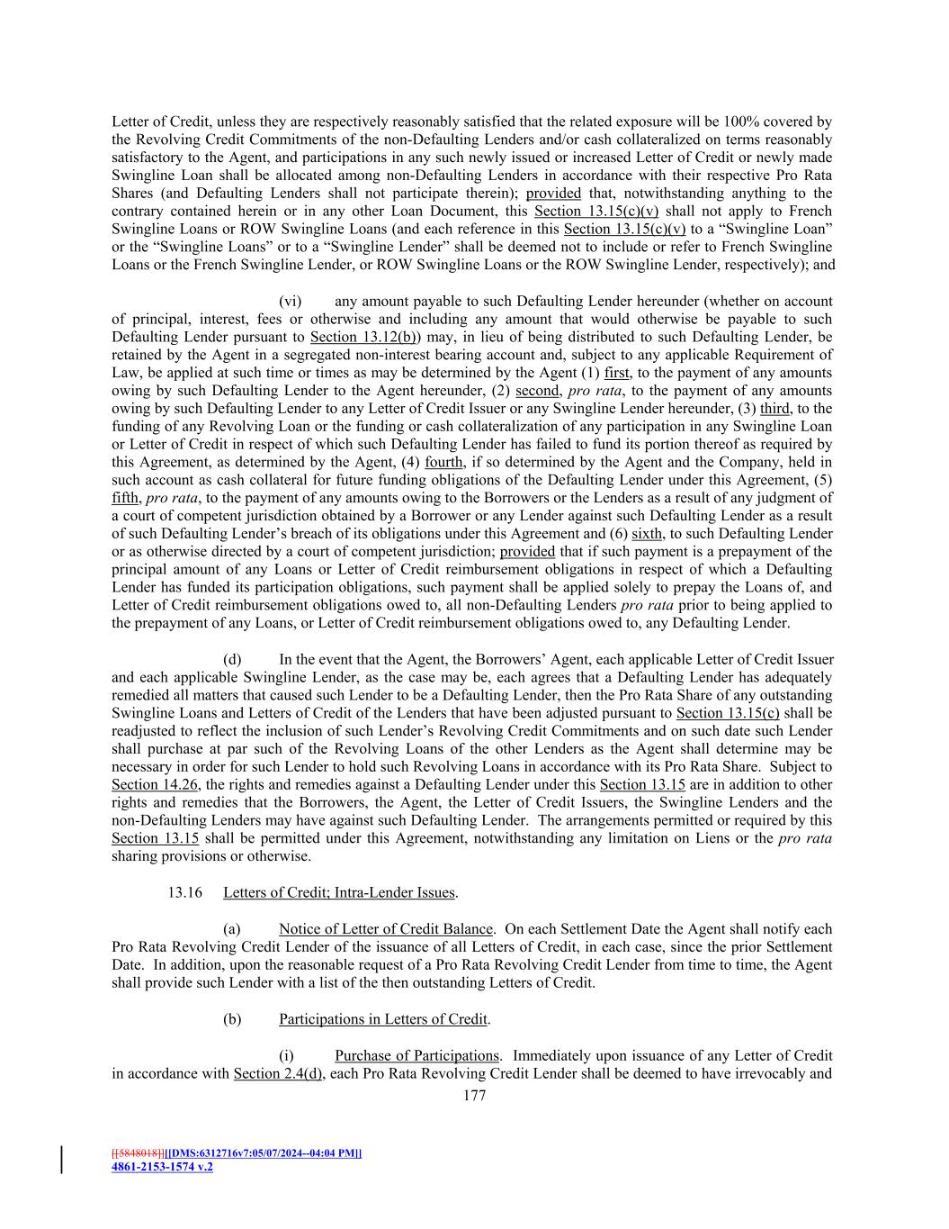 Letter of Credit, unless they are respectively reasonably satisfied that the related exposure will be 100% covered by the Revolving Credit Commitments of the non-Defaulting Lenders and/or cash collateralized on terms reasonably satisfactory to the Agent, and participations in any such newly issued or increased Letter of Credit or newly made Swingline Loan shall be allocated among non-Defaulting Lenders in accordance with their respective Pro Rata Shares (and Defaulting Lenders shall not participate therein); provided that, notwithstanding anything to the contrary contained herein or in any other Loan Document, this Section 13.15(c)(v) shall not apply to French Swingline Loans or ROW Swingline Loans (and each reference in this Section 13.15(c)(v) to a “Swingline Loan” or the “Swingline Loans” or to a “Swingline Lender” shall be deemed not to include or refer to French Swingline Loans or the French Swingline Lender, or ROW Swingline Loans or the ROW Swingline Lender, respectively); and (vi) any amount payable to such Defaulting Lender hereunder (whether on account of principal, interest, fees or otherwise and including any amount that would otherwise be payable to such Defaulting Lender pursuant to Section 13.12(b)) may, in lieu of being distributed to such Defaulting Lender, be retained by the Agent in a segregated non-interest bearing account and, subject to any applicable Requirement of Law, be applied at such time or times as may be determined by the Agent (1) first, to the payment of any amounts owing by such Defaulting Lender to the Agent hereunder, (2) second, pro rata, to the payment of any amounts owing by such Defaulting Lender to any Letter of Credit Issuer or any Swingline Lender hereunder, (3) third, to the funding of any Revolving Loan or the funding or cash collateralization of any participation in any Swingline Loan or Letter of Credit in respect of which such Defaulting Lender has failed to fund its portion thereof as required by this Agreement, as determined by the Agent, (4) fourth, if so determined by the Agent and the Company, held in such account as cash collateral for future funding obligations of the Defaulting Lender under this Agreement, (5) fifth, pro rata, to the payment of any amounts owing to the Borrowers or the Lenders as a result of any judgment of a court of competent jurisdiction obtained by a Borrower or any Lender against such Defaulting Lender as a result of such Defaulting Lender’s breach of its obligations under this Agreement and (6) sixth, to such Defaulting Lender or as otherwise directed by a court of competent jurisdiction; provided that if such payment is a prepayment of the principal amount of any Loans or Letter of Credit reimbursement obligations in respect of which a Defaulting Lender has funded its participation obligations, such payment shall be applied solely to prepay the Loans of, and Letter of Credit reimbursement obligations owed to, all non-Defaulting Lenders pro rata prior to being applied to the prepayment of any Loans, or Letter of Credit reimbursement obligations owed to, any Defaulting Lender. (d) In the event that the Agent, the Borrowers’ Agent, each applicable Letter of Credit Issuer and each applicable Swingline Lender, as the case may be, each agrees that a Defaulting Lender has adequately remedied all matters that caused such Lender to be a Defaulting Lender, then the Pro Rata Share of any outstanding Swingline Loans and Letters of Credit of the Lenders that have been adjusted pursuant to Section 13.15(c) shall be readjusted to reflect the inclusion of such Lender’s Revolving Credit Commitments and on such date such Lender shall purchase at par such of the Revolving Loans of the other Lenders as the Agent shall determine may be necessary in order for such Lender to hold such Revolving Loans in accordance with its Pro Rata Share. Subject to Section 14.26, the rights and remedies against a Defaulting Lender under this Section 13.15 are in addition to other rights and remedies that the Borrowers, the Agent, the Letter of Credit Issuers, the Swingline Lenders and the non-Defaulting Lenders may have against such Defaulting Lender. The arrangements permitted or required by this Section 13.15 shall be permitted under this Agreement, notwithstanding any limitation on Liens or the pro rata sharing provisions or otherwise. 13.16 Letters of Credit; Intra-Lender Issues. (a) Notice of Letter of Credit Balance. On each Settlement Date the Agent shall notify each Pro Rata Revolving Credit Lender of the issuance of all Letters of Credit, in each case, since the prior Settlement Date. In addition, upon the reasonable request of a Pro Rata Revolving Credit Lender from time to time, the Agent shall provide such Lender with a list of the then outstanding Letters of Credit. (b) Participations in Letters of Credit. (i) Purchase of Participations. Immediately upon issuance of any Letter of Credit in accordance with Section 2.4(d), each Pro Rata Revolving Credit Lender shall be deemed to have irrevocably and 177 [[5848018]][[DMS:6312716v7:05/07/2024--04:04 PM]] 4861-2153-1574 v.2