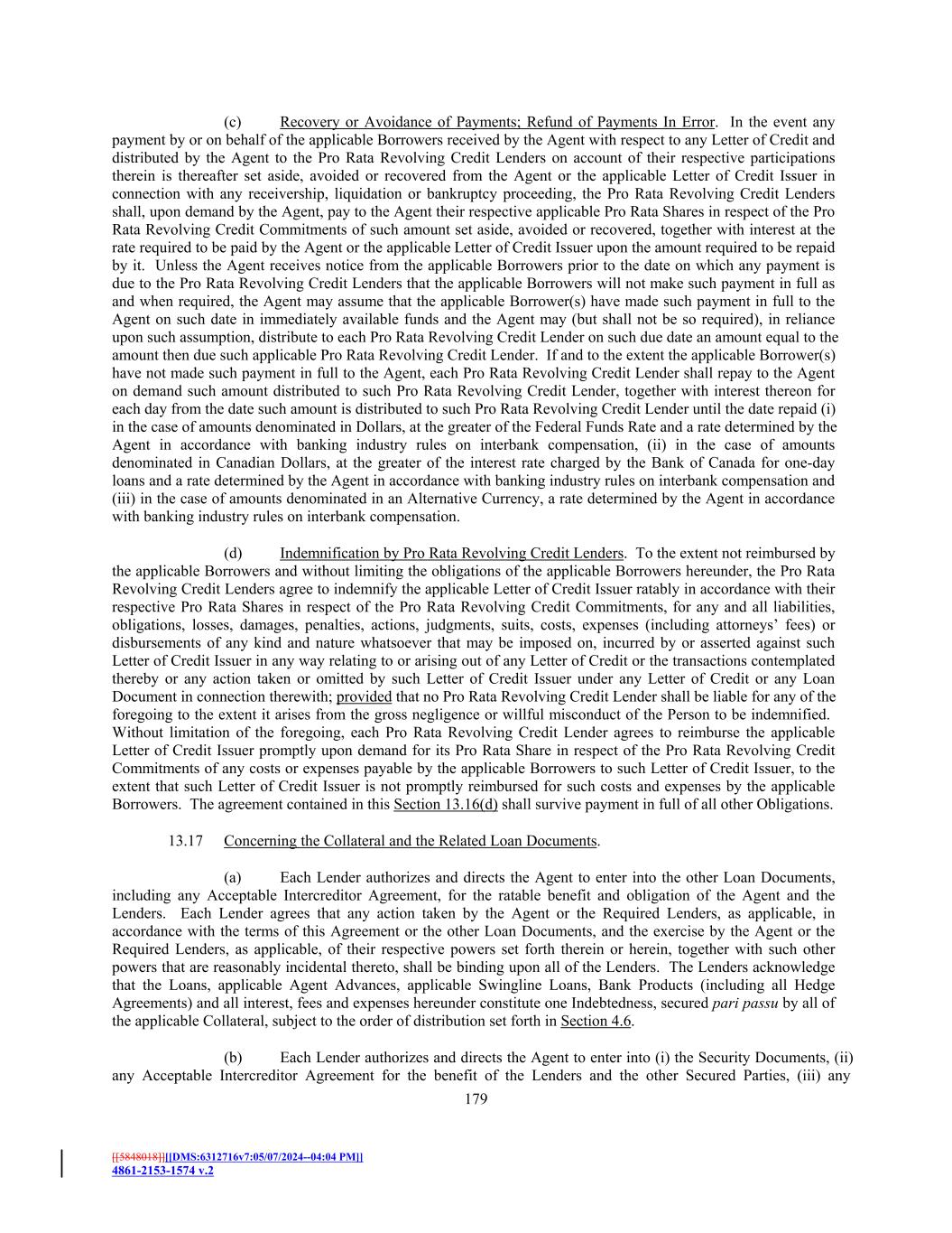 (c) Recovery or Avoidance of Payments; Refund of Payments In Error. In the event any payment by or on behalf of the applicable Borrowers received by the Agent with respect to any Letter of Credit and distributed by the Agent to the Pro Rata Revolving Credit Lenders on account of their respective participations therein is thereafter set aside, avoided or recovered from the Agent or the applicable Letter of Credit Issuer in connection with any receivership, liquidation or bankruptcy proceeding, the Pro Rata Revolving Credit Lenders shall, upon demand by the Agent, pay to the Agent their respective applicable Pro Rata Shares in respect of the Pro Rata Revolving Credit Commitments of such amount set aside, avoided or recovered, together with interest at the rate required to be paid by the Agent or the applicable Letter of Credit Issuer upon the amount required to be repaid by it. Unless the Agent receives notice from the applicable Borrowers prior to the date on which any payment is due to the Pro Rata Revolving Credit Lenders that the applicable Borrowers will not make such payment in full as and when required, the Agent may assume that the applicable Borrower(s) have made such payment in full to the Agent on such date in immediately available funds and the Agent may (but shall not be so required), in reliance upon such assumption, distribute to each Pro Rata Revolving Credit Lender on such due date an amount equal to the amount then due such applicable Pro Rata Revolving Credit Lender. If and to the extent the applicable Borrower(s) have not made such payment in full to the Agent, each Pro Rata Revolving Credit Lender shall repay to the Agent on demand such amount distributed to such Pro Rata Revolving Credit Lender, together with interest thereon for each day from the date such amount is distributed to such Pro Rata Revolving Credit Lender until the date repaid (i) in the case of amounts denominated in Dollars, at the greater of the Federal Funds Rate and a rate determined by the Agent in accordance with banking industry rules on interbank compensation, (ii) in the case of amounts denominated in Canadian Dollars, at the greater of the interest rate charged by the Bank of Canada for one-day loans and a rate determined by the Agent in accordance with banking industry rules on interbank compensation and (iii) in the case of amounts denominated in an Alternative Currency, a rate determined by the Agent in accordance with banking industry rules on interbank compensation. (d) Indemnification by Pro Rata Revolving Credit Lenders. To the extent not reimbursed by the applicable Borrowers and without limiting the obligations of the applicable Borrowers hereunder, the Pro Rata Revolving Credit Lenders agree to indemnify the applicable Letter of Credit Issuer ratably in accordance with their respective Pro Rata Shares in respect of the Pro Rata Revolving Credit Commitments, for any and all liabilities, obligations, losses, damages, penalties, actions, judgments, suits, costs, expenses (including attorneys’ fees) or disbursements of any kind and nature whatsoever that may be imposed on, incurred by or asserted against such Letter of Credit Issuer in any way relating to or arising out of any Letter of Credit or the transactions contemplated thereby or any action taken or omitted by such Letter of Credit Issuer under any Letter of Credit or any Loan Document in connection therewith; provided that no Pro Rata Revolving Credit Lender shall be liable for any of the foregoing to the extent it arises from the gross negligence or willful misconduct of the Person to be indemnified. Without limitation of the foregoing, each Pro Rata Revolving Credit Lender agrees to reimburse the applicable Letter of Credit Issuer promptly upon demand for its Pro Rata Share in respect of the Pro Rata Revolving Credit Commitments of any costs or expenses payable by the applicable Borrowers to such Letter of Credit Issuer, to the extent that such Letter of Credit Issuer is not promptly reimbursed for such costs and expenses by the applicable Borrowers. The agreement contained in this Section 13.16(d) shall survive payment in full of all other Obligations. 13.17 Concerning the Collateral and the Related Loan Documents. (a) Each Lender authorizes and directs the Agent to enter into the other Loan Documents, including any Acceptable Intercreditor Agreement, for the ratable benefit and obligation of the Agent and the Lenders. Each Lender agrees that any action taken by the Agent or the Required Lenders, as applicable, in accordance with the terms of this Agreement or the other Loan Documents, and the exercise by the Agent or the Required Lenders, as applicable, of their respective powers set forth therein or herein, together with such other powers that are reasonably incidental thereto, shall be binding upon all of the Lenders. The Lenders acknowledge that the Loans, applicable Agent Advances, applicable Swingline Loans, Bank Products (including all Hedge Agreements) and all interest, fees and expenses hereunder constitute one Indebtedness, secured pari passu by all of the applicable Collateral, subject to the order of distribution set forth in Section 4.6. (b) Each Lender authorizes and directs the Agent to enter into (i) the Security Documents, (ii) any Acceptable Intercreditor Agreement for the benefit of the Lenders and the other Secured Parties, (iii) any 179 [[5848018]][[DMS:6312716v7:05/07/2024--04:04 PM]] 4861-2153-1574 v.2