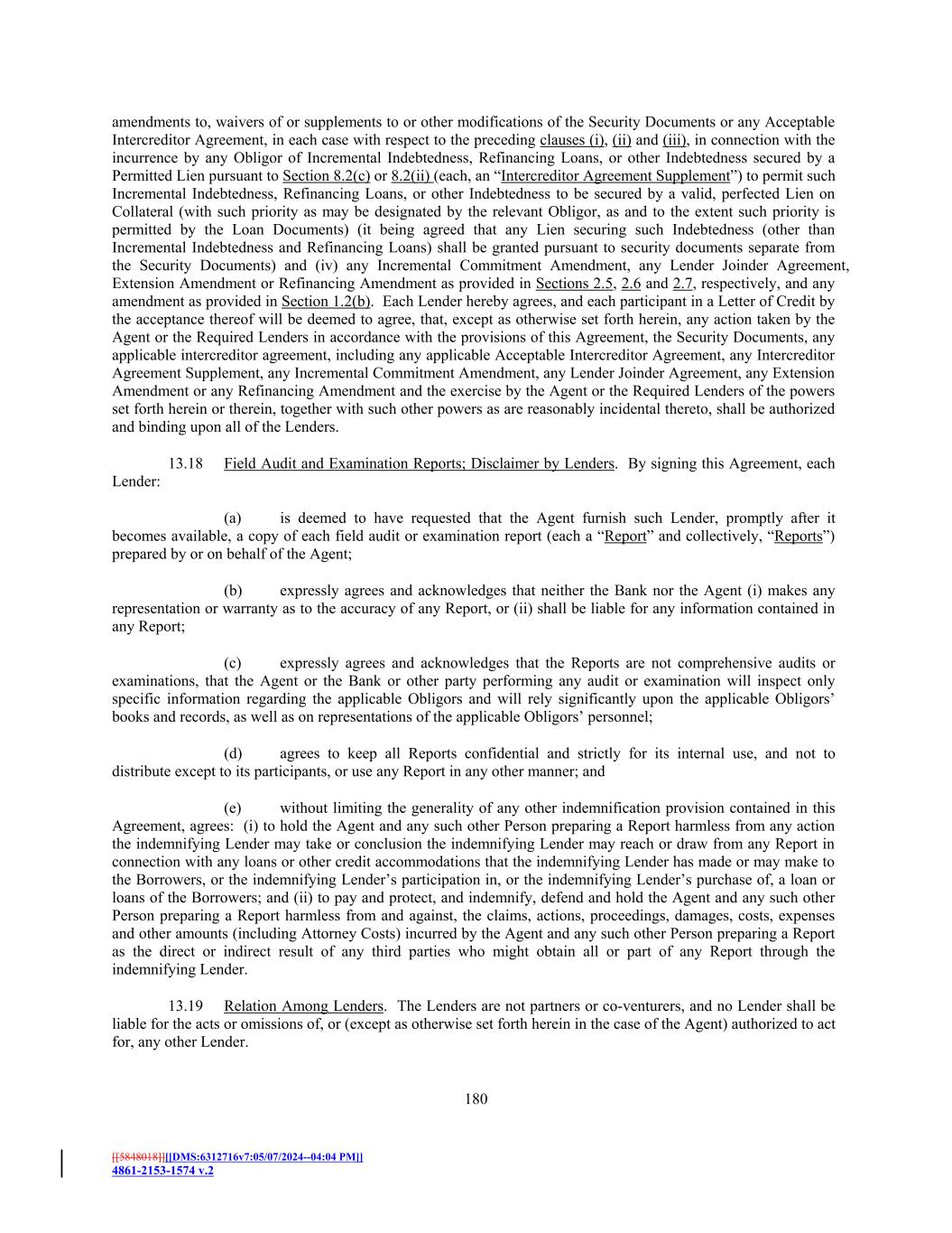amendments to, waivers of or supplements to or other modifications of the Security Documents or any Acceptable Intercreditor Agreement, in each case with respect to the preceding clauses (i), (ii) and (iii), in connection with the incurrence by any Obligor of Incremental Indebtedness, Refinancing Loans, or other Indebtedness secured by a Permitted Lien pursuant to Section 8.2(c) or 8.2(ii) (each, an “Intercreditor Agreement Supplement”) to permit such Incremental Indebtedness, Refinancing Loans, or other Indebtedness to be secured by a valid, perfected Lien on Collateral (with such priority as may be designated by the relevant Obligor, as and to the extent such priority is permitted by the Loan Documents) (it being agreed that any Lien securing such Indebtedness (other than Incremental Indebtedness and Refinancing Loans) shall be granted pursuant to security documents separate from the Security Documents) and (iv) any Incremental Commitment Amendment, any Lender Joinder Agreement, Extension Amendment or Refinancing Amendment as provided in Sections 2.5, 2.6 and 2.7, respectively, and any amendment as provided in Section 1.2(b). Each Lender hereby agrees, and each participant in a Letter of Credit by the acceptance thereof will be deemed to agree, that, except as otherwise set forth herein, any action taken by the Agent or the Required Lenders in accordance with the provisions of this Agreement, the Security Documents, any applicable intercreditor agreement, including any applicable Acceptable Intercreditor Agreement, any Intercreditor Agreement Supplement, any Incremental Commitment Amendment, any Lender Joinder Agreement, any Extension Amendment or any Refinancing Amendment and the exercise by the Agent or the Required Lenders of the powers set forth herein or therein, together with such other powers as are reasonably incidental thereto, shall be authorized and binding upon all of the Lenders. 13.18 Field Audit and Examination Reports; Disclaimer by Lenders. By signing this Agreement, each Lender: (a) is deemed to have requested that the Agent furnish such Lender, promptly after it becomes available, a copy of each field audit or examination report (each a “Report” and collectively, “Reports”) prepared by or on behalf of the Agent; (b) expressly agrees and acknowledges that neither the Bank nor the Agent (i) makes any representation or warranty as to the accuracy of any Report, or (ii) shall be liable for any information contained in any Report; (c) expressly agrees and acknowledges that the Reports are not comprehensive audits or examinations, that the Agent or the Bank or other party performing any audit or examination will inspect only specific information regarding the applicable Obligors and will rely significantly upon the applicable Obligors’ books and records, as well as on representations of the applicable Obligors’ personnel; (d) agrees to keep all Reports confidential and strictly for its internal use, and not to distribute except to its participants, or use any Report in any other manner; and (e) without limiting the generality of any other indemnification provision contained in this Agreement, agrees: (i) to hold the Agent and any such other Person preparing a Report harmless from any action the indemnifying Lender may take or conclusion the indemnifying Lender may reach or draw from any Report in connection with any loans or other credit accommodations that the indemnifying Lender has made or may make to the Borrowers, or the indemnifying Lender’s participation in, or the indemnifying Lender’s purchase of, a loan or loans of the Borrowers; and (ii) to pay and protect, and indemnify, defend and hold the Agent and any such other Person preparing a Report harmless from and against, the claims, actions, proceedings, damages, costs, expenses and other amounts (including Attorney Costs) incurred by the Agent and any such other Person preparing a Report as the direct or indirect result of any third parties who might obtain all or part of any Report through the indemnifying Lender. 13.19 Relation Among Lenders. The Lenders are not partners or co-venturers, and no Lender shall be liable for the acts or omissions of, or (except as otherwise set forth herein in the case of the Agent) authorized to act for, any other Lender. 180 [[5848018]][[DMS:6312716v7:05/07/2024--04:04 PM]] 4861-2153-1574 v.2