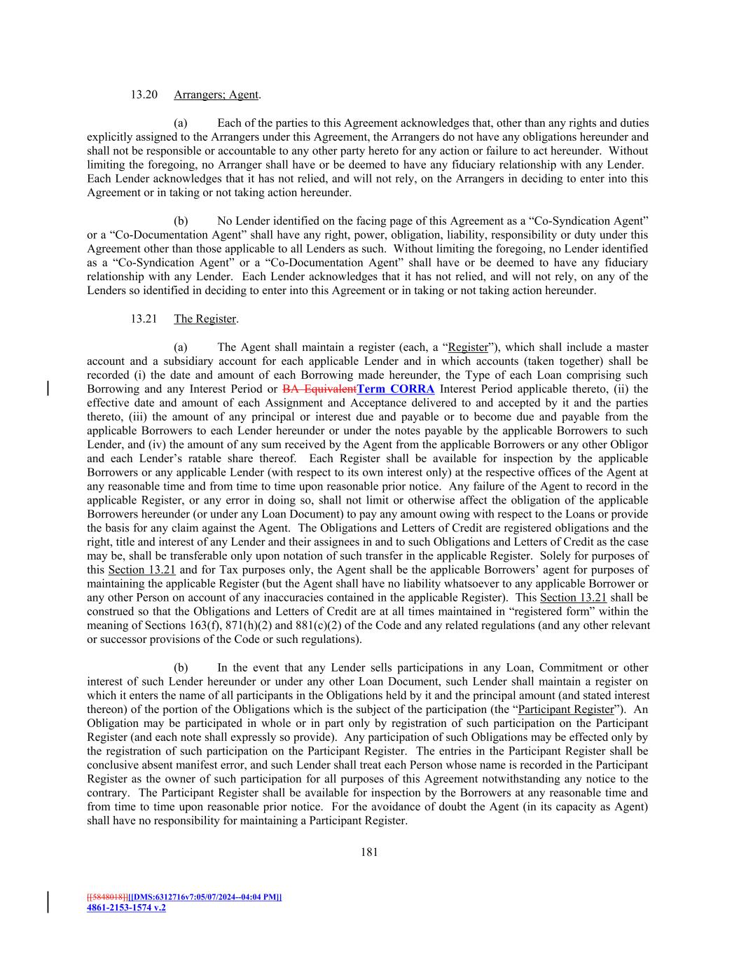 13.20 Arrangers; Agent. (a) Each of the parties to this Agreement acknowledges that, other than any rights and duties explicitly assigned to the Arrangers under this Agreement, the Arrangers do not have any obligations hereunder and shall not be responsible or accountable to any other party hereto for any action or failure to act hereunder. Without limiting the foregoing, no Arranger shall have or be deemed to have any fiduciary relationship with any Lender. Each Lender acknowledges that it has not relied, and will not rely, on the Arrangers in deciding to enter into this Agreement or in taking or not taking action hereunder. (b) No Lender identified on the facing page of this Agreement as a “Co-Syndication Agent” or a “Co-Documentation Agent” shall have any right, power, obligation, liability, responsibility or duty under this Agreement other than those applicable to all Lenders as such. Without limiting the foregoing, no Lender identified as a “Co-Syndication Agent” or a “Co-Documentation Agent” shall have or be deemed to have any fiduciary relationship with any Lender. Each Lender acknowledges that it has not relied, and will not rely, on any of the Lenders so identified in deciding to enter into this Agreement or in taking or not taking action hereunder. 13.21 The Register. (a) The Agent shall maintain a register (each, a “Register”), which shall include a master account and a subsidiary account for each applicable Lender and in which accounts (taken together) shall be recorded (i) the date and amount of each Borrowing made hereunder, the Type of each Loan comprising such Borrowing and any Interest Period or BA EquivalentTerm CORRA Interest Period applicable thereto, (ii) the effective date and amount of each Assignment and Acceptance delivered to and accepted by it and the parties thereto, (iii) the amount of any principal or interest due and payable or to become due and payable from the applicable Borrowers to each Lender hereunder or under the notes payable by the applicable Borrowers to such Lender, and (iv) the amount of any sum received by the Agent from the applicable Borrowers or any other Obligor and each Lender’s ratable share thereof. Each Register shall be available for inspection by the applicable Borrowers or any applicable Lender (with respect to its own interest only) at the respective offices of the Agent at any reasonable time and from time to time upon reasonable prior notice. Any failure of the Agent to record in the applicable Register, or any error in doing so, shall not limit or otherwise affect the obligation of the applicable Borrowers hereunder (or under any Loan Document) to pay any amount owing with respect to the Loans or provide the basis for any claim against the Agent. The Obligations and Letters of Credit are registered obligations and the right, title and interest of any Lender and their assignees in and to such Obligations and Letters of Credit as the case may be, shall be transferable only upon notation of such transfer in the applicable Register. Solely for purposes of this Section 13.21 and for Tax purposes only, the Agent shall be the applicable Borrowers’ agent for purposes of maintaining the applicable Register (but the Agent shall have no liability whatsoever to any applicable Borrower or any other Person on account of any inaccuracies contained in the applicable Register). This Section 13.21 shall be construed so that the Obligations and Letters of Credit are at all times maintained in “registered form” within the meaning of Sections 163(f), 871(h)(2) and 881(c)(2) of the Code and any related regulations (and any other relevant or successor provisions of the Code or such regulations). (b) In the event that any Lender sells participations in any Loan, Commitment or other interest of such Lender hereunder or under any other Loan Document, such Lender shall maintain a register on which it enters the name of all participants in the Obligations held by it and the principal amount (and stated interest thereon) of the portion of the Obligations which is the subject of the participation (the “Participant Register”). An Obligation may be participated in whole or in part only by registration of such participation on the Participant Register (and each note shall expressly so provide). Any participation of such Obligations may be effected only by the registration of such participation on the Participant Register. The entries in the Participant Register shall be conclusive absent manifest error, and such Lender shall treat each Person whose name is recorded in the Participant Register as the owner of such participation for all purposes of this Agreement notwithstanding any notice to the contrary. The Participant Register shall be available for inspection by the Borrowers at any reasonable time and from time to time upon reasonable prior notice. For the avoidance of doubt the Agent (in its capacity as Agent) shall have no responsibility for maintaining a Participant Register. 181 [[5848018]][[DMS:6312716v7:05/07/2024--04:04 PM]] 4861-2153-1574 v.2