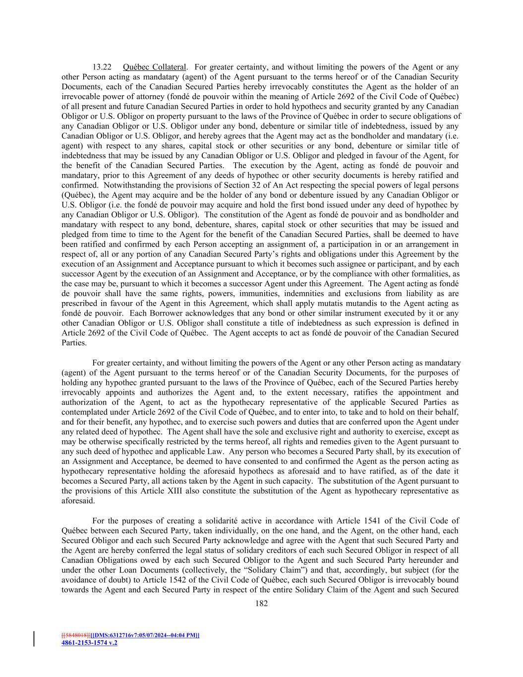 13.22 Québec Collateral. For greater certainty, and without limiting the powers of the Agent or any other Person acting as mandatary (agent) of the Agent pursuant to the terms hereof or of the Canadian Security Documents, each of the Canadian Secured Parties hereby irrevocably constitutes the Agent as the holder of an irrevocable power of attorney (fondé de pouvoir within the meaning of Article 2692 of the Civil Code of Québec) of all present and future Canadian Secured Parties in order to hold hypothecs and security granted by any Canadian Obligor or U.S. Obligor on property pursuant to the laws of the Province of Québec in order to secure obligations of any Canadian Obligor or U.S. Obligor under any bond, debenture or similar title of indebtedness, issued by any Canadian Obligor or U.S. Obligor, and hereby agrees that the Agent may act as the bondholder and mandatary (i.e. agent) with respect to any shares, capital stock or other securities or any bond, debenture or similar title of indebtedness that may be issued by any Canadian Obligor or U.S. Obligor and pledged in favour of the Agent, for the benefit of the Canadian Secured Parties. The execution by the Agent, acting as fondé de pouvoir and mandatary, prior to this Agreement of any deeds of hypothec or other security documents is hereby ratified and confirmed. Notwithstanding the provisions of Section 32 of An Act respecting the special powers of legal persons (Québec), the Agent may acquire and be the holder of any bond or debenture issued by any Canadian Obligor or U.S. Obligor (i.e. the fondé de pouvoir may acquire and hold the first bond issued under any deed of hypothec by any Canadian Obligor or U.S. Obligor). The constitution of the Agent as fondé de pouvoir and as bondholder and mandatary with respect to any bond, debenture, shares, capital stock or other securities that may be issued and pledged from time to time to the Agent for the benefit of the Canadian Secured Parties, shall be deemed to have been ratified and confirmed by each Person accepting an assignment of, a participation in or an arrangement in respect of, all or any portion of any Canadian Secured Party’s rights and obligations under this Agreement by the execution of an Assignment and Acceptance pursuant to which it becomes such assignee or participant, and by each successor Agent by the execution of an Assignment and Acceptance, or by the compliance with other formalities, as the case may be, pursuant to which it becomes a successor Agent under this Agreement. The Agent acting as fondé de pouvoir shall have the same rights, powers, immunities, indemnities and exclusions from liability as are prescribed in favour of the Agent in this Agreement, which shall apply mutatis mutandis to the Agent acting as fondé de pouvoir. Each Borrower acknowledges that any bond or other similar instrument executed by it or any other Canadian Obligor or U.S. Obligor shall constitute a title of indebtedness as such expression is defined in Article 2692 of the Civil Code of Québec. The Agent accepts to act as fondé de pouvoir of the Canadian Secured Parties. For greater certainty, and without limiting the powers of the Agent or any other Person acting as mandatary (agent) of the Agent pursuant to the terms hereof or of the Canadian Security Documents, for the purposes of holding any hypothec granted pursuant to the laws of the Province of Québec, each of the Secured Parties hereby irrevocably appoints and authorizes the Agent and, to the extent necessary, ratifies the appointment and authorization of the Agent, to act as the hypothecary representative of the applicable Secured Parties as contemplated under Article 2692 of the Civil Code of Québec, and to enter into, to take and to hold on their behalf, and for their benefit, any hypothec, and to exercise such powers and duties that are conferred upon the Agent under any related deed of hypothec. The Agent shall have the sole and exclusive right and authority to exercise, except as may be otherwise specifically restricted by the terms hereof, all rights and remedies given to the Agent pursuant to any such deed of hypothec and applicable Law. Any person who becomes a Secured Party shall, by its execution of an Assignment and Acceptance, be deemed to have consented to and confirmed the Agent as the person acting as hypothecary representative holding the aforesaid hypothecs as aforesaid and to have ratified, as of the date it becomes a Secured Party, all actions taken by the Agent in such capacity. The substitution of the Agent pursuant to the provisions of this Article XIII also constitute the substitution of the Agent as hypothecary representative as aforesaid. For the purposes of creating a solidarité active in accordance with Article 1541 of the Civil Code of Québec between each Secured Party, taken individually, on the one hand, and the Agent, on the other hand, each Secured Obligor and each such Secured Party acknowledge and agree with the Agent that such Secured Party and the Agent are hereby conferred the legal status of solidary creditors of each such Secured Obligor in respect of all Canadian Obligations owed by each such Secured Obligor to the Agent and such Secured Party hereunder and under the other Loan Documents (collectively, the “Solidary Claim”) and that, accordingly, but subject (for the avoidance of doubt) to Article 1542 of the Civil Code of Québec, each such Secured Obligor is irrevocably bound towards the Agent and each Secured Party in respect of the entire Solidary Claim of the Agent and such Secured 182 [[5848018]][[DMS:6312716v7:05/07/2024--04:04 PM]] 4861-2153-1574 v.2