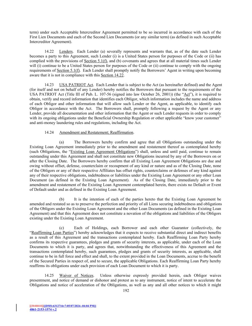 term) under such Acceptable Intercreditor Agreement permitted to be so incurred in accordance with each of the First Lien Documents and each of the Second Lien Documents (or any similar term) (as defined in such Acceptable Intercreditor Agreement). 14.22 Lenders. Each Lender (a) severally represents and warrants that, as of the date such Lender becomes a party to this Agreement, such Lender (i) is a United States person for purposes of the Code or (ii) has complied with the provisions of Section 5.1(f), and (b) covenants and agrees that at all material times such Lender will (i) continue to be a United States person for purposes of the Code or (ii) continue to comply with the ongoing requirements of Section 5.1(f). Each Lender shall promptly notify the Borrowers’ Agent in writing upon becoming aware that it is not in compliance with this Section 14.22. 14.23 USA PATRIOT Act. Each Lender that is subject to the Act (as hereinafter defined) and the Agent (for itself and not on behalf of any Lender) hereby notifies the Borrowers that pursuant to the requirements of the USA PATRIOT Act (Title III of Pub. L. 107-56 (signed into law October 26, 2001)) (the “Act”), it is required to obtain, verify and record information that identifies each Obligor, which information includes the name and address of each Obligor and other information that will allow such Lender or the Agent, as applicable, to identify each Obligor in accordance with the Act. The Borrowers shall, promptly following a request by the Agent or any Lender, provide all documentation and other information that the Agent or such Lender requests in order to comply with its ongoing obligations under the Beneficial Ownership Regulation or other applicable “know your customer” and anti-money laundering rules and regulations, including the Act. 14.24 Amendment and Restatement; Reaffirmation. (a) The Borrowers hereby confirm and agree that all Obligations outstanding under the Existing Loan Agreement immediately prior to the amendment and restatement thereof as contemplated hereby (such Obligations, the “Existing Loan Agreement Obligations”) shall, unless and until paid, continue to remain outstanding under this Agreement and shall not constitute new Obligations incurred by any of the Borrowers on or after the Closing Date. The Borrowers hereby confirm that all Existing Loan Agreement Obligations are due and owing without offset, defense, counterclaim or recoupment of any kind or nature and as of the Closing Date, none of the Obligors or any of their respective Affiliates has offset rights, counterclaims or defenses of any kind against any of their respective obligations, indebtedness or liabilities under the Existing Loan Agreement or any other Loan Document (as defined in the Existing Loan Agreement). As of the Closing Date, immediately prior to the amendment and restatement of the Existing Loan Agreement contemplated herein, there exists no Default or Event of Default under and as defined in the Existing Loan Agreement. (b) It is the intention of each of the parties hereto that the Existing Loan Agreement be amended and restated so as to preserve the perfection and priority of all Liens securing indebtedness and obligations of the Obligors under the Existing Loan Agreement and the other Loan Documents (as defined in the Existing Loan Agreement) and that this Agreement does not constitute a novation of the obligations and liabilities of the Obligors existing under the Existing Loan Agreement. (c) Each of Holdings, each Borrower and each other Guarantor (collectively, the “Reaffirming Loan Parties”) hereby acknowledges that it expects to receive substantial direct and indirect benefits as a result of this Agreement and the transactions contemplated hereby. Each Reaffirming Loan Party hereby confirms its respective guarantees, pledges and grants of security interests, as applicable, under each of the Loan Documents to which it is party, and agrees that, notwithstanding the effectiveness of this Agreement and the transactions contemplated hereby, such guarantees, pledges and grants of security interests, as applicable, shall continue to be in full force and effect and shall, to the extent provided in the Loan Documents, accrue to the benefit of the Secured Parties in respect of, and to secure, the applicable Obligations. Each Reaffirming Loan Party hereby reaffirms its obligations under each provision of each Loan Document to which it is party. 14.25 Waiver of Notices. Unless otherwise expressly provided herein, each Obligor waives presentment, and notice of demand or dishonor and protest as to any instrument, notice of intent to accelerate the Obligations and notice of acceleration of the Obligations, as well as any and all other notices to which it might 192 [[5848018]][[DMS:6312716v7:05/07/2024--04:04 PM]] 4861-2153-1574 v.2