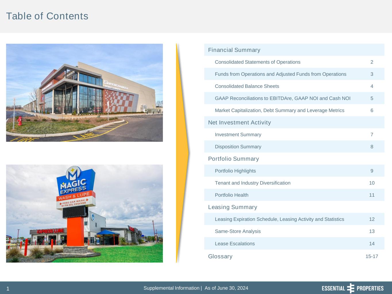Supplemental Information | As of June 30, 20241 Table of Contents Financial Summary Consolidated Statements of Operations 2 Funds from Operations and Adjusted Funds from Operations 3 Consolidated Balance Sheets 4 GAAP Reconciliations to EBITDAre, GAAP NOI and Cash NOI 5 Market Capitalization, Debt Summary and Leverage Metrics 6 Net Investment Activity Investment Summary 7 Disposition Summary 8 Portfolio Summary Portfolio Highlights 9 Tenant and Industry Diversification 10 Portfolio Health 11 Leasing Summary Leasing Expiration Schedule, Leasing Activity and Statistics 12 Same-Store Analysis 13 Lease Escalations 14 Glossary 15-17
