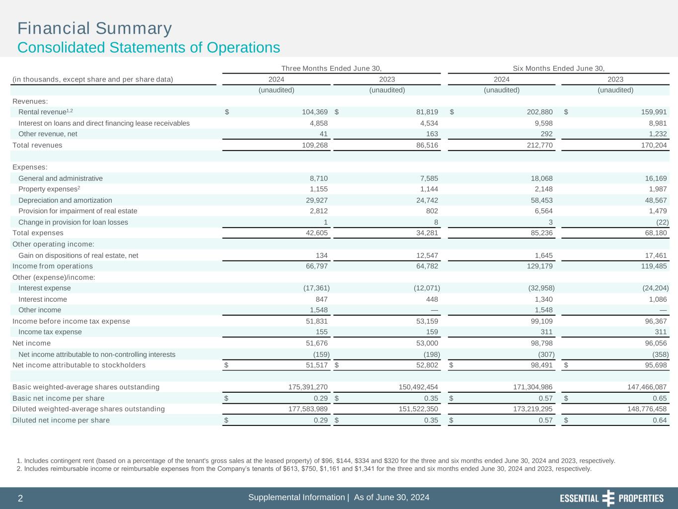 Supplemental Information | As of June 30, 20242 l t l I f r ti | s f J , 2 1. Includes contingent rent (based on a percentage of the tenant's gross sales at the leased property) of $96, $144, $334 and $320 for the three and six months ended June 30, 2024 and 2023, respectively. 2. Includes reimbursable income or reimbursable expenses from the Company’s tenants of $613, $750, $1,161 and $1,341 for the three and six months ended June 30, 2024 and 2023, respectively. Financial Summary Consolidated Statements of Operations Three Months Ended June 30, Six Months Ended June 30, (in thousands, except share and per share data) 2024 2023 2024 2023 (unaudited) (unaudited) (unaudited) (unaudited) Revenues: Rental revenue1,2 $ 104,369 $ 81,819 $ 202,880 $ 159,991 Interest on loans and direct financing lease receivables 4,858 4,534 9,598 8,981 Other revenue, net 41 163 292 1,232 Total revenues 109,268 86,516 212,770 170,204 Expenses: General and administrative 8,710 7,585 18,068 16,169 Property expenses2 1,155 1,144 2,148 1,987 Depreciation and amortization 29,927 24,742 58,453 48,567 Provision for impairment of real estate 2,812 802 6,564 1,479 Change in provision for loan losses 1 8 3 (22) Total expenses 42,605 34,281 85,236 68,180 Other operating income: Gain on dispositions of real estate, net 134 12,547 1,645 17,461 Income from operations 66,797 64,782 129,179 119,485 Other (expense)/income: Interest expense (17,361) (12,071) (32,958) (24,204) Interest income 847 448 1,340 1,086 Other income 1,548 — 1,548 — Income before income tax expense 51,831 53,159 99,109 96,367 Income tax expense 155 159 311 311 Net income 51,676 53,000 98,798 96,056 Net income attributable to non-controlling interests (159) (198) (307) (358) Net income attributable to stockholders $ 51,517 $ 52,802 $ 98,491 $ 95,698 Basic weighted-average shares outstanding 175,391,270 150,492,454 171,304,986 147,466,087 Basic net income per share $ 0.29 $ 0.35 $ 0.57 $ 0.65 Diluted weighted-average shares outstanding 177,583,989 151,522,350 173,219,295 148,776,458 Diluted net income per share $ 0.29 $ 0.35 $ 0.57 $ 0.64