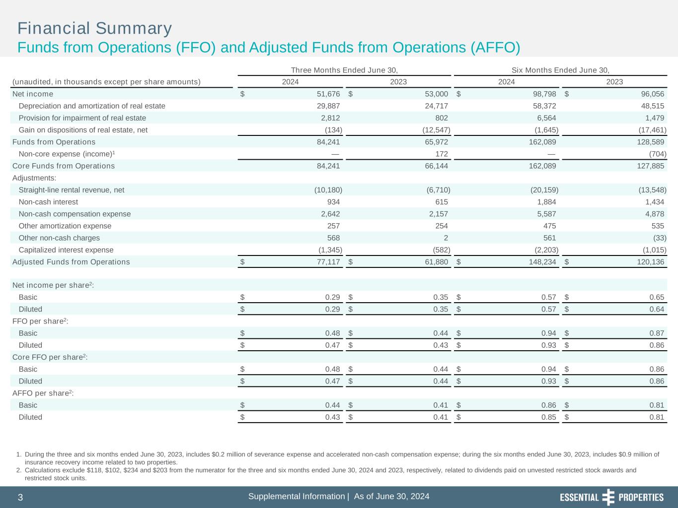 Supplemental Information | As of June 30, 20243 l t l I f r ti | s f J , 3 1. During the three and six months ended June 30, 2023, includes $0.2 million of severance expense and accelerated non-cash compensation expense; during the six months ended June 30, 2023, includes $0.9 million of insurance recovery income related to two properties. 2. Calculations exclude $118, $102, $234 and $203 from the numerator for the three and six months ended June 30, 2024 and 2023, respectively, related to dividends paid on unvested restricted stock awards and restricted stock units. Financial Summary Funds from Operations (FFO) and Adjusted Funds from Operations (AFFO) Three Months Ended June 30, Six Months Ended June 30, (unaudited, in thousands except per share amounts) 2024 2023 2024 2023 Net income $ 51,676 $ 53,000 $ 98,798 $ 96,056 Depreciation and amortization of real estate 29,887 24,717 58,372 48,515 Provision for impairment of real estate 2,812 802 6,564 1,479 Gain on dispositions of real estate, net (134) (12,547) (1,645) (17,461) Funds from Operations 84,241 65,972 162,089 128,589 Non-core expense (income)1 — 172 — (704) Core Funds from Operations 84,241 66,144 162,089 127,885 Adjustments: Straight-line rental revenue, net (10,180) (6,710) (20,159) (13,548) Non-cash interest 934 615 1,884 1,434 Non-cash compensation expense 2,642 2,157 5,587 4,878 Other amortization expense 257 254 475 535 Other non-cash charges 568 2 561 (33) Capitalized interest expense (1,345) (582) (2,203) (1,015) Adjusted Funds from Operations $ 77,117 $ 61,880 $ 148,234 $ 120,136 Net income per share2: Basic $ 0.29 $ 0.35 $ 0.57 $ 0.65 Diluted $ 0.29 $ 0.35 $ 0.57 $ 0.64 FFO per share2: Basic $ 0.48 $ 0.44 $ 0.94 $ 0.87 Diluted $ 0.47 $ 0.43 $ 0.93 $ 0.86 Core FFO per share2: Basic $ 0.48 $ 0.44 $ 0.94 $ 0.86 Diluted $ 0.47 $ 0.44 $ 0.93 $ 0.86 AFFO per share2: Basic $ 0.44 $ 0.41 $ 0.86 $ 0.81 Diluted $ 0.43 $ 0.41 $ 0.85 $ 0.81