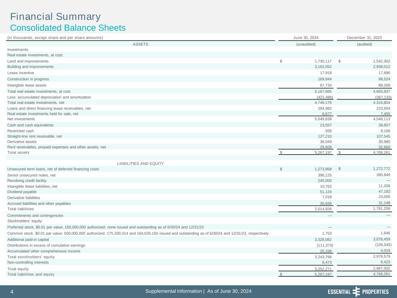 Supplemental Information | As of June 30, 20244 l t l I f r ti | s f J , 4 Financial Summary Consolidated Balance Sheets (in thousands, except share and per share amounts) June 30, 2024 December 31, 2023 ASSETS (unaudited) (audited) Investments: Real estate investments, at cost: Land and improvements $ 1,730,117 $ 1,542,302 Building and improvements 3,162,052 2,938,012 Lease incentive 17,918 17,890 Construction in progress 169,844 96,524 Intangible lease assets 87,734 89,209 Total real estate investments, at cost 5,167,665 4,683,937 Less: accumulated depreciation and amortization (421,486) (367,133) Total real estate investments, net 4,746,179 4,316,804 Loans and direct financing lease receivables, net 294,982 223,854 Real estate investments held for sale, net 8,677 7,455 Net investments 5,049,838 4,548,113 Cash and cash equivalents 23,557 39,807 Restricted cash 935 9,156 Straight-line rent receivable, net 127,210 107,545 Derivative assets 36,049 30,980 Rent receivables, prepaid expenses and other assets, net 29,608 32,660 Total assets $ 5,267,197 $ 4,768,261 LIABILITIES AND EQUITY Unsecured term loans, net of deferred financing costs $ 1,273,958 $ 1,272,772 Senior unsecured notes, net 396,125 395,846 Revolving credit facility 245,000 — Intangible lease liabilities, net 10,762 11,206 Dividend payable 51,124 47,182 Derivative liabilities 7,018 23,005 Accrued liabilities and other payables 30,939 31,248 Total liabilities 2,014,926 1,781,259 Commitments and contingencies — — Stockholders' equity: Preferred stock, $0.01 par value; 150,000,000 authorized; none issued and outstanding as of 6/30/24 and 12/31/23 — — Common stock, $0.01 par value; 500,000,000 authorized; 175,330,314 and 164,635,150 issued and outstanding as of 6/30/24 and 12/31/23, respectively 1,753 1,646 Additional paid-in capital 3,328,082 3,078,459 Distributions in excess of cumulative earnings (111,373) (105,545) Accumulated other comprehensive income 25,336 4,019 Total stockholders' equity 3,243,798 2,978,579 Non-controlling interests 8,473 8,423 Total equity 3,252,271 2,987,002 Total liabilities and equity $ 5,267,197 4,768,261