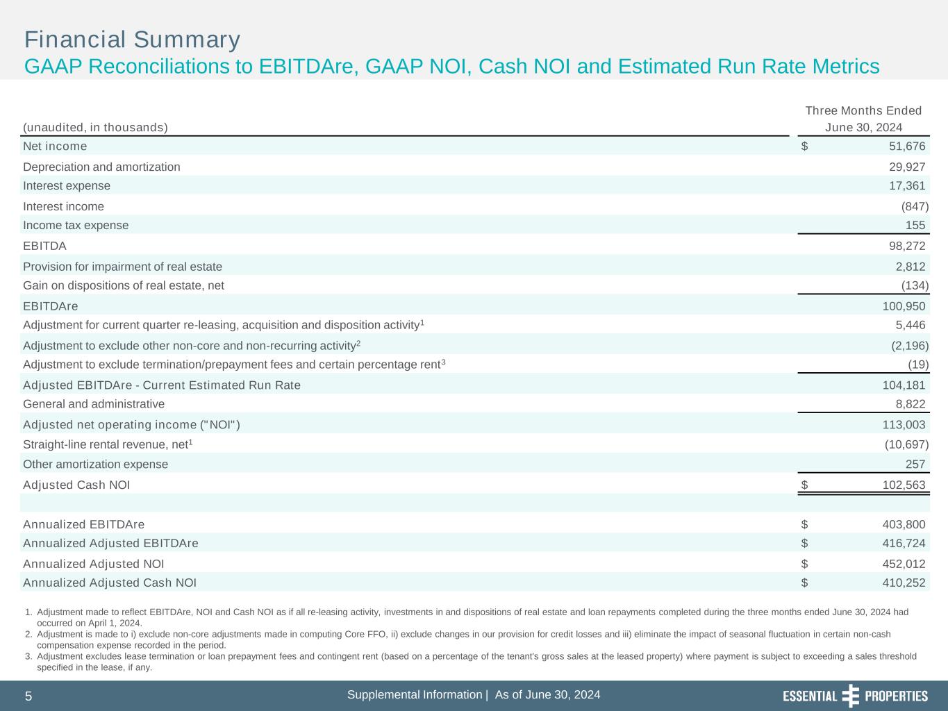 1.Adjustment is made to reflect EBITDAre, NOI and Cash NOI as if all re-leasing activity, investments in and dispositions of real estate and loan repayments completed during the three months ended June 30, 2024 had occurred on April 1, 2024.