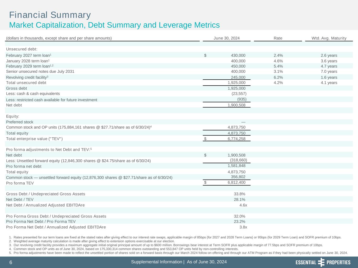 Supplemental Information | As of June 30, 20246 l t l I f r ti | s f J , 6 Financial Summary Market Capitalization, Debt Summary and Leverage Metrics 1. Rates presented for our term loans are fixed at the stated rates after giving effect to our interest rate swaps, applicable margin of 85bps (for 2027 and 2028 Term Loans) or 95bps (for 2029 Term Loan) and SOFR premium of 10bps. 2. Weighted average maturity calculation is made after giving effect to extension options exercisable at our election. 3. Our revolving credit facility provides a maximum aggregate initial original principal amount of up to $600 million. Borrowings bear interest at Term SOFR plus applicable margin of 77.5bps and SOFR premium of 10bps. 4. Common stock and OP units as of June 30, 2024, based on 175,330,314 common shares outstanding and 553,847 OP units held by non-controlling interests. 5. Pro forma adjustments have been made to reflect the unsettled portion of shares sold on a forward basis through our March 2024 follow-on offering and through our ATM Program as if they had been physically settled on June 30, 2024. (dollars in thousands, except share and per share amounts) June 30, 2024 Rate Wtd. Avg. Maturity Unsecured debt: February 2027 term loan1 $ 430,000 2.4% 2.6 years January 2028 term loan1 400,000 4.6% 3.6 years February 2029 term loan1,2 450,000 5.4% 4.7 years Senior unsecured notes due July 2031 400,000 3.1% 7.0 years Revolving credit facility3 245,000 6.2% 1.6 years Total unsecured debt 1,925,000 4.2% 4.1 years Gross debt 1,925,000 Less: cash & cash equivalents (23,557) Less: restricted cash available for future investment (935) Net debt 1,900,508 Equity: Preferred stock — Common stock and OP units (175,884,161 shares @ $27.71/share as of 6/30/24)4 4,873,750 Total equity 4,873,750 Total enterprise value ("TEV") $ 6,774,258 Pro forma adjustments to Net Debt and TEV:5 Net debt $ 1,900,508 Less: Unsettled forward equity (12,846,300 shares @ $24.75/share as of 6/30/24) (318,660) Pro forma net debt 1,581,848 Total equity 4,873,750 Common stock — unsettled forward equity (12,876,300 shares @ $27.71/share as of 6/30/24) 356,802 Pro forma TEV $ 6,812,400 Gross Debt / Undepreciated Gross Assets 33.8% Net Debt / TEV 28.1% Net Debt / Annualized Adjusted EBITDAre 4.6x Pro Forma Gross Debt / Undepreciated Gross Assets 32.0% Pro Forma Net Debt / Pro Forma TEV 23.2% Pro Forma Net Debt / Annualized Adjusted EBITDAre 3.8x