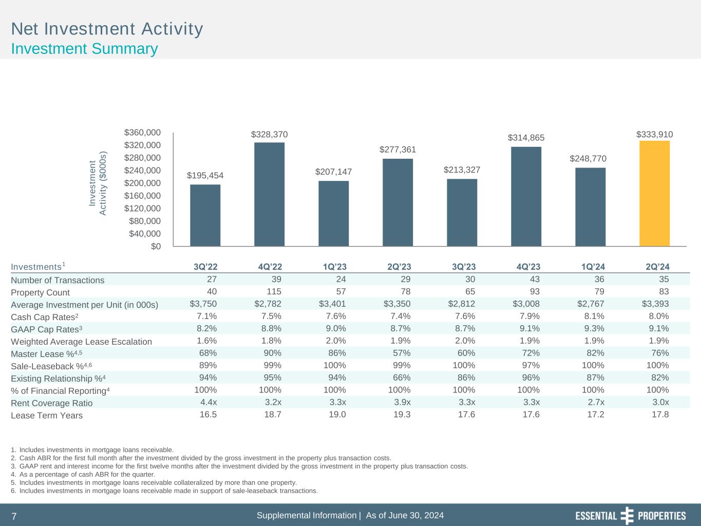 Supplemental Information | As of June 30, 20247 $195,454 $328,370 $207,147 $277,361 $213,327 $314,865 $248,770 $333,910 $0 $40,000 $80,000 $120,000 $160,000 $200,000 $240,000 $280,000 $320,000 $360,000 In v e s tm e n t A c ti v it y ( $ 0 0 0 s ) Net Investment Activity Investment Summary 1. Includes investments in mortgage loans receivable. 2. Cash ABR for the first full month after the investment divided by the gross investment in the property plus transaction costs. 3. GAAP rent and interest income for the first twelve months after the investment divided by the gross investment in the property plus transaction costs. 4. As a percentage of cash ABR for the quarter. 5. Includes investments in mortgage loans receivable collateralized by more than one property. 6. Includes investments in mortgage loans receivable made in support of sale-leaseback transactions. Investments1 3Q’22 4Q’22 1Q’23 2Q’23 3Q’23 4Q’23 1Q’24 2Q’24 Number of Transactions 27 39 24 29 30 43 36 35 Property Count 40 115 57 78 65 93 79 83 Average Investment per Unit (in 000s) $3,750 $2,782 $3,401 $3,350 $2,812 $3,008 $2,767 $3,393 Cash Cap Rates2 7.1% 7.5% 7.6% 7.4% 7.6% 7.9% 8.1% 8.0% GAAP Cap Rates3 8.2% 8.8% 9.0% 8.7% 8.7% 9.1% 9.3% 9.1% Weighted Average Lease Escalation 1.6% 1.8% 2.0% 1.9% 2.0% 1.9% 1.9% 1.9% Master Lease %4,5 68% 90% 86% 57% 60% 72% 82% 76% Sale-Leaseback %4,6 89% 99% 100% 99% 100% 97% 100% 100% Existing Relationship %4 94% 95% 94% 66% 86% 96% 87% 82% % of Financial Reporting4 100% 100% 100% 100% 100% 100% 100% 100% Rent Coverage Ratio 4.4x 3.2x 3.3x 3.9x 3.3x 3.3x 2.7x 3.0x Lease Term Years 16.5 18.7 19.0 19.3 17.6 17.6 17.2 17.8