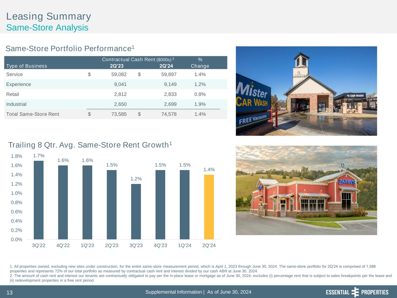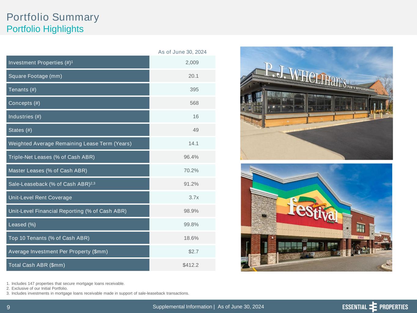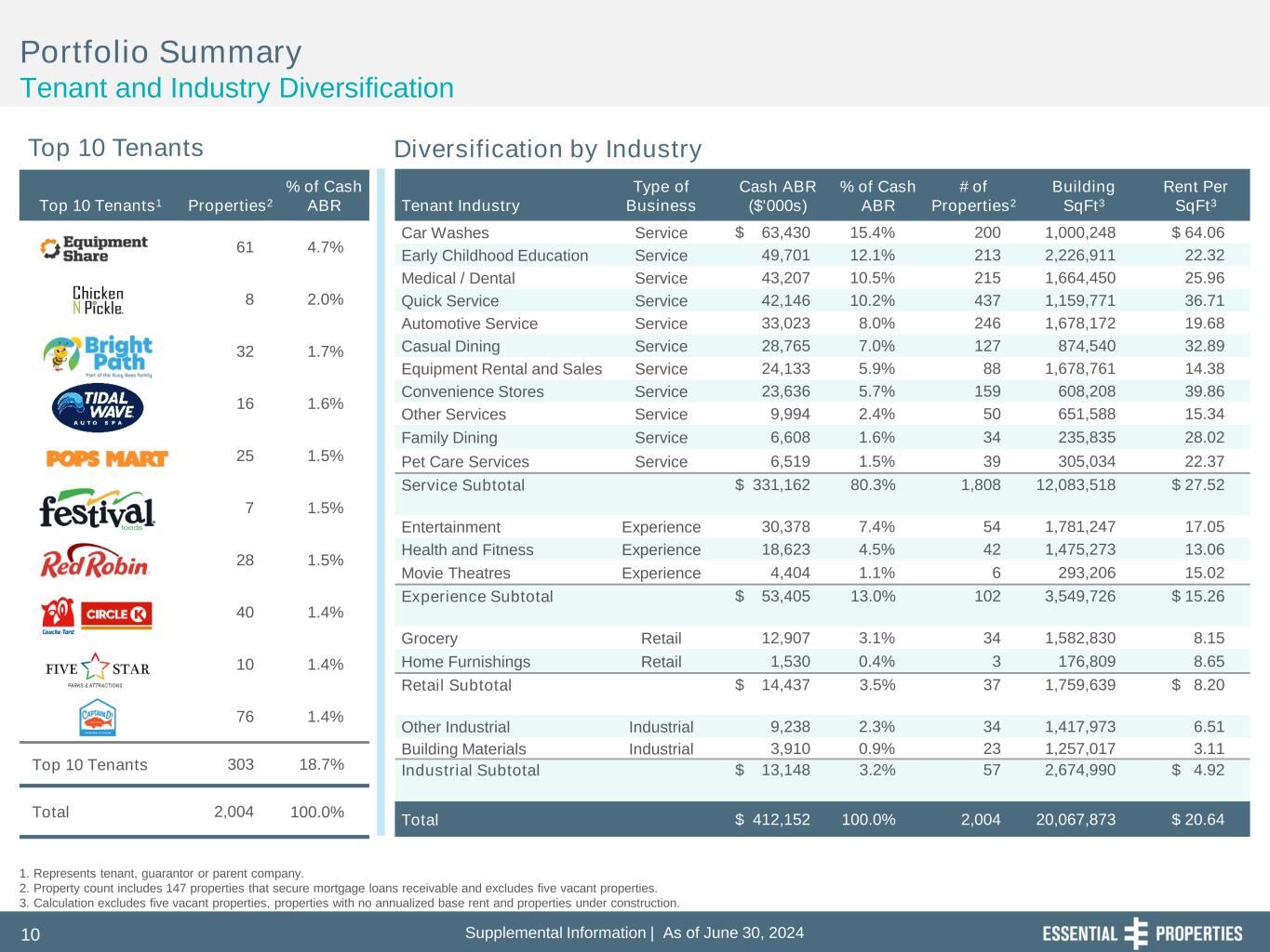 Supplemental Information | As of June 30, 202410 Top 10 Tenants1 Properties2 % of Cash ABR 61 4.7% 8 2.0% 32 1.7% 16 1.6% 25 1.5% 7 1.5% 28 1.5% 40 1.4% 10 1.4% 76 1.4% Top 10 Tenants 303 18.7% Total 2,004 100.0% Portfolio Summary Tenant and Industry Diversification Top 10 Tenants Diversification by Industry 1. Represents tenant, guarantor or parent company. 2. Property count includes 147 properties that secure mortgage loans receivable and excludes five vacant properties. 3. Calculation excludes five vacant properties, properties with no annualized base rent and properties under construction. Tenant Industry Type of Business Cash ABR ($'000s) % of Cash ABR # of Properties2 Building SqFt3 Rent Per SqFt3 Car Washes Service $ 63,430 15.4% 200 1,000,248 $ 64.06 Early Childhood Education Service 49,701 12.1% 213 2,226,911 22.32 Medical / Dental Service 43,207 10.5% 215 1,664,450 25.96 Quick Service Service 42,146 10.2% 437 1,159,771 36.71 Automotive Service Service 33,023 8.0% 246 1,678,172 19.68 Casual Dining Service 28,765 7.0% 127 874,540 32.89 Equipment Rental and Sales Service 24,133 5.9% 88 1,678,761 14.38 Convenience Stores Service 23,636 5.7% 159 608,208 39.86 Other Services Service 9,994 2.4% 50 651,588 15.34 Family Dining Service 6,608 1.6% 34 235,835 28.02 Pet Care Services Service 6,519 1.5% 39 305,034 22.37 Service Subtotal $ 331,162 80.3% 1,808 12,083,518 $ 27.52 Entertainment Experience 30,378 7.4% 54 1,781,247 17.05 Health and Fitness Experience 18,623 4.5% 42 1,475,273 13.06 Movie Theatres Experience 4,404 1.1% 6 293,206 15.02 Experience Subtotal $ 53,405 13.0% 102 3,549,726 $ 15.26 Grocery Retail 12,907 3.1% 34 1,582,830 8.15 Home Furnishings Retail 1,530 0.4% 3 176,809 8.65 Retail Subtotal $ 14,437 3.5% 37 1,759,639 $ 8.20 Other Industrial Industrial 9,238 2.3% 34 1,417,973 6.51 Building Materials Industrial 3,910 0.9% 23 1,257,017 3.11 Industrial Subtotal $ 13,148 3.2% 57 2,674,990 $ 4.92 Total $ 412,152 100.0% 2,004 20,067,873 $ 20.64