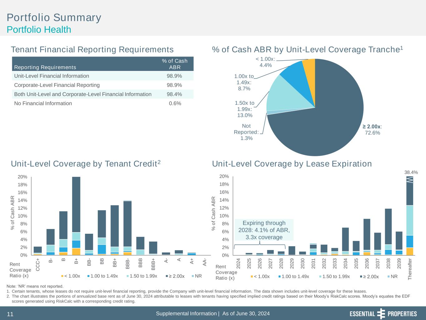 Supplemental Information | As of June 30, 202411 0% 2% 4% 6% 8% 10% 12% 14% 16% 18% 20% 2 0 2 4 2 0 2 5 2 0 2 6 2 0 2 7 2 0 2 8 2 0 2 9 2 0 3 0 2 0 3 1 2 0 3 2 2 0 3 3 2 0 3 4 2 0 3 5 2 0 3 6 2 0 3 7 2 0 3 8 2 0 3 9 T h e re a ft e r % o f C a s h A B R < 1.00x 1.00 to 1.49x 1.50 to 1.99x ≥ 2.00x NR 38.4% 0% 2% 4% 6% 8% 10% 12% 14% 16% 18% 20% C C C + B - B B + B B - B B B B + B B B - B B B B B B + A - A A + A A - % o f C a s h A B R < 1.00x 1.00 to 1.49x 1.50 to 1.99x ≥ 2.00x NR ≥ 2.00x: 72.6% Not Reported: 1.3% 1.50x to 1.99x: 13.0% 1.00x to 1.49x: 8.7% < 1.00x: 4.4% Portfolio Summary Portfolio Health Tenant Financial Reporting Requirements % of Cash ABR by Unit-Level Coverage Tranche1 Unit-Level Coverage by Lease ExpirationUnit-Level Coverage by Tenant Credit2 Note: ‘NR’ means not reported. 1. Certain tenants, whose leases do not require unit-level financial reporting, provide the Company with unit-level financial information. The data shown includes unit-level coverage for these leases. 2. The chart illustrates the portions of annualized base rent as of June 30, 2024 attributable to leases with tenants having specified implied credit ratings based on their Moody’s RiskCalc scores. Moody’s equates the EDF scores generated using RiskCalc with a corresponding credit rating. Reporting Requirements % of Cash ABR Unit-Level Financial Information 98.9% Corporate-Level Financial Reporting 98.9% Both Unit-Level and Corporate-Level Financial Information 98.4% No Financial Information 0.6% Rent Coverage Ratio (x) Rent Coverage Ratio (x) Expiring through 2028: 4.1% of ABR, 3.3x coverage