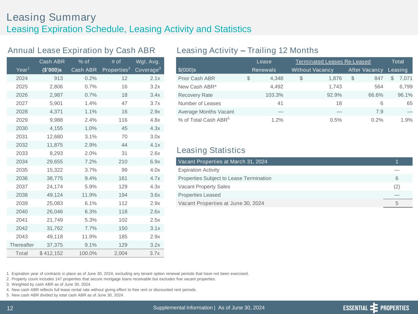 Supplemental Information | As of June 30, 202412 Cash ABR % of # of Wgt. Avg. Lease Terminated Leases Re-Leased Total Year1 ($’000)s Cash ABR Properties2 Coverage3 $(000)s Renewals Without Vacancy After Vacancy Leasing 2024 913 0.2% 12 2.1x Prior Cash ABR $ 4,348 $ 1,876 $ 847 $ 7,071 2025 2,806 0.7% 16 3.2x New Cash ABR4 4,492 1,743 564 6,799 2026 2,987 0.7% 18 3.4x Recovery Rate 103.3% 92.9% 66.6% 96.1% 2027 5,901 1.4% 47 3.7x Number of Leases 41 18 6 65 2028 4,371 1.1% 16 2.9x Average Months Vacant — — 7.9 — 2029 9,988 2.4% 116 4.8x % of Total Cash ABR5 1.2% 0.5% 0.2% 1.9% 2030 4,155 1.0% 45 4.3x 2031 12,680 3.1% 70 3.0x 2032 11,875 2.9% 44 4.1x 2033 8,293 2.0% 31 2.6x 2034 29,655 7.2% 210 6.9x Vacant Properties at March 31, 2024 1 2035 15,322 3.7% 99 4.0x Expiration Activity — 2036 38,775 9.4% 161 4.7x Properties Subject to Lease Termination 6 2037 24,174 5.9% 129 4.3x Vacant Property Sales (2) 2038 49,124 11.9% 194 3.6x Properties Leased — 2039 25,083 6.1% 112 2.9x Vacant Properties at June 30, 2024 5 2040 26,046 6.3% 118 2.6x 2041 21,749 5.3% 102 2.5x 2042 31,762 7.7% 150 3.1x 2043 49,118 11.9% 185 2.9x Thereafter 37,375 9.1% 129 3.2x Total $ 412,152 100.0% 2,004 3.7x Leasing Summary Leasing Expiration Schedule, Leasing Activity and Statistics 1. Expiration year of contracts in place as of June 30, 2024, excluding any tenant option renewal periods that have not been exercised. 2. Property count includes 147 properties that secure mortgage loans receivable but excludes five vacant properties. 3. Weighted by cash ABR as of June 30, 2024. 4. New cash ABR reflects full lease rental rate without giving effect to free rent or discounted rent periods. 5. New cash ABR divided by total cash ABR as of June 30, 2024. Annual Lease Expiration by Cash ABR Leasing Activity – Trailing 12 Months Leasing Statistics