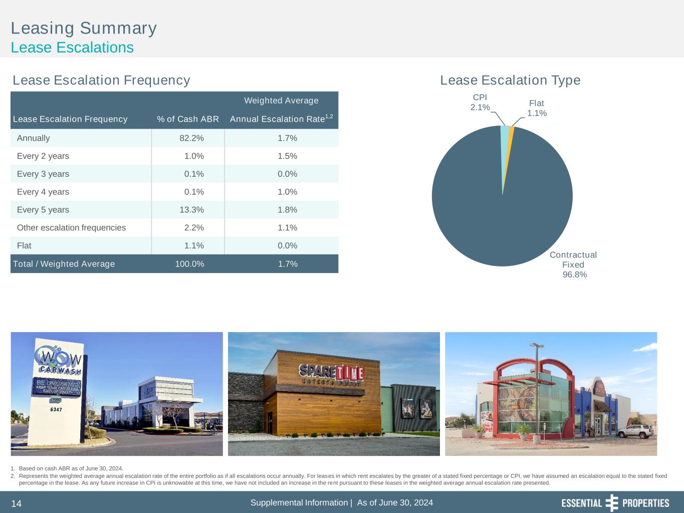 Supplemental Information | As of June 30, 202413 Leasing Summary Same-Store Analysis Same-Store Portfolio Performance1 Contractual Cash Rent ($000s) 2 % Type of Business 2Q’23 2Q’24 Change Service $ 59,082 $ 59,897 1.4% Experience 9,041 9,149 1.2% Retail 2,812 2,833 0.8% Industrial 2,650 2,699 1.9% Total Same-Store Rent $ 73,585 $ 74,578 1.4% 1. All properties owned, excluding new sites under construction, for the entire same-store measurement period, which is April 1, 2023 through June 30, 2024. The same-store portfolio for 2Q’24 is comprised of 1,588 properties and represents 72% of our total portfolio as measured by contractual cash rent and interest divided by our cash ABR at June 30, 2024. 2. The amount of cash rent and interest our tenants are contractually obligated to pay per the in-place lease or mortgage as of June 30, 2024; excludes (i) percentage rent that is subject to sales breakpoints per the lease and (ii) redevelopment properties in a free rent period. 1.7% 1.6% 1.6% 1.5% 1.2% 1.5% 1.5% 1.4% 0.0% 0.2% 0.4% 0.6% 0.8% 1.0% 1.2% 1.4% 1.6% 1.8% 3Q'22 4Q'22 1Q'23 2Q'23 3Q'23 4Q'23 1Q'24 2Q'24 Trailing 8 Qtr. Avg. Same-Store Rent Growth1