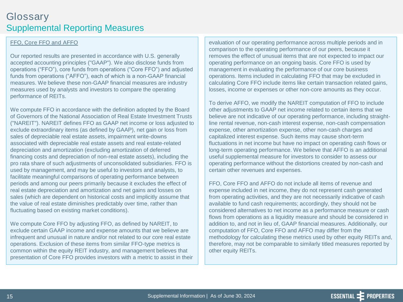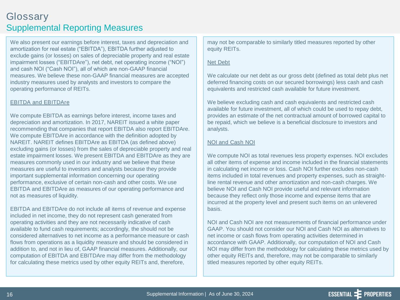 Supplemental Information | As of June 30, 202415 Glossary Supplemental Reporting Measures FFO, Core FFO and AFFO Our reported results are presented in accordance with U.S. generally accepted accounting principles ("GAAP"). We also disclose funds from operations (“FFO”), core funds from operations (“Core FFO”) and adjusted funds from operations (“AFFO”), each of which is a non-GAAP financial measures. We believe these non-GAAP financial measures are industry measures used by analysts and investors to compare the operating performance of REITs. We compute FFO in accordance with the definition adopted by the Board of Governors of the National Association of Real Estate Investment Trusts ("NAREIT"). NAREIT defines FFO as GAAP net income or loss adjusted to exclude extraordinary items (as defined by GAAP), net gain or loss from sales of depreciable real estate assets, impairment write-downs associated with depreciable real estate assets and real estate-related depreciation and amortization (excluding amortization of deferred financing costs and depreciation of non-real estate assets), including the pro rata share of such adjustments of unconsolidated subsidiaries. FFO is used by management, and may be useful to investors and analysts, to facilitate meaningful comparisons of operating performance between periods and among our peers primarily because it excludes the effect of real estate depreciation and amortization and net gains and losses on sales (which are dependent on historical costs and implicitly assume that the value of real estate diminishes predictably over time, rather than fluctuating based on existing market conditions). We compute Core FFO by adjusting FFO, as defined by NAREIT, to exclude certain GAAP income and expense amounts that we believe are infrequent and unusual in nature and/or not related to our core real estate operations. Exclusion of these items from similar FFO-type metrics is common within the equity REIT industry, and management believes that presentation of Core FFO provides investors with a metric to assist in their evaluation of our operating performance across multiple periods and in comparison to the operating performance of our peers, because it removes the effect of unusual items that are not expected to impact our operating performance on an ongoing basis. Core FFO is used by management in evaluating the performance of our core business operations. Items included in calculating FFO that may be excluded in calculating Core FFO include items like certain transaction related gains, losses, income or expenses or other non-core amounts as they occur. To derive AFFO, we modify the NAREIT computation of FFO to include other adjustments to GAAP net income related to certain items that we believe are not indicative of our operating performance, including straight- line rental revenue, non-cash interest expense, non-cash compensation expense, other amortization expense, other non-cash charges and capitalized interest expense. Such items may cause short-term fluctuations in net income but have no impact on operating cash flows or long-term operating performance. We believe that AFFO is an additional useful supplemental measure for investors to consider to assess our operating performance without the distortions created by non-cash and certain other revenues and expenses. FFO, Core FFO and AFFO do not include all items of revenue and expense included in net income, they do not represent cash generated from operating activities, and they are not necessarily indicative of cash available to fund cash requirements; accordingly, they should not be considered alternatives to net income as a performance measure or cash flows from operations as a liquidity measure and should be considered in addition to, and not in lieu of, GAAP financial measures. Additionally, our computation of FFO, Core FFO and AFFO may differ from the methodology for calculating these metrics used by other equity REITs and, therefore, may not be comparable to similarly titled measures reported by other equity REITs.