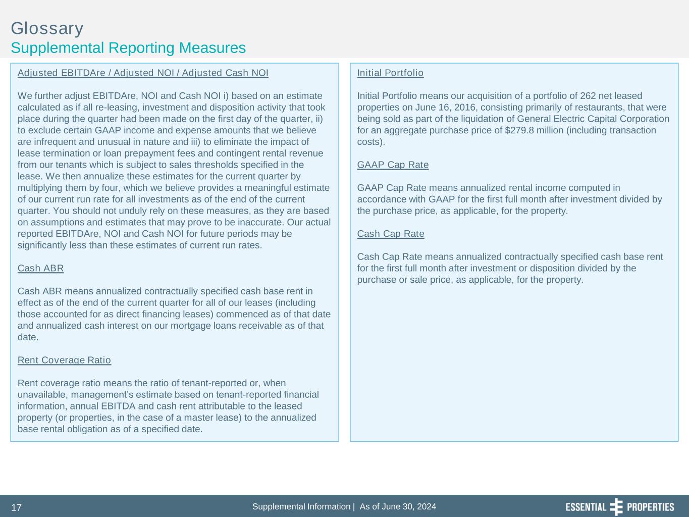 Supplemental Information | As of June 30, 202416 Glossary Supplemental Reporting Measures We also present our earnings before interest, taxes and depreciation and amortization for real estate (“EBITDA”), EBITDA further adjusted to exclude gains (or losses) on sales of depreciable property and real estate impairment losses (“EBITDAre”), net debt, net operating income (“NOI”) and cash NOI (“Cash NOI”), all of which are non-GAAP financial measures. We believe these non-GAAP financial measures are accepted industry measures used by analysts and investors to compare the operating performance of REITs. EBITDA and EBITDAre We compute EBITDA as earnings before interest, income taxes and depreciation and amortization. In 2017, NAREIT issued a white paper recommending that companies that report EBITDA also report EBITDAre. We compute EBITDAre in accordance with the definition adopted by NAREIT. NAREIT defines EBITDAre as EBITDA (as defined above) excluding gains (or losses) from the sales of depreciable property and real estate impairment losses. We present EBITDA and EBITDAre as they are measures commonly used in our industry and we believe that these measures are useful to investors and analysts because they provide important supplemental information concerning our operating performance, exclusive of certain non-cash and other costs. We use EBITDA and EBITDAre as measures of our operating performance and not as measures of liquidity. EBITDA and EBITDAre do not include all items of revenue and expense included in net income, they do not represent cash generated from operating activities and they are not necessarily indicative of cash available to fund cash requirements; accordingly, the should not be considered alternatives to net income as a performance measure or cash flows from operations as a liquidity measure and should be considered in addition to, and not in lieu of, GAAP financial measures. Additionally, our computation of EBITDA and EBITDAre may differ from the methodology for calculating these metrics used by other equity REITs and, therefore, may not be comparable to similarly titled measures reported by other equity REITs. Net Debt We calculate our net debt as our gross debt (defined as total debt plus net deferred financing costs on our secured borrowings) less cash and cash equivalents and restricted cash available for future investment. We believe excluding cash and cash equivalents and restricted cash available for future investment, all of which could be used to repay debt, provides an estimate of the net contractual amount of borrowed capital to be repaid, which we believe is a beneficial disclosure to investors and analysts. NOI and Cash NOI We compute NOI as total revenues less property expenses. NOI excludes all other items of expense and income included in the financial statements in calculating net income or loss. Cash NOI further excludes non-cash items included in total revenues and property expenses, such as straight- line rental revenue and other amortization and non-cash charges. We believe NOI and Cash NOI provide useful and relevant information because they reflect only those income and expense items that are incurred at the property level and present such items on an unlevered basis. NOI and Cash NOI are not measurements of financial performance under GAAP. You should not consider our NOI and Cash NOI as alternatives to net income or cash flows from operating activities determined in accordance with GAAP. Additionally, our computation of NOI and Cash NOI may differ from the methodology for calculating these metrics used by other equity REITs and, therefore, may not be comparable to similarly titled measures reported by other equity REITs.