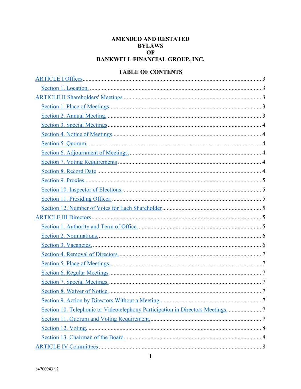 1 64700943 v2 AMENDED AND RESTATED BYLAWS OF BANKWELL FINANCIAL GROUP, INC. TABLE OF CONTENTS ARTICLE I Offices......................................................................................................................... 3 Section 1. Location. .................................................................................................................... 3 ARTICLE II Shareholders' Meetings ............................................................................................. 3 Section 1. Place of Meetings ....................................................................................................... 3 Section 2. Annual Meeting. ........................................................................................................ 3 Section 3. Special Meetings ........................................................................................................ 4 Section 4. Notice of Meetings ..................................................................................................... 4 Section 5. Quorum. ..................................................................................................................... 4 Section 6. Adjournment of Meetings. ......................................................................................... 4 Section 7. Voting Requirements ................................................................................................. 4 Section 8. Record Date ............................................................................................................... 4 Section 9. Proxies........................................................................................................................ 5 Section 10. Inspector of Elections. ............................................................................................. 5 Section 11. Presiding Officer. ..................................................................................................... 5 Section 12. Number of Votes for Each Shareholder ................................................................... 5 ARTICLE III Directors ................................................................................................................... 5 Section 1. Authority and Term of Office. ................................................................................... 5 Section 2. Nominations. .............................................................................................................. 6 Section 3. Vacancies. .................................................................................................................. 6 Section 4. Removal of Directors. ................................................................................................ 7 Section 5. Place of Meetings. ...................................................................................................... 7 Section 6. Regular Meetings ....................................................................................................... 7 Section 7. Special Meetings. ....................................................................................................... 7 Section 8. Waiver of Notice. ....................................................................................................... 7 Section 9. Action by Directors Without a Meeting. .................................................................... 7 Section 10. Telephonic or Videotelephony Participation in Directors Meetings. ...................... 7 Section 11. Quorum and Voting Requirement. ........................................................................... 7 Section 12. Voting. ..................................................................................................................... 8 Section 13. Chairman of the Board. ............................................................................................ 8 ARTICLE IV Committees .............................................................................................................. 8