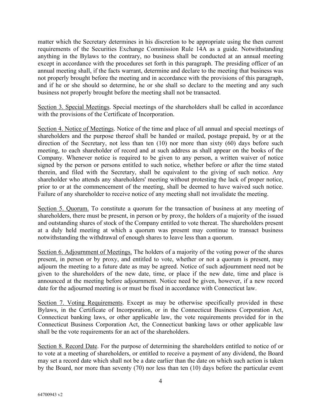 4 64700943 v2 matter which the Secretary determines in his discretion to be appropriate using the then current requirements of the Securities Exchange Commission Rule 14A as a guide. Notwithstanding anything in the Bylaws to the contrary, no business shall be conducted at an annual meeting except in accordance with the procedures set forth in this paragraph. The presiding officer of an annual meeting shall, if the facts warrant, determine and declare to the meeting that business was not properly brought before the meeting and in accordance with the provisions of this paragraph, and if he or she should so determine, he or she shall so declare to the meeting and any such business not properly brought before the meeting shall not be transacted. Section 3. Special Meetings. Special meetings of the shareholders shall be called in accordance with the provisions of the Certificate of Incorporation. Section 4. Notice of Meetings. Notice of the time and place of all annual and special meetings of shareholders and the purpose thereof shall be handed or mailed, postage prepaid, by or at the direction of the Secretary, not less than ten (10) nor more than sixty (60) days before such meeting, to each shareholder of record and at such address as shall appear on the books of the Company. Whenever notice is required to be given to any person, a written waiver of notice signed by the person or persons entitled to such notice, whether before or after the time stated therein, and filed with the Secretary, shall be equivalent to the giving of such notice. Any shareholder who attends any shareholders' meeting without protesting the lack of proper notice, prior to or at the commencement of the meeting, shall be deemed to have waived such notice. Failure of any shareholder to receive notice of any meeting shall not invalidate the meeting. Section 5. Quorum. To constitute a quorum for the transaction of business at any meeting of shareholders, there must be present, in person or by proxy, the holders of a majority of the issued and outstanding shares of stock of the Company entitled to vote thereat. The shareholders present at a duly held meeting at which a quorum was present may continue to transact business notwithstanding the withdrawal of enough shares to leave less than a quorum. Section 6. Adjournment of Meetings. The holders of a majority of the voting power of the shares present, in person or by proxy, and entitled to vote, whether or not a quorum is present, may adjourn the meeting to a future date as may be agreed. Notice of such adjournment need not be given to the shareholders of the new date, time, or place if the new date, time and place is announced at the meeting before adjournment. Notice need be given, however, if a new record date for the adjourned meeting is or must be fixed in accordance with Connecticut law. Section 7. Voting Requirements. Except as may be otherwise specifically provided in these Bylaws, in the Certificate of Incorporation, or in the Connecticut Business Corporation Act, Connecticut banking laws, or other applicable law, the vote requirements provided for in the Connecticut Business Corporation Act, the Connecticut banking laws or other applicable law shall be the vote requirements for an act of the shareholders. Section 8. Record Date. For the purpose of determining the shareholders entitled to notice of or to vote at a meeting of shareholders, or entitled to receive a payment of any dividend, the Board may set a record date which shall not be a date earlier than the date on which such action is taken by the Board, nor more than seventy (70) nor less than ten (10) days before the particular event