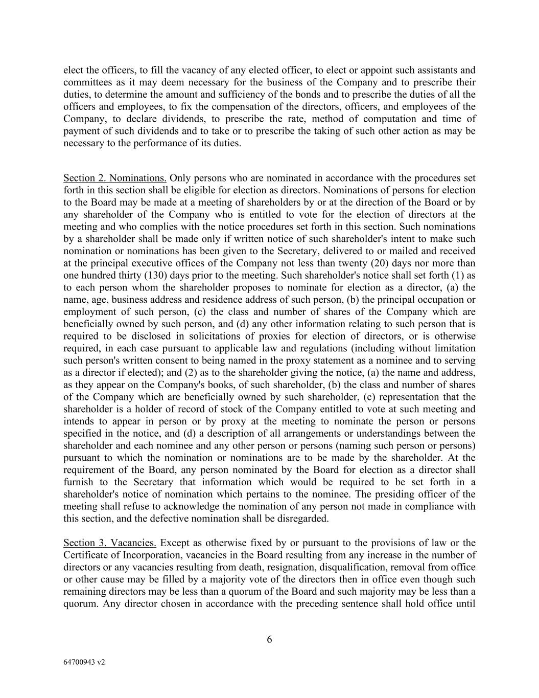6 64700943 v2 elect the officers, to fill the vacancy of any elected officer, to elect or appoint such assistants and committees as it may deem necessary for the business of the Company and to prescribe their duties, to determine the amount and sufficiency of the bonds and to prescribe the duties of all the officers and employees, to fix the compensation of the directors, officers, and employees of the Company, to declare dividends, to prescribe the rate, method of computation and time of payment of such dividends and to take or to prescribe the taking of such other action as may be necessary to the performance of its duties. Section 2. Nominations. Only persons who are nominated in accordance with the procedures set forth in this section shall be eligible for election as directors. Nominations of persons for election to the Board may be made at a meeting of shareholders by or at the direction of the Board or by any shareholder of the Company who is entitled to vote for the election of directors at the meeting and who complies with the notice procedures set forth in this section. Such nominations by a shareholder shall be made only if written notice of such shareholder's intent to make such nomination or nominations has been given to the Secretary, delivered to or mailed and received at the principal executive offices of the Company not less than twenty (20) days nor more than one hundred thirty (130) days prior to the meeting. Such shareholder's notice shall set forth (1) as to each person whom the shareholder proposes to nominate for election as a director, (a) the name, age, business address and residence address of such person, (b) the principal occupation or employment of such person, (c) the class and number of shares of the Company which are beneficially owned by such person, and (d) any other information relating to such person that is required to be disclosed in solicitations of proxies for election of directors, or is otherwise required, in each case pursuant to applicable law and regulations (including without limitation such person's written consent to being named in the proxy statement as a nominee and to serving as a director if elected); and (2) as to the shareholder giving the notice, (a) the name and address, as they appear on the Company's books, of such shareholder, (b) the class and number of shares of the Company which are beneficially owned by such shareholder, (c) representation that the shareholder is a holder of record of stock of the Company entitled to vote at such meeting and intends to appear in person or by proxy at the meeting to nominate the person or persons specified in the notice, and (d) a description of all arrangements or understandings between the shareholder and each nominee and any other person or persons (naming such person or persons) pursuant to which the nomination or nominations are to be made by the shareholder. At the requirement of the Board, any person nominated by the Board for election as a director shall furnish to the Secretary that information which would be required to be set forth in a shareholder's notice of nomination which pertains to the nominee. The presiding officer of the meeting shall refuse to acknowledge the nomination of any person not made in compliance with this section, and the defective nomination shall be disregarded. Section 3. Vacancies. Except as otherwise fixed by or pursuant to the provisions of law or the Certificate of Incorporation, vacancies in the Board resulting from any increase in the number of directors or any vacancies resulting from death, resignation, disqualification, removal from office or other cause may be filled by a majority vote of the directors then in office even though such remaining directors may be less than a quorum of the Board and such majority may be less than a quorum. Any director chosen in accordance with the preceding sentence shall hold office until