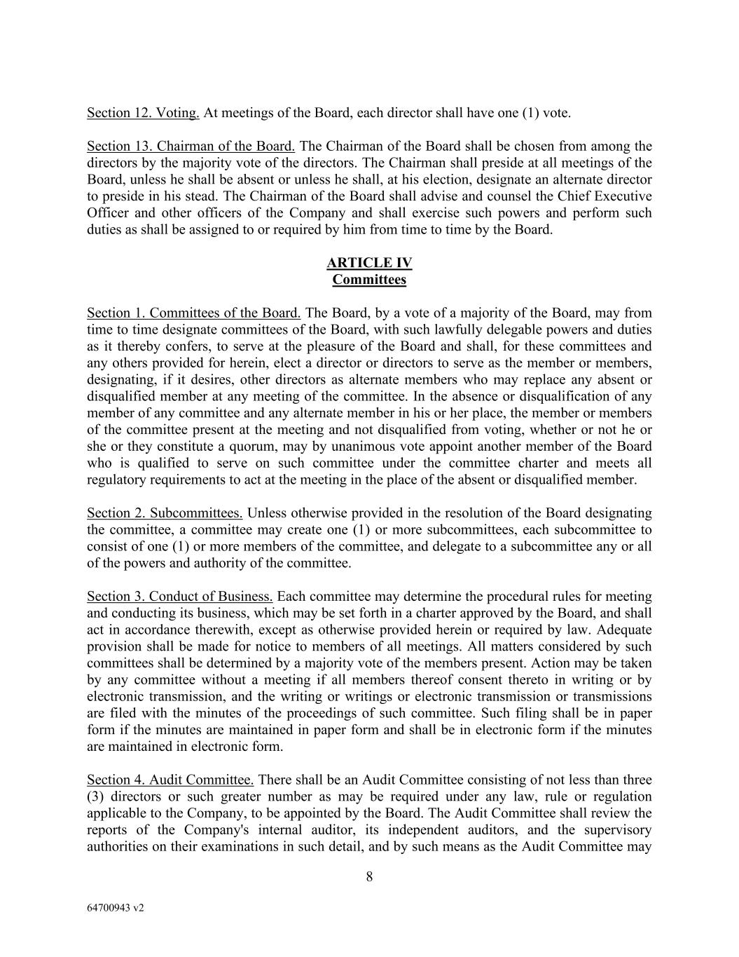 8 64700943 v2 Section 12. Voting. At meetings of the Board, each director shall have one (1) vote. Section 13. Chairman of the Board. The Chairman of the Board shall be chosen from among the directors by the majority vote of the directors. The Chairman shall preside at all meetings of the Board, unless he shall be absent or unless he shall, at his election, designate an alternate director to preside in his stead. The Chairman of the Board shall advise and counsel the Chief Executive Officer and other officers of the Company and shall exercise such powers and perform such duties as shall be assigned to or required by him from time to time by the Board. ARTICLE IV Committees Section 1. Committees of the Board. The Board, by a vote of a majority of the Board, may from time to time designate committees of the Board, with such lawfully delegable powers and duties as it thereby confers, to serve at the pleasure of the Board and shall, for these committees and any others provided for herein, elect a director or directors to serve as the member or members, designating, if it desires, other directors as alternate members who may replace any absent or disqualified member at any meeting of the committee. In the absence or disqualification of any member of any committee and any alternate member in his or her place, the member or members of the committee present at the meeting and not disqualified from voting, whether or not he or she or they constitute a quorum, may by unanimous vote appoint another member of the Board who is qualified to serve on such committee under the committee charter and meets all regulatory requirements to act at the meeting in the place of the absent or disqualified member. Section 2. Subcommittees. Unless otherwise provided in the resolution of the Board designating the committee, a committee may create one (1) or more subcommittees, each subcommittee to consist of one (1) or more members of the committee, and delegate to a subcommittee any or all of the powers and authority of the committee. Section 3. Conduct of Business. Each committee may determine the procedural rules for meeting and conducting its business, which may be set forth in a charter approved by the Board, and shall act in accordance therewith, except as otherwise provided herein or required by law. Adequate provision shall be made for notice to members of all meetings. All matters considered by such committees shall be determined by a majority vote of the members present. Action may be taken by any committee without a meeting if all members thereof consent thereto in writing or by electronic transmission, and the writing or writings or electronic transmission or transmissions are filed with the minutes of the proceedings of such committee. Such filing shall be in paper form if the minutes are maintained in paper form and shall be in electronic form if the minutes are maintained in electronic form. Section 4. Audit Committee. There shall be an Audit Committee consisting of not less than three (3) directors or such greater number as may be required under any law, rule or regulation applicable to the Company, to be appointed by the Board. The Audit Committee shall review the reports of the Company's internal auditor, its independent auditors, and the supervisory authorities on their examinations in such detail, and by such means as the Audit Committee may