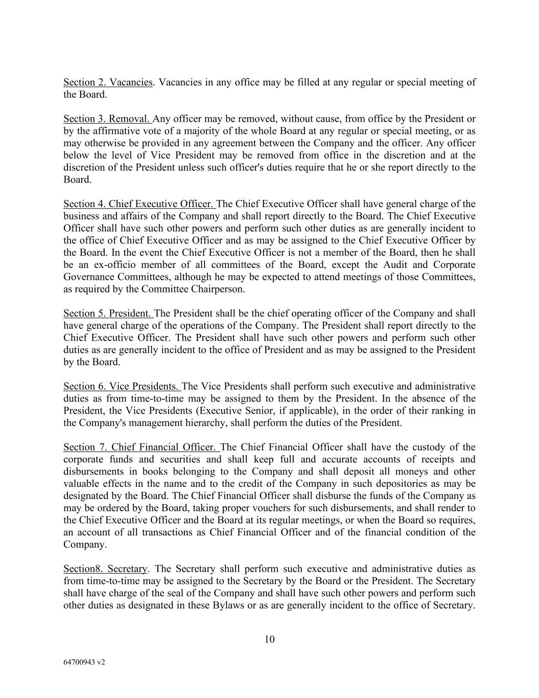 10 64700943 v2 Section 2. Vacancies. Vacancies in any office may be filled at any regular or special meeting of the Board. Section 3. Removal. Any officer may be removed, without cause, from office by the President or by the affirmative vote of a majority of the whole Board at any regular or special meeting, or as may otherwise be provided in any agreement between the Company and the officer. Any officer below the level of Vice President may be removed from office in the discretion and at the discretion of the President unless such officer's duties require that he or she report directly to the Board. Section 4. Chief Executive Officer. The Chief Executive Officer shall have general charge of the business and affairs of the Company and shall report directly to the Board. The Chief Executive Officer shall have such other powers and perform such other duties as are generally incident to the office of Chief Executive Officer and as may be assigned to the Chief Executive Officer by the Board. In the event the Chief Executive Officer is not a member of the Board, then he shall be an ex-officio member of all committees of the Board, except the Audit and Corporate Governance Committees, although he may be expected to attend meetings of those Committees, as required by the Committee Chairperson. Section 5. President. The President shall be the chief operating officer of the Company and shall have general charge of the operations of the Company. The President shall report directly to the Chief Executive Officer. The President shall have such other powers and perform such other duties as are generally incident to the office of President and as may be assigned to the President by the Board. Section 6. Vice Presidents. The Vice Presidents shall perform such executive and administrative duties as from time-to-time may be assigned to them by the President. In the absence of the President, the Vice Presidents (Executive Senior, if applicable), in the order of their ranking in the Company's management hierarchy, shall perform the duties of the President. Section 7. Chief Financial Officer. The Chief Financial Officer shall have the custody of the corporate funds and securities and shall keep full and accurate accounts of receipts and disbursements in books belonging to the Company and shall deposit all moneys and other valuable effects in the name and to the credit of the Company in such depositories as may be designated by the Board. The Chief Financial Officer shall disburse the funds of the Company as may be ordered by the Board, taking proper vouchers for such disbursements, and shall render to the Chief Executive Officer and the Board at its regular meetings, or when the Board so requires, an account of all transactions as Chief Financial Officer and of the financial condition of the Company. Section8. Secretary. The Secretary shall perform such executive and administrative duties as from time-to-time may be assigned to the Secretary by the Board or the President. The Secretary shall have charge of the seal of the Company and shall have such other powers and perform such other duties as designated in these Bylaws or as are generally incident to the office of Secretary.