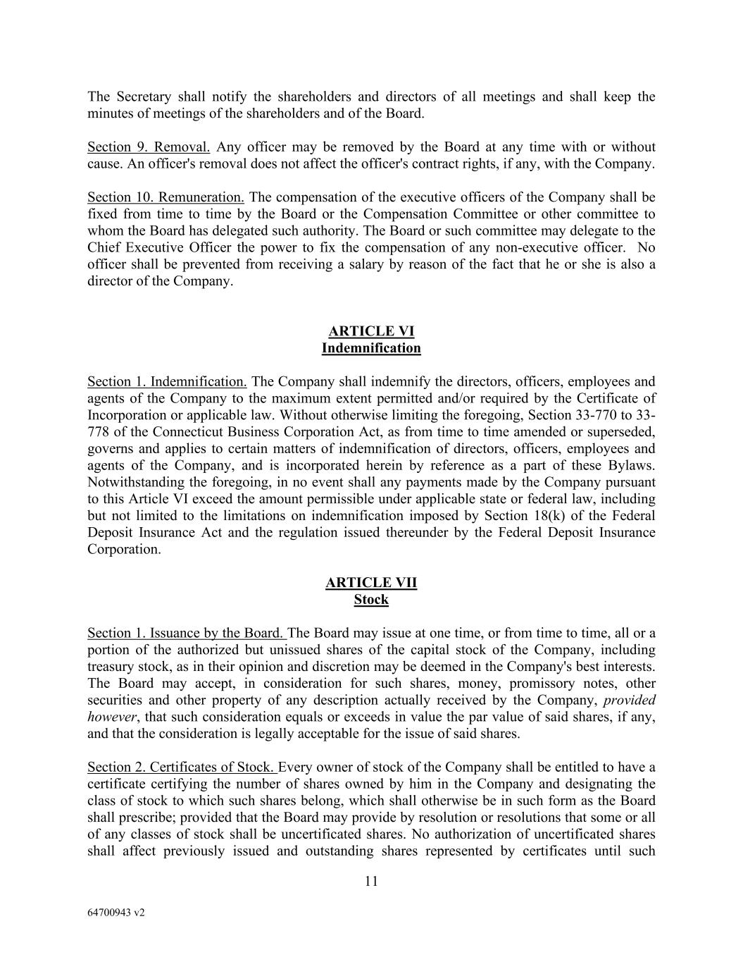 11 64700943 v2 The Secretary shall notify the shareholders and directors of all meetings and shall keep the minutes of meetings of the shareholders and of the Board. Section 9. Removal. Any officer may be removed by the Board at any time with or without cause. An officer's removal does not affect the officer's contract rights, if any, with the Company. Section 10. Remuneration. The compensation of the executive officers of the Company shall be fixed from time to time by the Board or the Compensation Committee or other committee to whom the Board has delegated such authority. The Board or such committee may delegate to the Chief Executive Officer the power to fix the compensation of any non-executive officer. No officer shall be prevented from receiving a salary by reason of the fact that he or she is also a director of the Company. ARTICLE VI Indemnification Section 1. Indemnification. The Company shall indemnify the directors, officers, employees and agents of the Company to the maximum extent permitted and/or required by the Certificate of Incorporation or applicable law. Without otherwise limiting the foregoing, Section 33-770 to 33- 778 of the Connecticut Business Corporation Act, as from time to time amended or superseded, governs and applies to certain matters of indemnification of directors, officers, employees and agents of the Company, and is incorporated herein by reference as a part of these Bylaws. Notwithstanding the foregoing, in no event shall any payments made by the Company pursuant to this Article VI exceed the amount permissible under applicable state or federal law, including but not limited to the limitations on indemnification imposed by Section 18(k) of the Federal Deposit Insurance Act and the regulation issued thereunder by the Federal Deposit Insurance Corporation. ARTICLE VII Stock Section 1. Issuance by the Board. The Board may issue at one time, or from time to time, all or a portion of the authorized but unissued shares of the capital stock of the Company, including treasury stock, as in their opinion and discretion may be deemed in the Company's best interests. The Board may accept, in consideration for such shares, money, promissory notes, other securities and other property of any description actually received by the Company, provided however, that such consideration equals or exceeds in value the par value of said shares, if any, and that the consideration is legally acceptable for the issue of said shares. Section 2. Certificates of Stock. Every owner of stock of the Company shall be entitled to have a certificate certifying the number of shares owned by him in the Company and designating the class of stock to which such shares belong, which shall otherwise be in such form as the Board shall prescribe; provided that the Board may provide by resolution or resolutions that some or all of any classes of stock shall be uncertificated shares. No authorization of uncertificated shares shall affect previously issued and outstanding shares represented by certificates until such