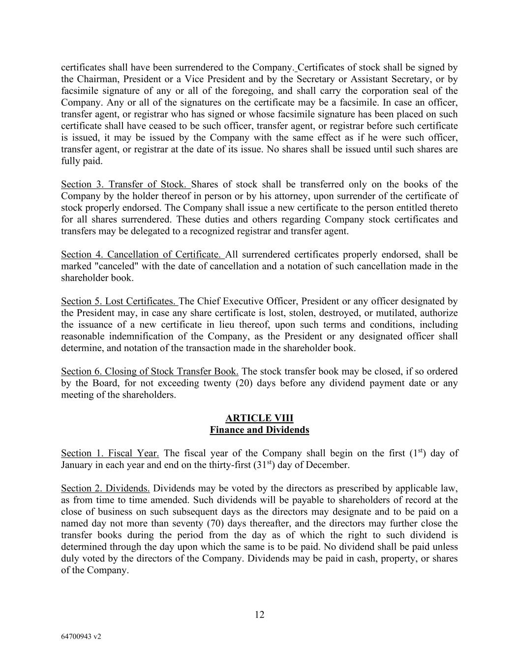 12 64700943 v2 certificates shall have been surrendered to the Company. Certificates of stock shall be signed by the Chairman, President or a Vice President and by the Secretary or Assistant Secretary, or by facsimile signature of any or all of the foregoing, and shall carry the corporation seal of the Company. Any or all of the signatures on the certificate may be a facsimile. In case an officer, transfer agent, or registrar who has signed or whose facsimile signature has been placed on such certificate shall have ceased to be such officer, transfer agent, or registrar before such certificate is issued, it may be issued by the Company with the same effect as if he were such officer, transfer agent, or registrar at the date of its issue. No shares shall be issued until such shares are fully paid. Section 3. Transfer of Stock. Shares of stock shall be transferred only on the books of the Company by the holder thereof in person or by his attorney, upon surrender of the certificate of stock properly endorsed. The Company shall issue a new certificate to the person entitled thereto for all shares surrendered. These duties and others regarding Company stock certificates and transfers may be delegated to a recognized registrar and transfer agent. Section 4. Cancellation of Certificate. All surrendered certificates properly endorsed, shall be marked "canceled" with the date of cancellation and a notation of such cancellation made in the shareholder book. Section 5. Lost Certificates. The Chief Executive Officer, President or any officer designated by the President may, in case any share certificate is lost, stolen, destroyed, or mutilated, authorize the issuance of a new certificate in lieu thereof, upon such terms and conditions, including reasonable indemnification of the Company, as the President or any designated officer shall determine, and notation of the transaction made in the shareholder book. Section 6. Closing of Stock Transfer Book. The stock transfer book may be closed, if so ordered by the Board, for not exceeding twenty (20) days before any dividend payment date or any meeting of the shareholders. ARTICLE VIII Finance and Dividends Section 1. Fiscal Year. The fiscal year of the Company shall begin on the first (1st) day of January in each year and end on the thirty-first (31st) day of December. Section 2. Dividends. Dividends may be voted by the directors as prescribed by applicable law, as from time to time amended. Such dividends will be payable to shareholders of record at the close of business on such subsequent days as the directors may designate and to be paid on a named day not more than seventy (70) days thereafter, and the directors may further close the transfer books during the period from the day as of which the right to such dividend is determined through the day upon which the same is to be paid. No dividend shall be paid unless duly voted by the directors of the Company. Dividends may be paid in cash, property, or shares of the Company.