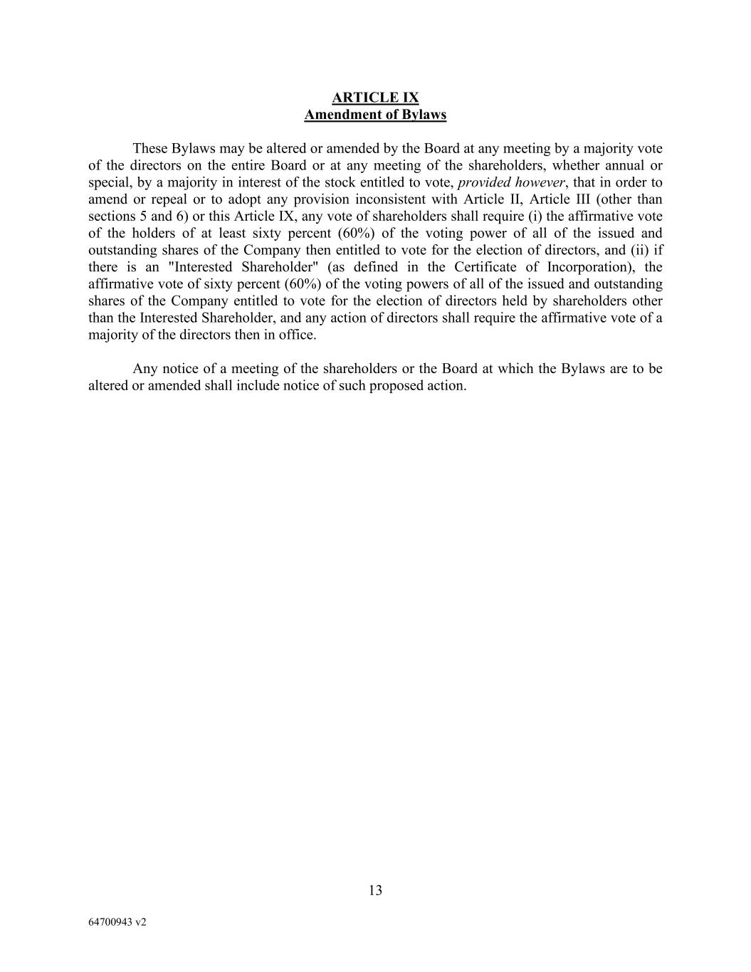13 64700943 v2 ARTICLE IX Amendment of Bylaws These Bylaws may be altered or amended by the Board at any meeting by a majority vote of the directors on the entire Board or at any meeting of the shareholders, whether annual or special, by a majority in interest of the stock entitled to vote, provided however, that in order to amend or repeal or to adopt any provision inconsistent with Article II, Article III (other than sections 5 and 6) or this Article IX, any vote of shareholders shall require (i) the affirmative vote of the holders of at least sixty percent (60%) of the voting power of all of the issued and outstanding shares of the Company then entitled to vote for the election of directors, and (ii) if there is an "Interested Shareholder" (as defined in the Certificate of Incorporation), the affirmative vote of sixty percent (60%) of the voting powers of all of the issued and outstanding shares of the Company entitled to vote for the election of directors held by shareholders other than the Interested Shareholder, and any action of directors shall require the affirmative vote of a majority of the directors then in office. Any notice of a meeting of the shareholders or the Board at which the Bylaws are to be altered or amended shall include notice of such proposed action.