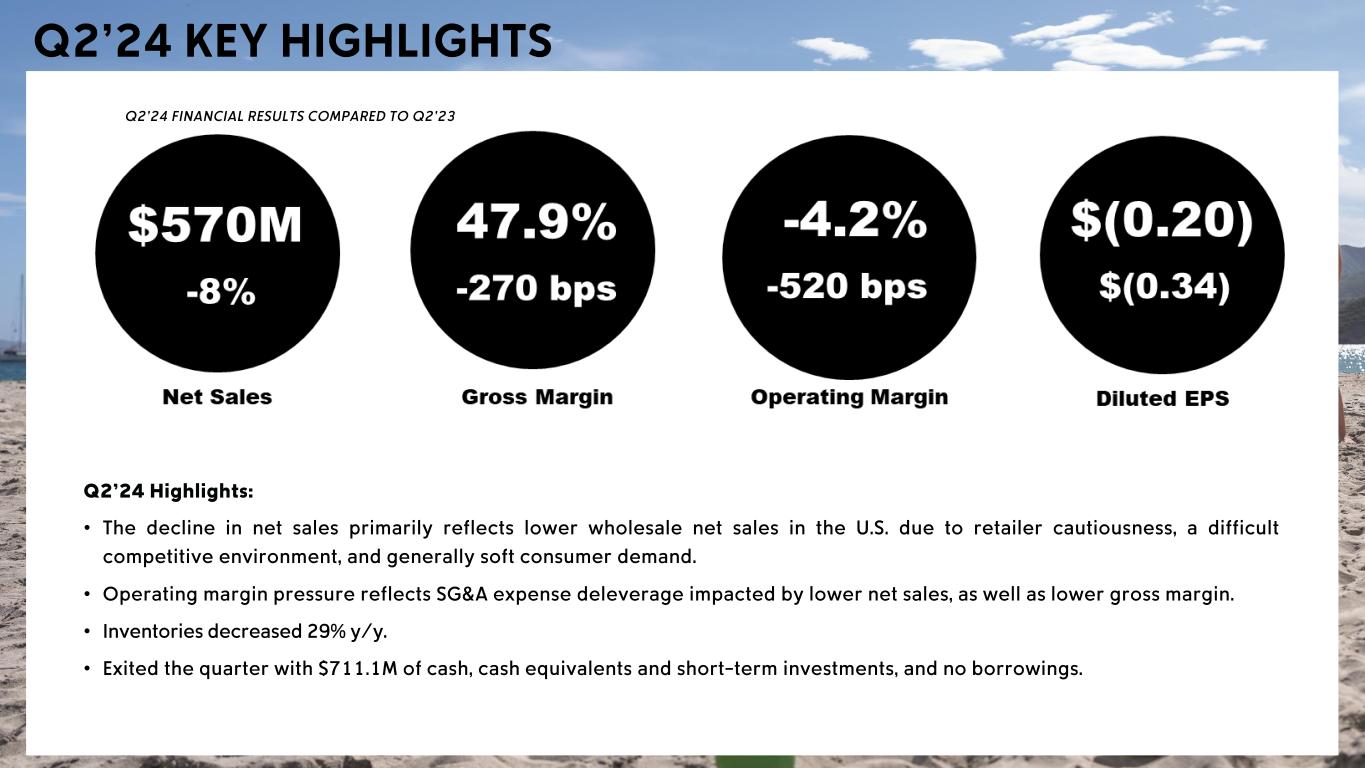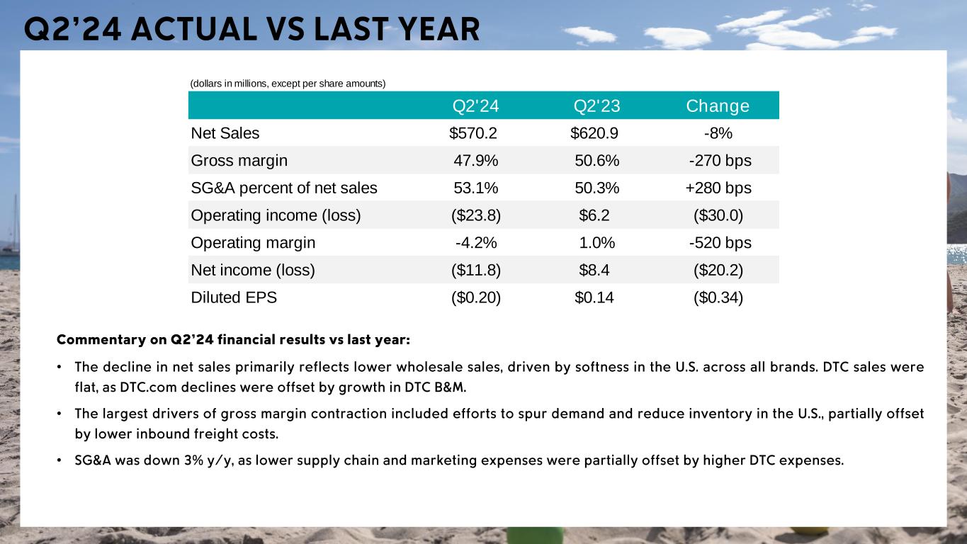 • • • (dollars in millions, except per share amounts) Q2'24 Q2'23 Change Net Sales $570.2 $620.9 -8% Gross margin 47.9% 50.6% -270 bps SG&A percent of net sales 53.1% 50.3% +280 bps Operating income (loss) ($23.8) $6.2 ($30.0) Operating margin -4.2% 1.0% -520 bps Net income (loss) ($11.8) $8.4 ($20.2) Diluted EPS ($0.20) $0.14 ($0.34)